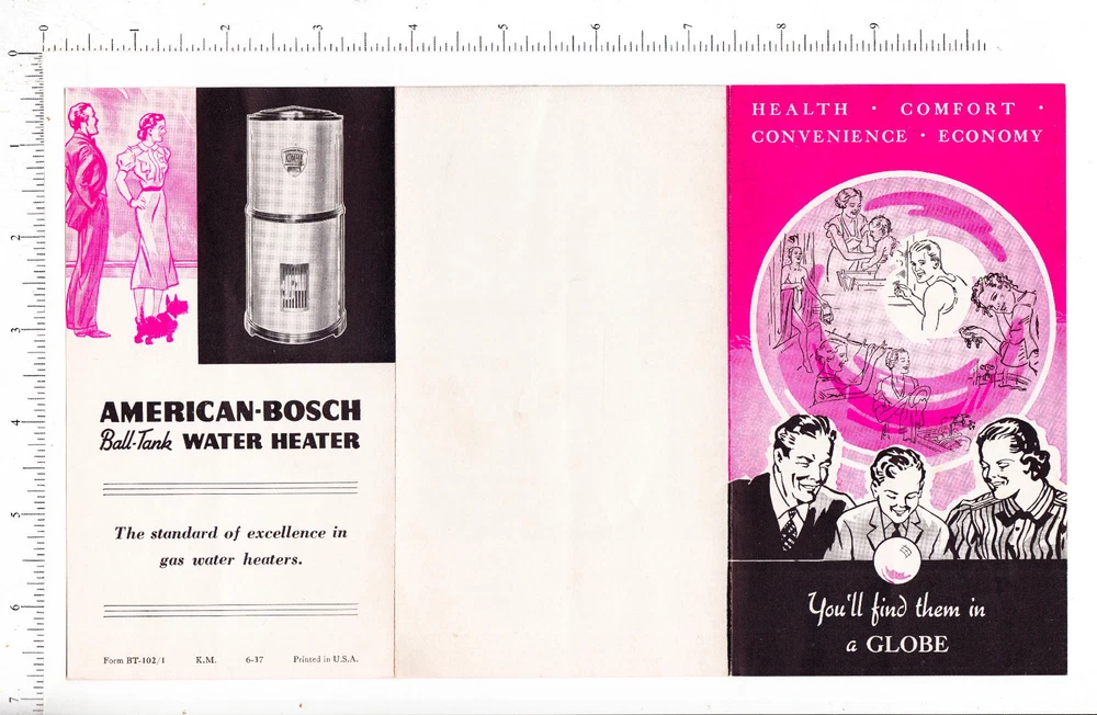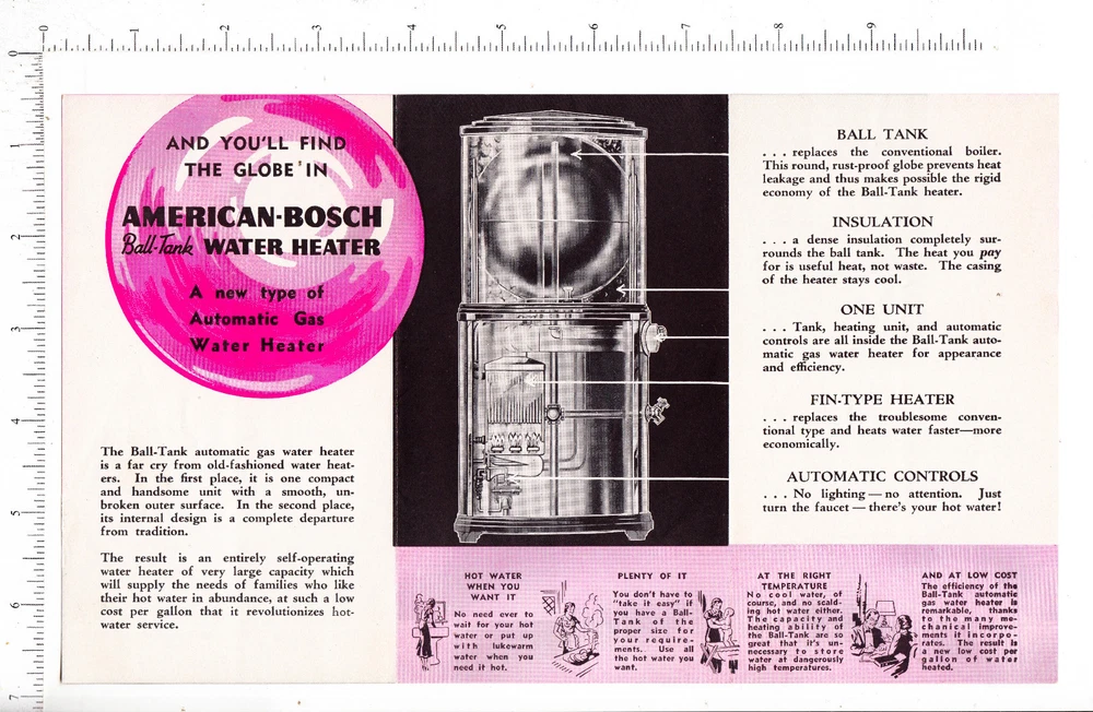 6224 American Bosch Water Heater c 1937 flier Springfield, MA automatic gas Excellent condition. Sharp & clean. Images in this flier portray the "perfect American life". Everyone imaged is smiling whether taking a shower, shaving, washing the dishes, hanging the wash, or walking the family dog. Happy, happy, happy. Be a consumer and create your perfect life through home product ownership. All items original to period - No reproductions are sold in my store. This piece being offered is one in the same with this scanned image. No stock images are used. For more ephemera relating to stove & heater kitchen appliance bathroom appliance euphoric consumerism Springfield, Massachusetts American studies biography genealogy family history or ephemera in general, go to my eBay store: http://stores.ebay.com/Kit-Barry-Ephemera-Vintage-Paper Usually every day I add new listings to my eBay Store & Auction. Satisfaction guaranteed w/ return privilege for all items sold.