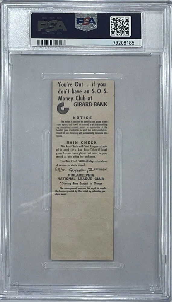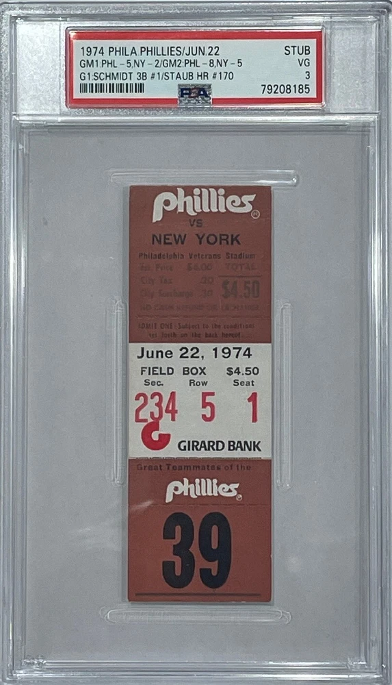 6-22-1974 Phillies ticket stub Hall of Famer Mike Schmidt hits his first Triple of his hall of fame career ! Ticket has been graded PSA VG - 3 10.00 priority shipping to anywhere in Continental U.S.