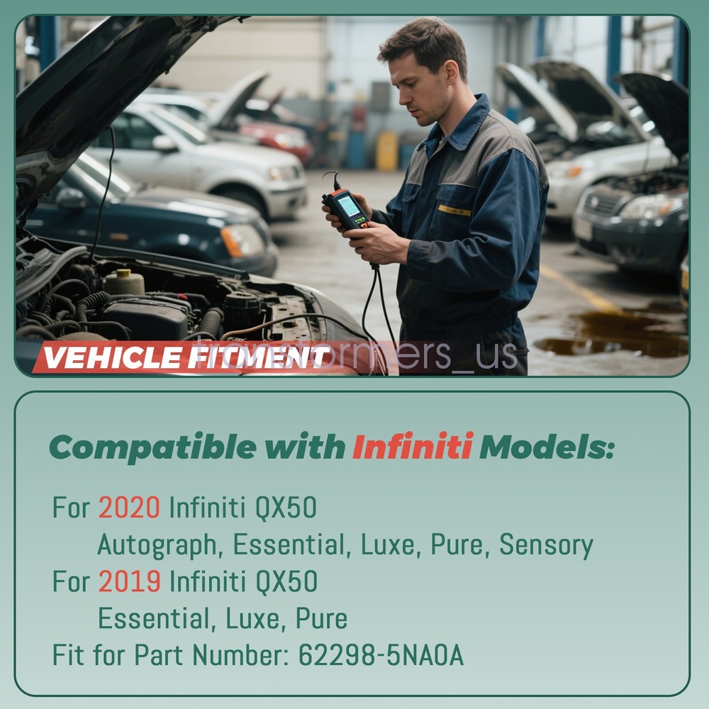 Fit For: For Infiniti QX50 Features: Easy Installation Quantity.: Sold Individually Please note: Not include Installation Instructions gtin13: Does not apply Fitment Type: Direct Replacement Note: Professional Installation Is Highly Recommended OE Number: 622985NA0A Year: 2021 2022 2023 Brand: Soillar Manufacturer Warranty: 3-years unlimited-mileage warranty Manufacturer Part Number: 622985NA0A Placement on Vehicle: Front OE/OEM Part Number: 622985NA0A UPC: Does not apply Country of Origin: China Color/Finish: Black