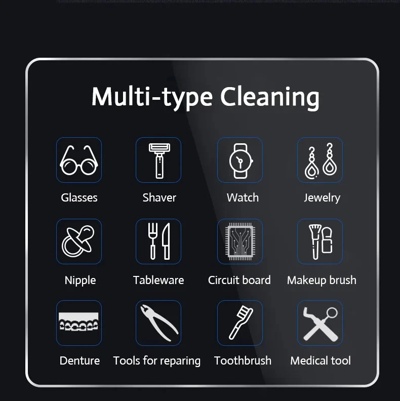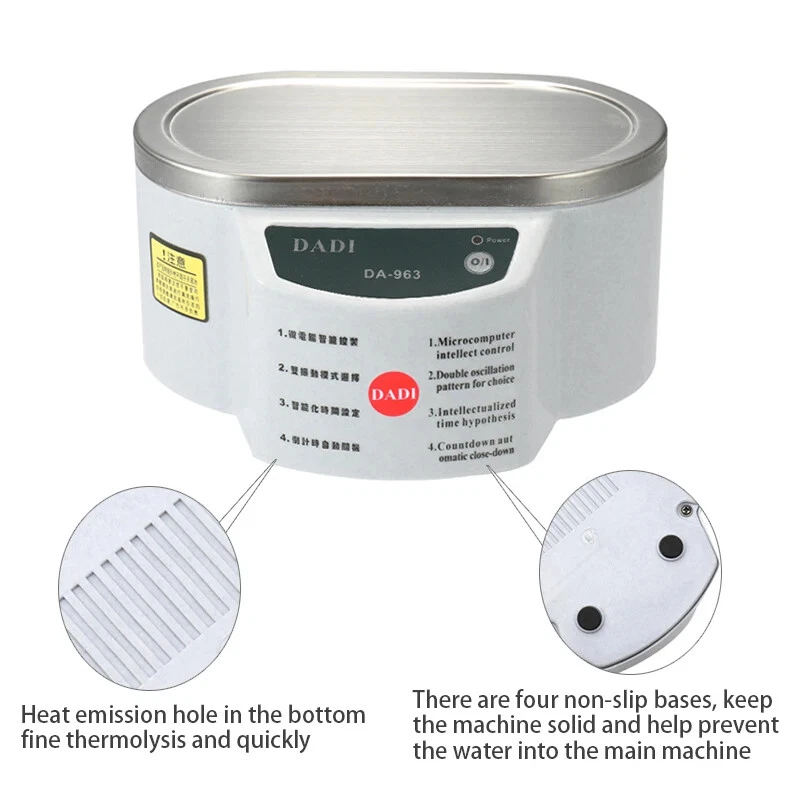 1.Please Remove The Protective Film Before Use Features: - Simple button, easy to operate, 30W/50W or 30W, washing time approx 5 min. - It can remove dirt and grime effectively, even the part normally require tedious manual cleaning by hand, and even the part we can not reached. - With good cleaning effect and will not hurt any surface. - Perfect for cleaning and sterilizing fruits, vegetables, glasses, shaver heads, dentures, watches, jewelry, camera lenses, circuit board, electronic components, surgical instruments and so on. - It also can be used to mixed drink, mix different chemical reagents. - Equipped with one stainless steel cover, prevent inside liquid overflow, very convenient. - There are four non-slip bases, keep the machine solid and help prevent the water into the main machine. - Heat emission hole in the bottom, fine thermolysis and quickly. Note: Please dry the water and place it after use to avoid rust! Specifications: Power: 30W Plug: EU plug(220V),US plug(110V) Inside can capacity: 628ml Working frequency : 40KHz Can size: 168 * 42 * 89mm Item size: 190 * 145 * 93mm Item weight: 600g Package weight: 730g Package size: 215 * 170 * 130mm Power: 30W and 50W(optional) Plug: EU plug(220V),US plug(110V) Inside can capacity: 635ml Working frequency : 40KHz Can size: 160 * 80 * 42mm Item size: 182 * 105 * 100mm Item weight: 600g Package weight: 730g Package size: 215 * 170 * 130mm Package list: 1 * Digital Ultrasonic Cleaner 1 * Cover 1 * Manual Note: - If you did not receive your order in time, please use AliExpress to contact me, I will provide you with effective solutions.Thanks for your understandings. - Because the time difference between countries, if sales person is not online,she will reply your email within 5-10 hours.