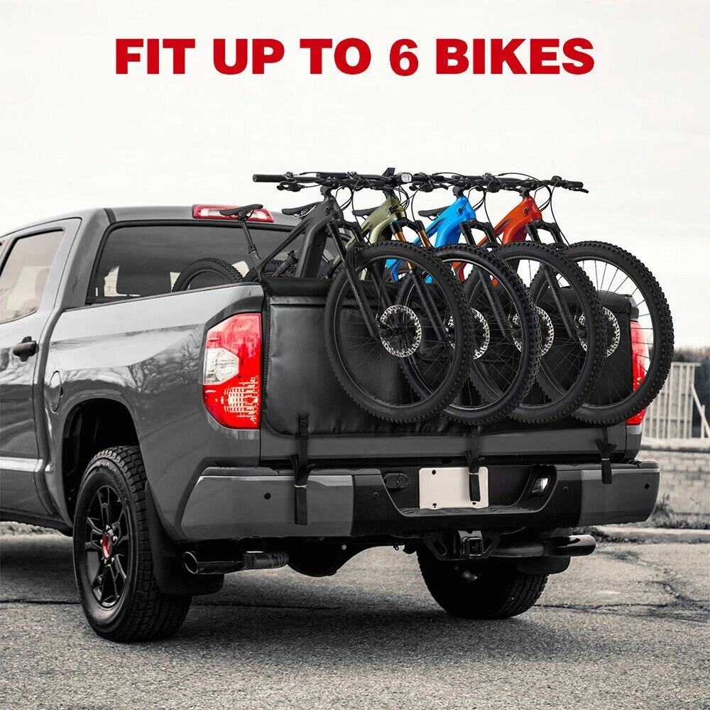 Description: Easily convert the tailgate of most small to mid size trucks into a working 6 bike rack. Protects bikes and trucks for quick transport. Access flap to reach tailgate release handle. Works with most all bikes. Features: Carries up to 6 bikes Designed for mountain bikes but works with most bike styles Includes straps for securing to tailgate Access flap allows access to tailgate release while pad is attached Uses less space in truck bed than other carriers - leaves more room for other gear, protect bikes and truck tailgate paint Compatible with most trucks Extra padding where it counts Least expensive way to carry 6 bikes Also protects truck when hauling surfboards, kayaks, construction supplies, and more Specifications: Condition: New with high quality Size: Big 61.4'' Color: Black Material: PVC Tarp (waterproof), foam padding Package Included: 1x Tailgate Shuttle Pad