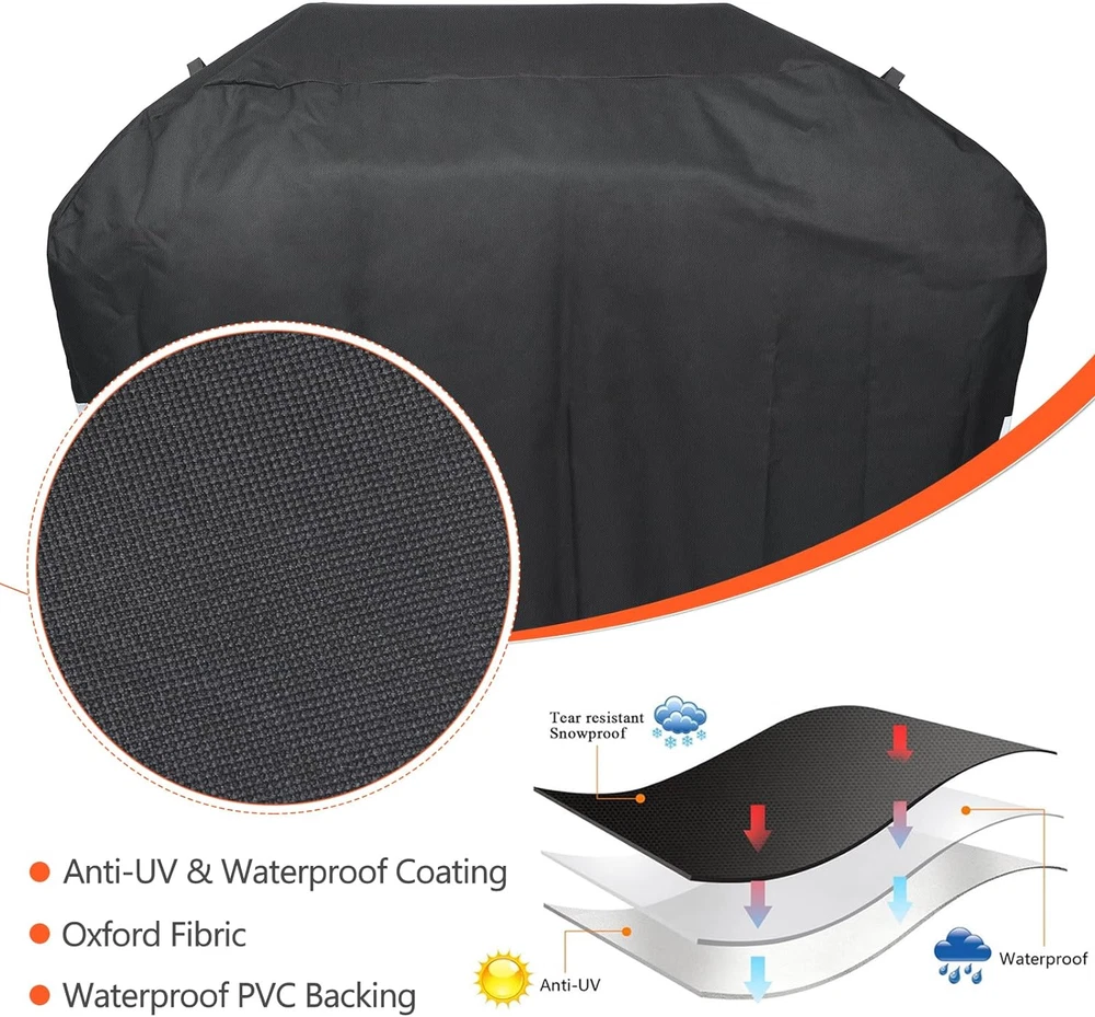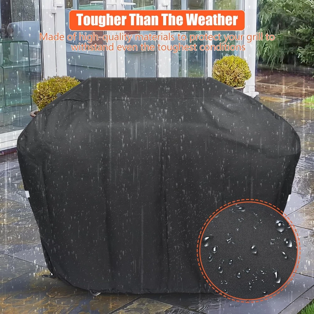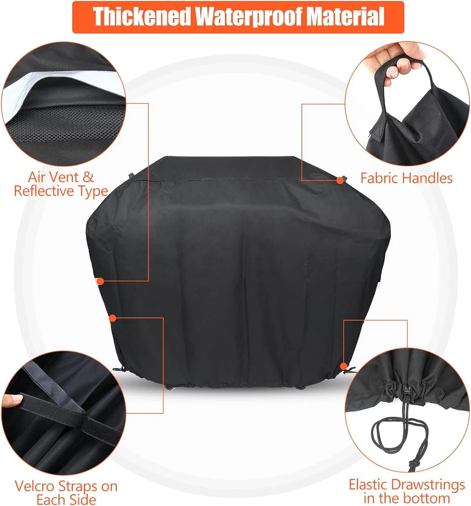 Material: Polyurethane Type: Grill Cover Color: black Brand: Searglow Compatibility: for Weber Genesis 300 Series, Genesis E-325s S-325s EX-325s SX-325s E-335, S-335 EX-335 SX-335 EPX-335, Genesis II, and Genesis II LX 300 series grills, Also works for grills with similar sizes up to 61"W, such as Char-Broil, Nexgrill, Napoleon, Broil King Size: 63W*43.4H*25.6D inch Closure Type: Drawstring