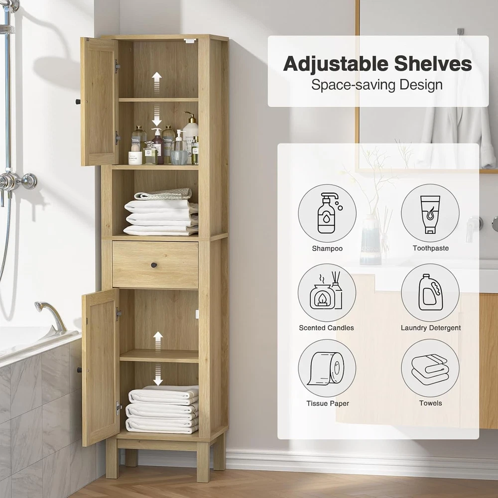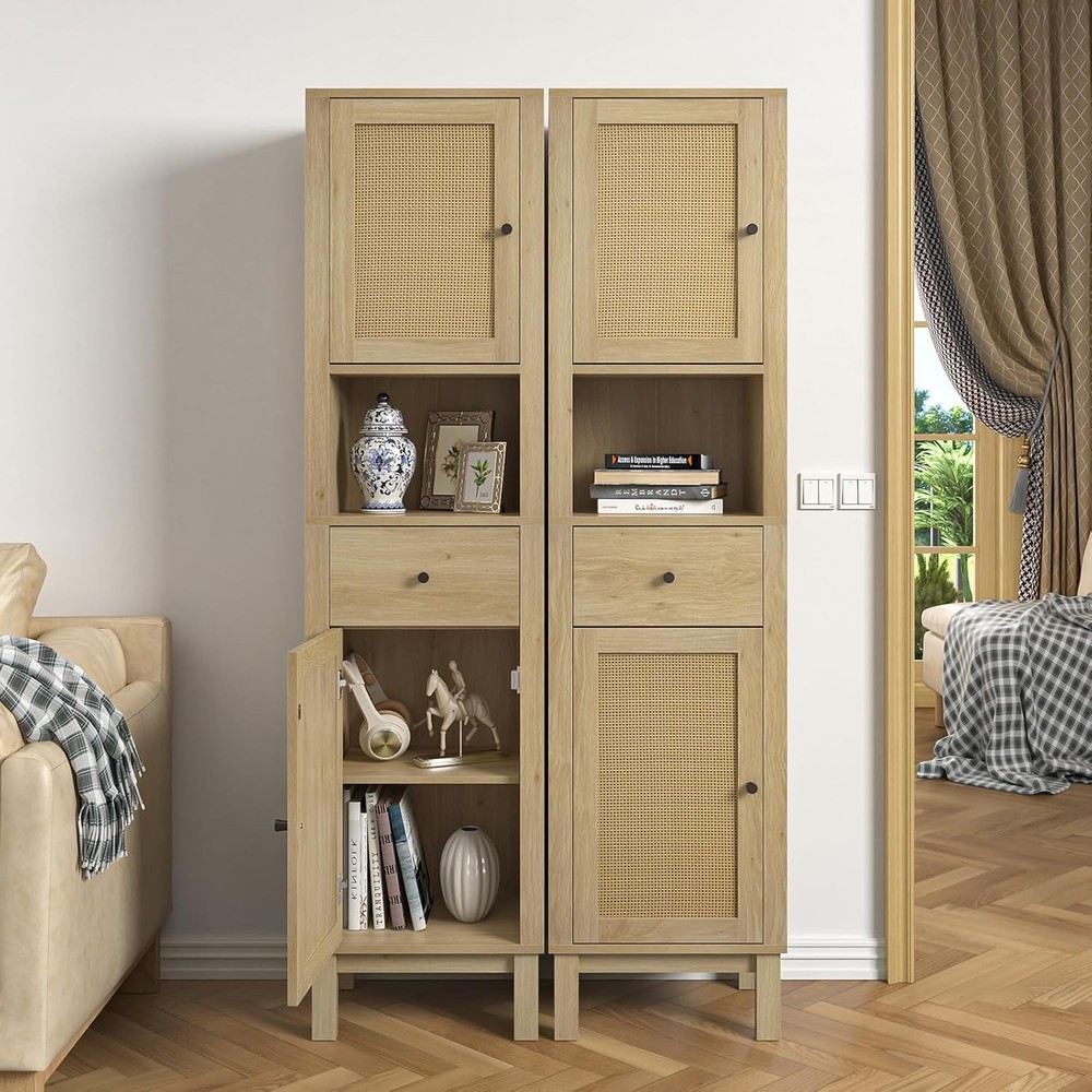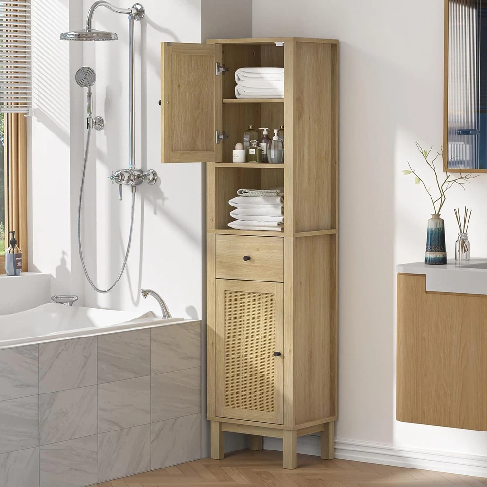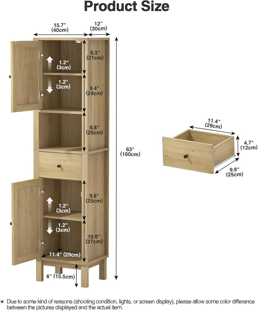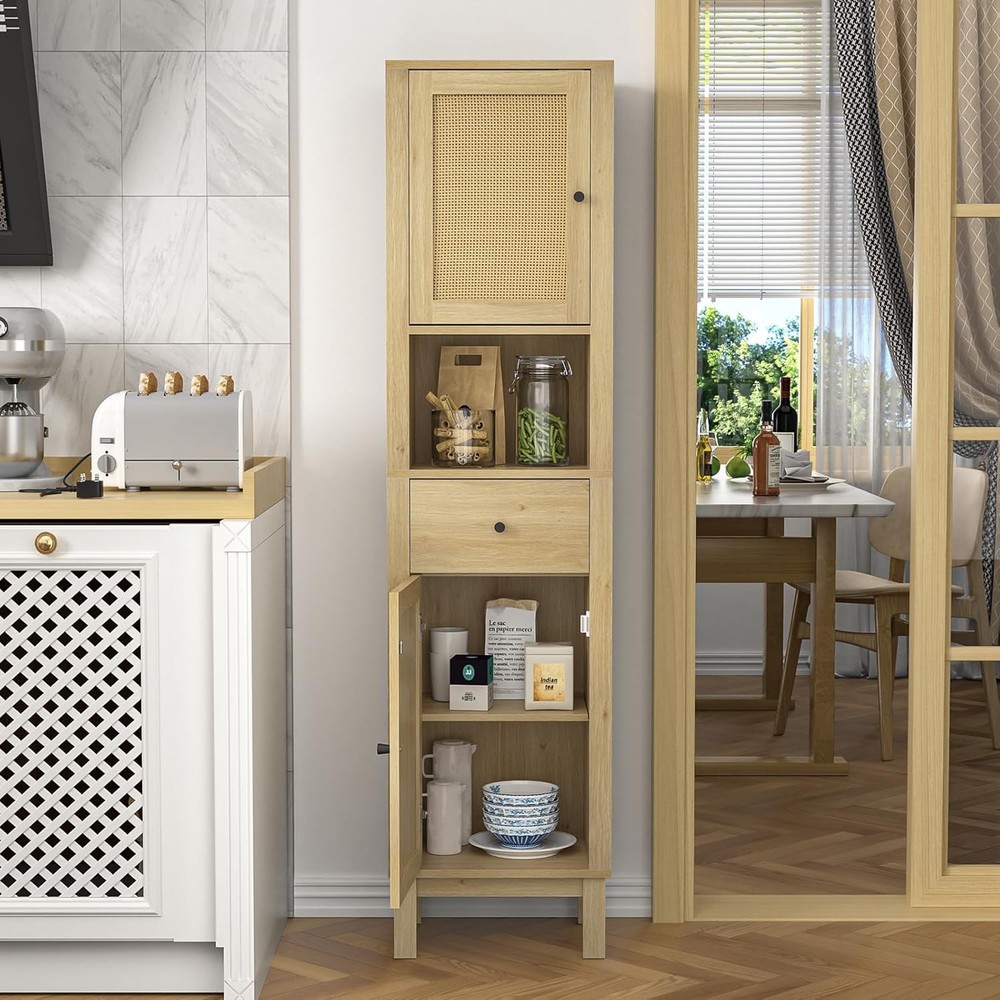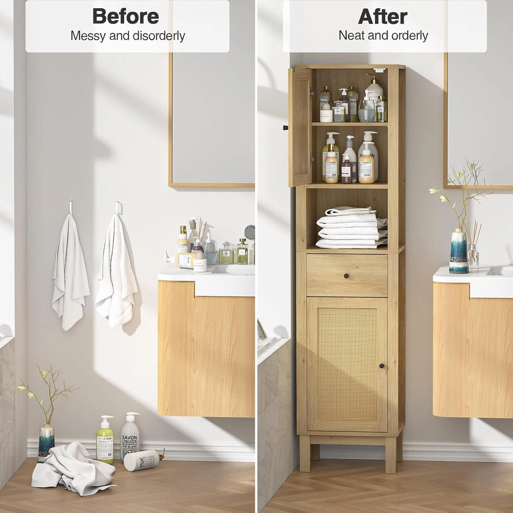 Product Description About this item Distinctive Style: This natural rattan bathroom storage cabinet creates a bohemian vibe with the charm of mid-century modern design. Add a touch of nature to your home to create a calm, cozy atmosphere. The simple elegance of this tall storage cabinet blends easily with a variety of furniture and decor styles. Flexible Storage Space: This bathroom storage cabinet include 1 drawer, 1 open space,2 door cabinet, 2 adjuatable shelves.Its ample storage space and compact design make it a perfect fit for any room—whether in the bathroom, kitchen, dining room, or living room. Keep your space neat and organized with ease. Sturdiness: Made of high-quality engineered wood, this tall rattan storage cabinet features durable solid wood legs for both style and stability. The base provides ample space for easy cleaning. The top is equipped with an anti-tip device to ensure maximum safety and stability. Perfect for Small Spaces: this narrow yet tall cabinet offers tons of storage yet takes up little space, perfect for small areas in your bathroom or any other tight corners in your home Assemble: This tall storage cabinet is designed to be need to assemble and comes with detailed instructions and tools. Overall dimensions: 11.8"L x 15.7"W x 62.99"H. If you have any questions, please contact us in time and we will solve all problems for you Previous page Next page Additional Drawers Store and hide your small belonging items Adjustable shelf You can freely adjust the shelves according to the height of your items to meet your different storage needs Magnetic door High quality magnetic door catch prevents the door from swinging back and forth after closing Oval handle Oval handles help you open doors and drawers more easily