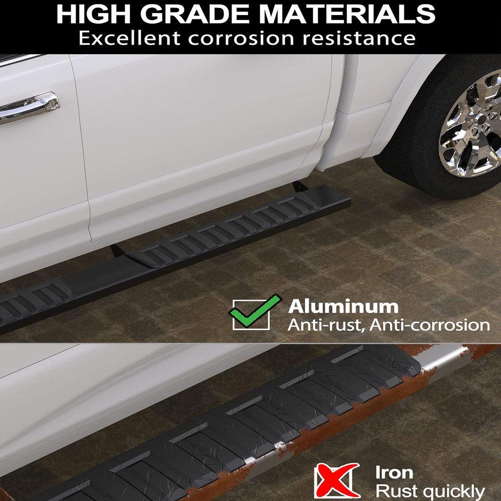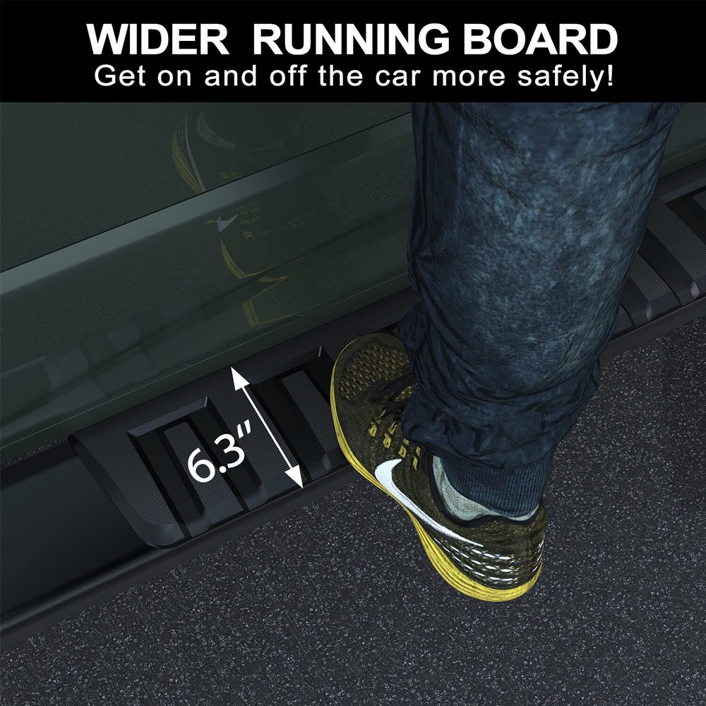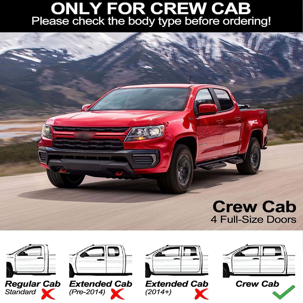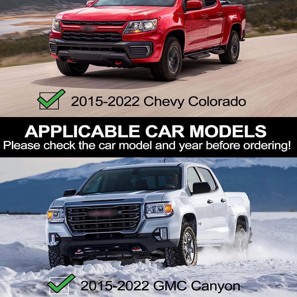 6.3'' Running Boards for 15-24 Chevy Colorado GMC Canyon Crew Cab Side Steps New [Factory Fitment] Only for Crew Cab(4 Full-Size Doors). Compatible with 2015-2022 Chevy Colorado/GMC Canyon. [Quick and Easy Setup] Complete installation in 10 minutes solo. [Heavy-duty Material] Constructed from heavy-duty Aluminum Alloy, making them both durable(400 lbs weight capacity) and never rust. [Wider Board] 6.3" wide board, combined with ABS plastic textured surface, providing a secure grip even in wet or slippery conditions. [Professional Customization] Designed specifically for Chevy Colorado/GMC Canyon, provide a secure and convenient step, making it easier to enter and exit your truck. 400 LBS Weight Bearing Designed to fit your truck, this running board features durable, heavy-duty construction made from high-quality stainless steel, which makes a weight bearing of 400 lbs. Non-slip Textured Surface The non-slip textured surface provides a secure grip, even in wet or slippery conditions, and the boards are finished with a black powder coating for added durability and a stylish look. Brand Unbranded Type Running Board Color Black Placement on Vehicle Left, Right Shape Rectangular Features Non-slip, Antirust Manufacturer Part Number Does not apply OE/OEM Part Number Does not apply Material ABS, Aluminum Number of Pieces 2