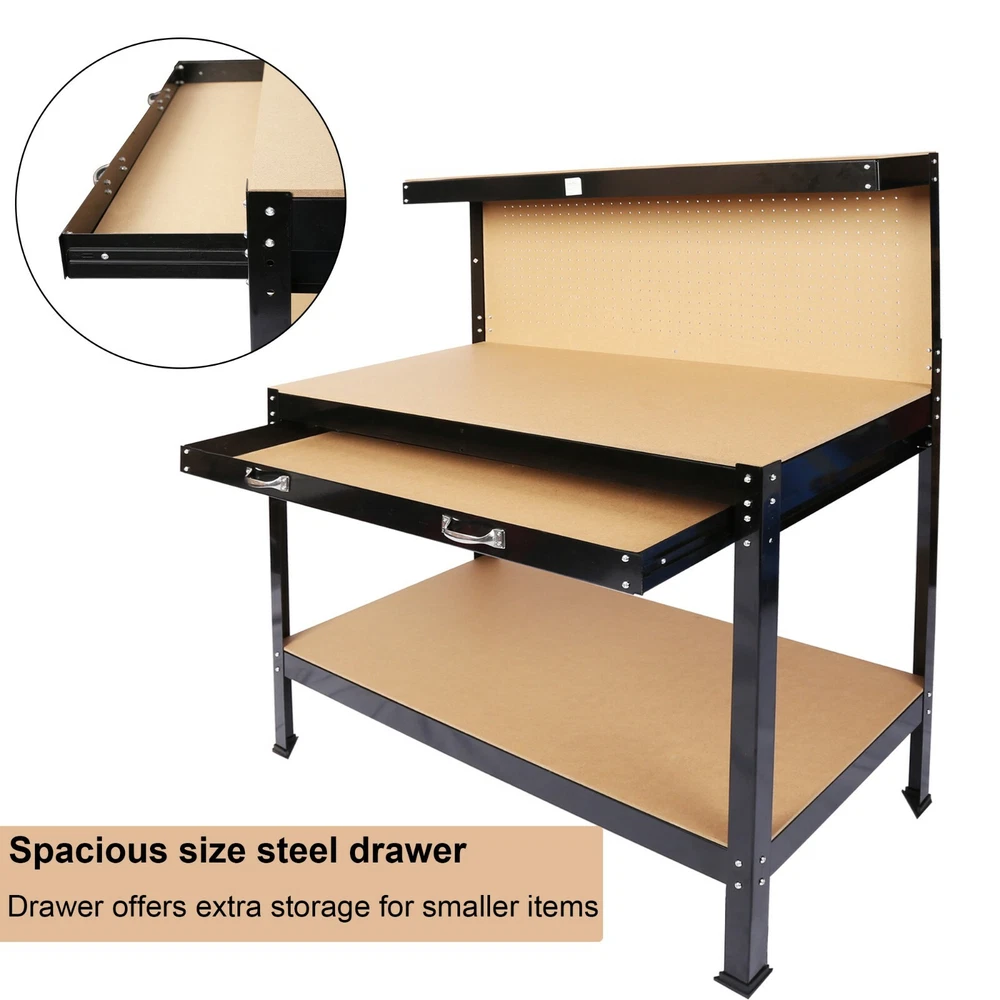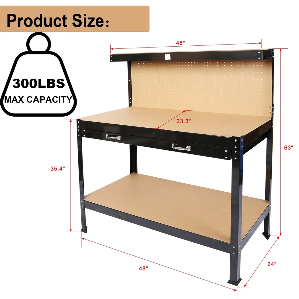 63" Workshop Table Work Bench Garage Steel Tool Storage Drawers Shelves Work Bench Delivery time: immediate Product Features: Brand new and high quality Ideal for business or personal use Solid steel frame and durable MDF construction Includes back peg board for organizing tools Drawer offers extra storage for smaller items Bottom shelf for storing large and heavy tools Assembly needed with assembly instruction Size: 64" (H) x 48" (W) x 24" (D) Color: Black Description Delivery Returns Description: ★ Durable and 300Lbs Carrying Capacity---Made of solid steel frame and heavy duty MDF panel, high quality craftsmanship and strict quality control are used in the manufacturing process to ensure that each workbench is sturdy and stable enough to hold up to hard use in the workshop. The work surface can handle the heavy load of tool storage, holds up to 300 lbs. • ★ Perfect Workbench---Features comfortable height for work while seated or standing; MDF worktop provides ample space for a multitude of operations and tool solution. • ★ Smart Tool Storage---A peg board with hooks are ideal for hanging small tools, easy to take on and off. And a drawer with 2 handles is designed for more tools storage. • ★ Waterproofing and Rust Prevention---Powder-coated finish makes it resistant to water and rust, as well as the non-slip rubber feet adds stability and do not scratch your floor. • ★ Simple Assembly & Recommended Use---Assembly needed with assembly instruction (step by step diagrams and all necessary hardware include), this workshop and garage essential workbench is ideal for commercial, home, garage or office use. Specification: Material: steel and MDF panel Overall dimension 64" (H) x 48" (W) x 24" (D) Max weight capacity: 300lbs Package include: 1 x black working bench Please refer to the picture to get more size information We strive to deliver products within 2-3 days (Mon - Friday 9am - 6.00pm) after payment has been received. We use the best couriers available to us to ensure that your product is received on time and in great condition. Please ensure that someone is available to sign for the item as signatures are required. No Delivery Zones Due to geographical and logistical restrictions, we are sorry to let you know that we are not able to deliver our products to areas listed below. Excludes: Alaska/Hawaii, APO/FPO, US Protectorates, Africa, Central America and Caribbean, Middle East, South America, Brunei Darussalam, Cambodia, Hong Kong, Indonesia, Laos, Macau, Malaysia, Philippines, Taiwan, Thailand, Vietnam, Bermuda, Greenland, Mexico, Saint Pierre and Miquelon, American Samoa, Cook Islands, Fiji, French Polynesia, Guam, Kiribati, Marshall Islands, Micronesia, Nauru, New Caledonia, Niue, Palau, Papua New Guinea, Solomon Islands, Tonga, Tuvalu, Vanuatu, Wallis and Futuna, Western Samoa, Afghanistan, Armenia, Azerbaijan Republic, Bangladesh, Bhutan, China, Georgia, India, Kazakhstan, Kyrgyzstan, Maldives, Mongolia, Nepal, Pakistan, Russian Federation, Sri Lanka, Tajikistan, Turkmenistan, Uzbekistan, Albania, Andorra, Belarus, Bosnia and Herzegovina, Bulgaria, Croatia, Republic of, Cyprus, Czech Republic, Estonia, Finland, Gibraltar, Greece, Guernsey, Iceland, Jersey, Liechtenstein, Macedonia, Malta, Moldova, Monaco, Montenegro, Norway, Poland, Romania, San Marino, Serbia, Slovakia, Slovenia, Svalbard and Jan Mayen, Switzerland, Ukraine, Vatican City State, PO Box, Angola, Cameroon, Cayman Islands, Libya, Suriname, Guyana, Panama, Mauritius, Chad, Madagascar, Bahamas, Iran, Saint Kitts-Nevis, Western Sahara, Bolivia, Congo, Republic of the, Seychelles, Sudan, Guadeloupe, Venezuela, Somalia, Burma, Cuba, Republic of, Reunion, Yemen, Barbados, Belize, Liberia, Sierra Leone, Central African Republic, Martinique, Dominica, Niger, French Guiana, Saudi Arabia, Nicaragua, Anguilla, Antigua and Barbuda, British Virgin Islands, Cape Verde Islands, Honduras, Saint Vincent and the Grenadines, Turks and Caicos Islands, Botswana, Eritrea, Swaziland, Lesotho. In the unlikely event that your item is lost or damaged in transit, please do not worry. Your item is sent on a fully insured service and we will offer you a full refund or replacement item and will deal with any issue fast! Proof of postage and delivery is available on all purchases. Should your item arrive damaged (damage to the item, not to the packaging) we ask that you do not sign for the item and instead insist that the item is returned to us. Should this be the case please contact us immediately. If you are unsure if the item has arrived damaged, please simply sign for the item as damaged and then inspect the contents of the package when able to do so. Should you wish to return your item for any other reason please contact us to discuss the return process. You must first obtain written consent from us whereby we will supply you with with further details including a return code. All returns must be received within 30 days of purchase. Support Mail support within 24-48 hours If you are collecting the goods yourself, please give us a short notice beforehand. SHIPPING US: FREE PAYMENT Payment should be completed within 7 days after buyer places the order,or else an unpaid case will be opened in order to cancel the transaction. If you can not pay in time, please contact us. ContaCT If you have any comments, good, bad or indifferent we would love to hear from you. Thanaddo 2012
