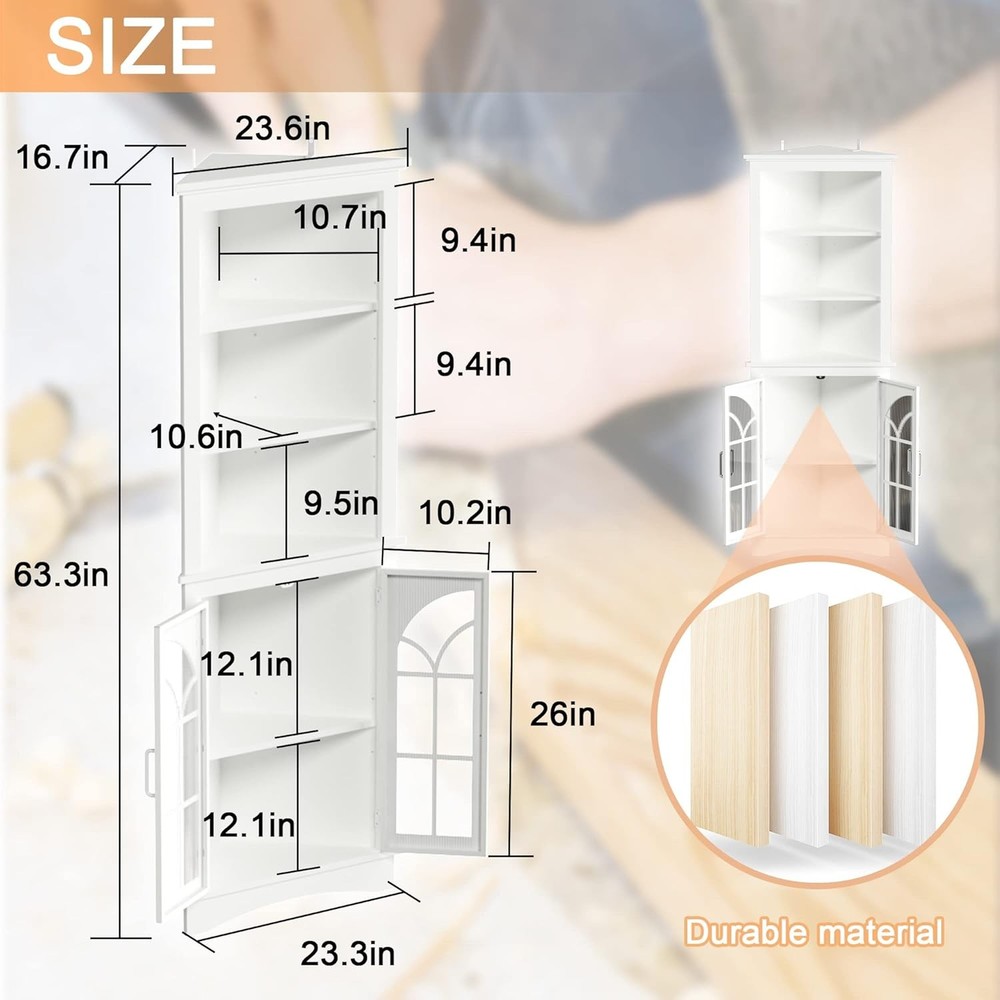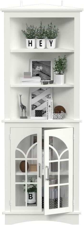 Product Description Features: corner cabinet maximizes the expanded storage space. Tall corner cabinet with 3-tier open shelves & 1 adjustable board inside door freely storage for displays, necessaries, and sundries. 90° right angle in the rear of the storage cabinet fits well with the wall. More and more people chose it as a corner storage shelf for the bathroom, living room, bedroom, and hallway. Constructed of environmentally durable MDF to storage cabinet with a long life span. Adding 2 anti-tipping secure bands behind the storage cabinet guarantee safety and stability. The elegant appearance, antiqued glass cabinets, and clean lines show rustic features. Besides this, the tall cabinet is changeable for various styles, bookcases/storage cabinets/display shelves/buffet cupboards. About this item corner cabinet maximizes the expanded storage space. Tall corner cabinet with 3-tier open shelves & 1 adjustable board inside door freely storage for displays, necessaries, and sundries. 90° right angle in the rear of the storage cabinet fits well with the wall. More and more people chose it as a corner storage shelf for the bathroom, living room, bedroom, and hallway. Constructed of environmentally durable MDF to storage cabinet with a long life span. Adding 2 anti-tipping secure bands behind the storage cabinet guarantee safety and stability. The elegant appearance, antiqued glass cabinets, and clean lines show rustic features. Besides this, the tall cabinet is changeable for various styles, bookcases/storage cabinets/display shelves/buffet cupboards. On Aug 17, 2025 at 19:21:22 PDT, seller added the following information: