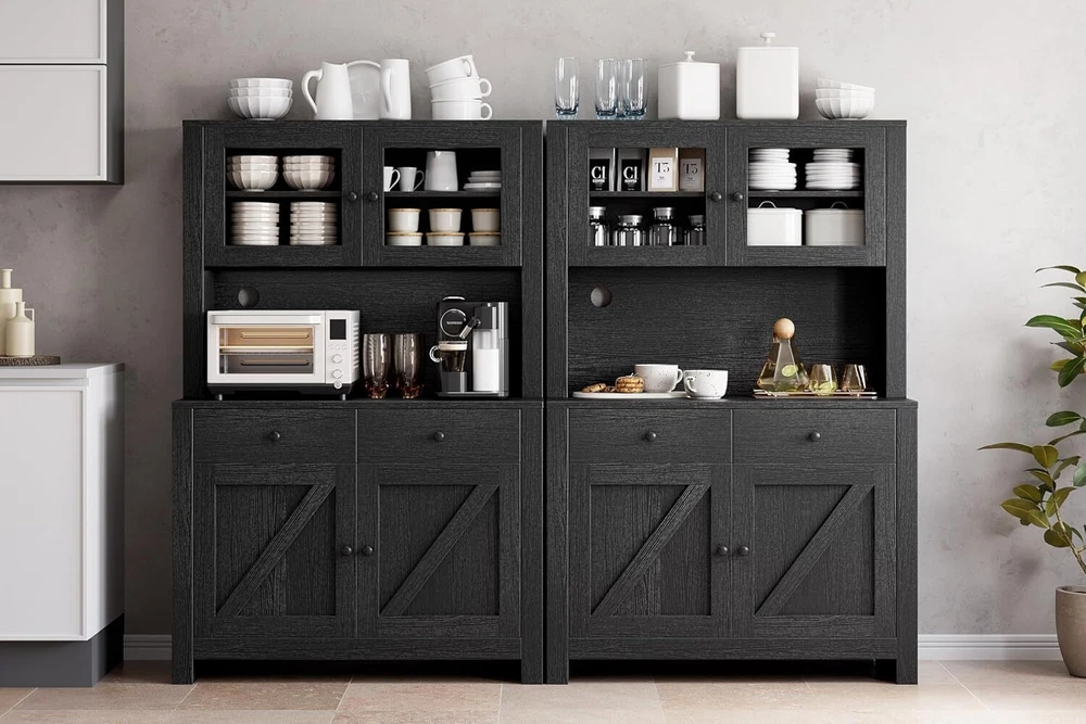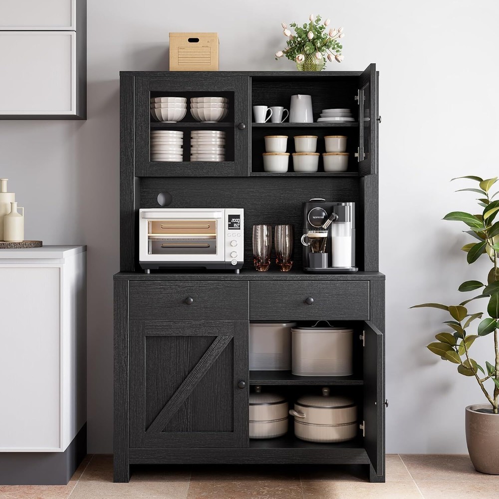 About this item 【Stylish Farmhouse Design】 Designed in a handcrafted look with retro wood paneling and tempered glass doors and this Kitchen pantry cabinet escalates a black metal handle, which blends with the metal decoration on the top, exuding a retro yet stylish unique temperament, it will become the focus of attention no matter where you place it. 【Discover Versatile Pantry Cabinet】 With three adjustable shelves and a spacious countertop, this kitchen hutch provides ample storage space for different kitchen items. 2 Large drawers are very suitable for storing dishes, knives and forks, hollow door handle design makes it easier to take; Inside, there are 3 adjustable shelves that can be adjusted in height according to the size of the items placed. The countertop can hold kitchen appliances like a microwave or coffee maker. 【Stable Durable Pantry】 Crafted from optimal P2 engineered wood and metal, Our storage cabinets feature a well-structured design that is steadfast and wobble-free, able to withstand the challenges of long-term use. The middle and bottom shelves have excellent weight capacity and can confidently support 100 lbs, while the remaining shelves and mid drawer can hold up to 50 lbs each. 【Multifunctional Tall Cabinet】 The size of Kitchen pantry is 41.3''W x 63.4''H x 17.3''D. Crafted with user comfort in focus, its height harmoniously aligns with the average adult's convenience for effortless accessibility. 【Practical Design】 Each door of the metal pantry cabinet comes with 2 hinges to ensure smooth operation and overall stability; Magnetic door locks make opening and closing the door easier; The included wall anchor kit prevents tipping for safety. 【Buy with Confidence】 All parts and components of the laundry room cabinetsare neatly arranged and labeled, which can help you assemble it quickly. The model of this Storage Cabinet offers ①7- day resend or return on quality problems or logistics damage; ② Lifetime accessories. If you encounter any problems during the installation process, please contact us and we will do our best to solve it for you. Product Description Large Kitchen Hutch Shelf Keep frequently used kitchen appliance & seasonings within easy reach Reserve Holes Convenient for electrical appliances to be connected to the power supply, thoughtful consideration 2 Easy-Glide Handy Drawers Keeps your cutlery, napkin, and all other odds and ends close to hand Mutiple storage Options Satisfies all your storage needs by offering both concealed and open bottom space Payment Delivery details Terms of sales About us Contact us Payment We accept payment either via PayPal or any of the following credit cards; Visa, MasterCard, Discover, and American Express. Delivery details 1. We will delivery out at the handing time when we receive the payment. 2. The delivery time is 3-5 business days to US by usually time.The parcel maybe delay 1-2day of the weekend.Due to the bad weather,Holidays,Hot Season ect.the parcel maybe delay,If you have any problems,mssage us,we will try our best to solve it. 3. We ship to your eBay address. Please make sure your eBay address is correct before you pay. 4. If you want to change the shipping address,message us before our send out. Terms of sales If you are not satisfied with the item for any reason, please do not quick to leave negative/neutral feedback even open request and case without any communication with us. We devote ourselves making EVERY CUSTOMER in 100% Satisfactory and resolve any problem. Thank you for your understanding and recognition,we are always leave positive feedback to all our customers. About Reply: All replies will be sent to your email box, if you do not get response within 24 hours (Sat. & Sun. excluded) please check your eBay My Messages in case that our emails will be filtered automatically by your settings. About us automobilee-01 is a brand new store but we are one of North America’s top online suppliers of specialized, high-quality aftermarket online retailers and suppliers, committed to developing new markets. We primarily offers tool sets, auto parts, home goods, etc..With over 20 years of product selection and manufacturing experience, we delivers unparalleled quality, value, service and satisfaction. Our highly-trained, professional staff offer in-depth knowledge and personalized assistance for customers worldwide. Providing our customers with a simple, hassle-free experience with best-in-class customer service is more than a goal. Contact us Any problem please rest assure to contact us by eBay message first. We will reply you as soon as we can. We will deal with it within 24hs on working days. Brand Unbranded Item Length 41.3 in Item Width 17.3 in Item Height 63.4 in Mounting Free Standing Type Cupboard Color Black MPN Does not apply Assembly Required Yes Room Kitchen Style Modern Material Engineered Wood Number of Drawers 2 Features With Drawers, with Shelves Item Weight 125 Pounds Mounting Type Floor Mount