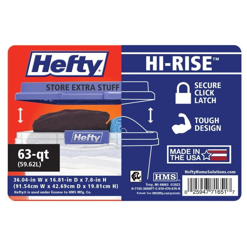 You may also like 17Qt Stackable Storage Bins W/ Lids 8 Pack Durable Plastic Tote Containers New 36.5 USD 38.42 USD Free shipping 5% off Water Resistant Heavy Duty Storage Bin Latching Plastic Dustproof Stackable Tote 32.89 USD 34.62 USD Free shipping 5% off Set of 10 Clear Plastic Storage Boxes Stackable 6 Qt Ideal Closet Organization 16.06 USD 16.9 USD Free shipping 5% off Large Storage Bin W/ Latching Lid Stackable Plastic Storage Container Garage Use 13.12 USD 13.81 USD Free shipping 5% off Modular Stackable Mini Storage Crates Organizers 12-Pack Portable Plastic New 25.8 USD 27.16 USD Free shipping 5% off Plastic Storage Bin W/ Lid 6-Pack Kids Organizing Box Cubby Bookshelf Toys New 44.14 USD 46.46 USD Free shipping 5% off Durable Clear Storage Bin W/ Lid Stackable Container Garage Closet Attic 108 Qt 26.3 USD 27.68 USD Free shipping 5% off Stackable Storage Bins W/ Lids 6 Pack Plastic Containers Home Organization New 31.08 USD 32.72 USD Free shipping 5% off 3 Drawer Clear Plastic Desktop Storage Unit Stackable Organizer Home Office New 16.06 USD 16.9 USD Free shipping 5% off Durable Lockable Storage Box Hunting Gear Camping Supplies Outdoor Equipment New 23.3 USD 24.53 USD Free shipping 5% off Extra Large Wheeled Storage Bin W/ Latch Lid Stackable Totes Home Office Garage 29.19 USD 30.73 USD Free shipping 5% off Stackable Nestable Storage Box W/ Lid Open Handles Organizing Toys Shoes Decor 17.21 USD 18.12 USD Free shipping 5% off Looking for the best storage bins to organize or pack up your home? In search of a durable storage container to stow under-bed or in smaller spaces? Look no further! The HI-RISE, 63 qt clear storage bin is designed to store a variety of household items, including bulky winter blankets and outerwear, sheets & towels, clothing & shoes, seasonal items and accessories. Ready to neatly STACK? ’s HI-RISE patented lid design allows for secure stacking and ABOVE the rim storage, to efficiently save space within your home. A CLEAR view? Identify items quicker and more effectively with the HI-RISE clear storage base. The large, click secure latches allow for secure and comfortable transport. Work to maintain your storage space and organize your household with maximum containment. Store and better protect items to SAVE SPACE and edit your home or business. Check out the complete line of HI-RISE storage bins to help create a clean & uniform storage space! Large secure latches, keep the lid closed tightly Double rimmed base for added strength Crossbar design on lid supports secure stacking Strong plastic storage container Taller, stackable lid allows for extra storage branded You may also like Set of 8 13 Quart Stack & Pull™ Clear Plastic Storage Box, Gray Tool Chest Box 40.95 USD 43.11 USD Free shipping 5% off 12 Inch Oscillating Tabletop Fan 2 Speed Adjustable Airflow Portable Indoor Use 26.12 USD 27.49 USD Free shipping 5% off 95" Faux Silk Single Panel Curtain Back Tab Durable Indoor Machine Washable Hot 28.35 USD 29.84 USD Free shipping 5% off Bean Bag Chair Plush Kids Teens Lightweight Portable Refillable Durable Comfort 47.48 USD 49.98 USD Free shipping 5% off Reversible Ottoman Bench Shoe Storage End of Bed Small Shelf 660lb Capacity New 102.5 USD 107.89 USD Free shipping 5% off Slim Rolling Bathroom Organization Cart W/ 2 Hooks, 3-Shelf Easy Assemble White 25.98 USD 27.35 USD Free shipping 5% off 4-Shelf Plastic Garage Shelving Rack Organizer Storage Shelves Standard Duty US 23.92 USD 25.18 USD Free shipping 5% off Metal Round End Table W/ 2 Shelves Contemporary Accent Table Indoor Storage New 120.74 USD 127.1 USD Free shipping 5% off 32Qt Aluminum Steamer Pot W/ 21Qt Basket Glass Lid Cooking Kitchen Tool Newly 53.4 USD 56.21 USD Free shipping 5% off 7ft Saltwater Fishing Rod & Reel Combo Complete Kit W/ Tackle Multi-species New 50.02 USD 52.65 USD Free shipping 5% off Power Pro 10-Cup Wide-Mouth Food Processor 500W Motor Stainless-Steel Blades New 83.12 USD 87.49 USD Free shipping 5% off 3 Drawer Wide Gray Flannel Storage Cart Home Office Storage Rolling Cart US 30.8 USD 32.42 USD Free shipping 5% off