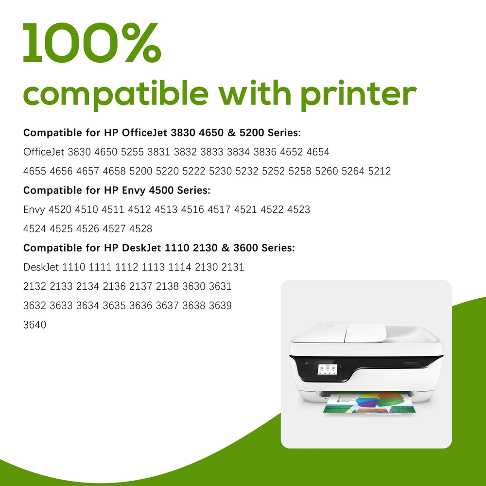 Note: Cartridges are similar to the pictures. Sometimes there are differences due to different suppliers. Product Features Contents: For HP 63XL Black / HP 63XL Tri-Color (Show Accurate Ink Levels) Warranty 100% satisfaction guaranteed. Ink Type: Black - Pigment ; Tri-Color - Dye Cartridge Type: Remanufactured(Not OEM) Package include: Multiple combinations to match, packaged and shipped as you choose. Page Yield: black-750 / tri-color-450 pages per ink cartridge (determined by 5% page coverage) Compatible With: For HP OfficeJet Series: 3830 3831 3832 3833 3834 5200 4650 4652 4654 4655 5255 5258 5260 For HP ENVY Series: 4510 4511 4512 4513 4516 4520 4522 4524 4525 4526 For HP DeskJet Series: 1110 1111 1112 2130 2131 2132 2133 2134 2136 3630 3631 3632 3633 3634 3635 3636 3637 3638 Seller Note If the printer does not work after installing the cartridge, clean the chip contacts of the cartridge with an eraser or cotton swab. Be careful not to touch the ink nozzles at the bottom of the cartridge. Precautions for Ink Cartridge Use 1. When handling new ink cartridge,don’t touch the electrical contacts or print head nozzle on a cartridge. 2.Do not remove the electrical contacts except for the protective tape. Otherwise the machine will not work properly. 3.If the printer prompts "Low Ink" or "Empty" (or similar messages), you can click "OK", "Continue" or "√" to bypass the printer prompts and use the cartridge directly. Payment 1. We accept Paypal, Visa and MasterCard as payment methods. To pay, please use the eBay checkout system. All orders must be paid immediately. 2. Please do not use the PayPal note field to instruct us to ship to another address. The note will not be read. If you wish to change your shipping address, please contact us via eBay message. 3. If you wish to cancel your order, please request a cancellation within 1 hour of payment, otherwise you will need to contact eBay customer service to cancel your order. Shipping 1. We will provide you with free standard shipping on orders within the United States. 2. Free shipping does not include shipments to AK, HI, GU, PR, VI, PO BOX, military addresses/bases APO and FPO. 3.Shipping within just 24 hours after receipt of payment. (If there is a weekend or holiday in between, the term will be extended accordingly.) Returns 1. Full refund (excluding shipping costs) is available within 30 days from the date of purchase. Any defective or damaged item can be returned or exchanged within 60 days from the date of purchase. 2.Any defective/damaged item can be replaced within 180 days from the date of purchase (we define an item as defective only if it does not function as described). 3.Please contact us via eBay message before making a request to have the opportunity to resolve or correct the problem.