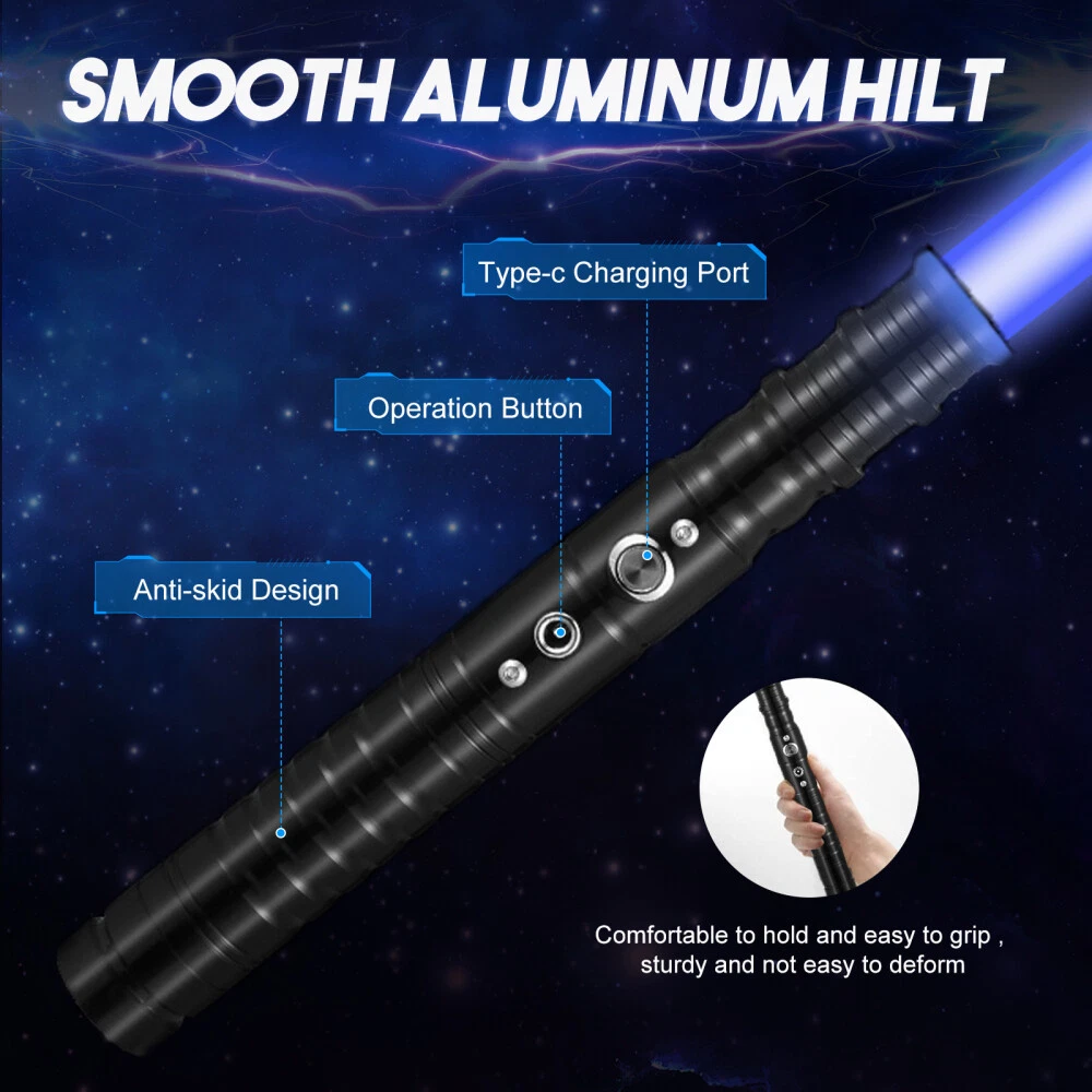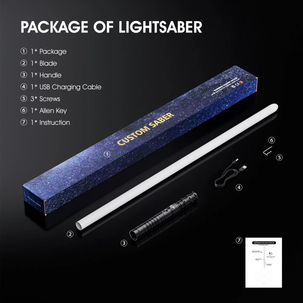 63cm Star Wars Lightsaber Replica Force FX Heavy Dueling Rechargeable Metal Hilt Lischwert FX Lightsaber, RGB 7 Colors Metal Hilt Light Saber, Smooth Swing USB Rechargeable Light Sword with Sounds Effect for Kids 3-12 Year Old Christmas Cosplay (63cm Black) ABOUT THIS ITEM 🔥【NEW 2 IN 1 METAL LIGHT SABER】If you order 2 pack Lorsaberus RGB light sabers, The sabers can be linked to form a longer light saber , similar to a darth maul's light saber, the handle and blade can also be removed, which is very portable and convenient. (Just screw off a Light saber tail nut then connect the tail) [Note: Please order 2pcs If you want this feature] 🔥 【HIGH-QUALITY MATERIAL】 The hilt of this RGB LED lightsaber is made of alloy, which is solid and durable. The blade of the lightsaber is made of environmentally friendly PC material, which has high transparency and durability. 🔥 【A VARIETY OF COLORS】 This lightsaber has seven different colors of light effects, green, purple, yellow, blue, red, white, and ice blue. You can even choose the infinite color-changing mode(Color will change automatically among the seven colors). The lightsaber also has fighting, collision, and waving sound effects. Press the switc button choose different colors according to scenes to bring you a more immersive experience. 🔥 【RECHARGEABLE LIGHTSABER】 The lightsaber adopts a 1500mah high-capacity rechargeable battery design, and the input power supply is 5V / 1A. Therefore, any device that can output the same power supply as the USB port can charge the lightsaber. The charging time is 4-5 hours, and it can be used for 2-3 hours after being fully charged. 🔥 【MULTI APPLICABLE SCENE】 -RGB lightsaber is very suitable for parties, outdoor sports, family entertainment, outdoor camping, different colors and sounds can bring you different entertainment effects. Realistic flash combat effects for realistic lightsaber duels. The responsive wiggle and crash sound like a real lightsaber makes the perfect gift! 🔥 【PERFECT GIFT】 Our lightsaber with 7 colors is durable and can be used for a long time after fully charged. It is a perfect gift for adults and kids, please buy with confidence. If you have any questions, please contact us. Or visit our store for more styles of lightsabers. Specifications Recommended age:3+ Lightsaber total length:63cm Hilt length:22.5cm Blade diameter: 7/8 Blade length: 43cm Blade LED colors: 7 colors (green, purple, yellow, blue, red, ice blue, white) Sound effects: 1 set (button, collision, sword, swing, switch machine) Charging time: 4-5 hours Charging voltage: 5V (max) Material: aluminum alloy, high quality PC Lamp group: 9W, RGB LED Maximum endurance: 2-3 hours Package Included Hilt * 1 Blade * 1 USB CABLE * 1 Hex socket small screwdriver *1 Screw * 3 Handbook * 1 More Details Aluminum Alloy Hilt High Quality PC Blade Rechargeable Battery Payment policy We accept PayPal . We ship item to your verified address. Payment must be received within 3 days from the date of purchase. Shipping policy Shipping will always be Fast & Free. Whereas any payment upon the item was made, your item will be very well packed and sent within 1 to 3 business days (It's usually 1, and we put 3 just in case) , and it should be safely delivered within 2 to 5 business days. During these days, no worry shall be concerned, so please sit back and wait for your package along the delightful sunshine and peaceful moonlight. To be explicit, your item will be shipped either via USPS or FedEx depending on different circumstances. Your carrier tracking number will be immediately sent to the e-mail address associated with your eBay account as label generated. You may keep track of your order at will. If any question or problem is raised during transition, please let us know and we will help till the end. Terms of Sale Sometimes things can go wrong no matter what. As a responsible seller, we help in any problem, such as damaged goods, defective products, unclear descriptions, or etc., that you consider as a dissatisfaction, the door to our Customer Service is always widely opened for you. Please let us know how we can help if you needed ANYTHING ANYTIME! Yet please also notice that any collaboration needs time to reach a solution. * For a delayed or lost package, as we actively communicate with our colleagues and shipping carriers. This process could take up to 14 days, so if the item is needed urgently, we highly recommend you to place another order. * For a presumably defective product received, our customer service will work this out with you in a quick manner. In this case, please describe the issue as clear as possible. Pictures and videos can be extremely helpful and time-saving here. * For any confusing or false description in the listing that causes a mis-purchase, please kindly remind us so we can improve our listings and continuously offer a better purchasing experience to you and to all our customers as well. Did it occur to be our mistake for the faulty transaction, we would be responsible for the return cost. Among all sorts of the problem, before the puzzle resolved or time expired, a refund or replacement will NOT be issued. We wish you understand the pressures here, and our effort will always come to your aid. About US It's nothing about us. It's all about you. As informed above, the door to our Customer Service is constantly wide-open to you. If you were having any question, or just looking for someone to chat with, please feel free to contact us through Messages. We will get in touch promptly in 24 hours. Concerns wouldn't be necessary since we promised to be on your side. You can just enjoy a nice day while waiting for our reply. When there was an accident like business getting busy or filing bankruptcy or people taking a break or getting off work or getting fired or attacked by aliens or something else which delays our response, might us be forgiven. You know, things could happen. (Finger 