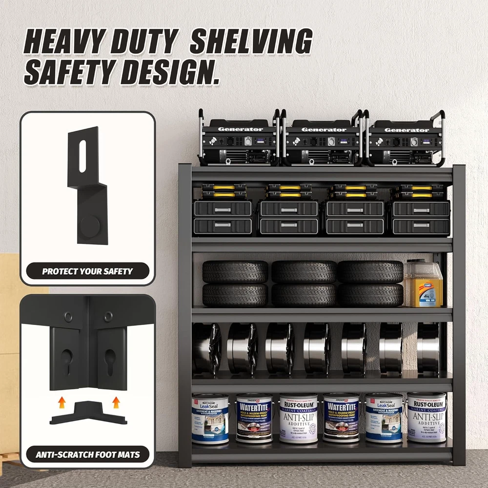 Product Description About this item Multipurpose Adjustable Garage Metal Shelving: The industrial shelving features adjustable shelves, allowing you to customize the height of each shelf to accommodate items of various sizes. It can also be assembled into 2 small storage shelving units and placed side by side as a long table with storage underneath, or as a workbench. You can build a Free Combination sturdy shelves any way you want it 2000 lbs Capacity Heavy Duty Shelving: Designed for heavy-duty use, each solid, thickened metal shelving unit features large ribs beneath and double-thickened legs. This basement storage shelves can hold substantial weight. Each shelf can support up to 400 lbs, with a total bearing capacity of 2000 lbs. It ensures durability and stability, making it perfect for storing a variety of items in your garage or workspace Premium Quality Material and Craftsmanship: The specially treated rust-resistant coating ensures that the rack remains shiny and new even in humid environments. The entire all-metal shelving uses anti-rust painting technology, making it easy to clean, moisture-proof, and rust-proof. The expert craftsmanship guarantees that this garage shelving unit is built to last, making it a reliable addition to any storage space Safe Design: Our pantry shelves unit comes with free wall-mounting brackets, allowing you to secure it to the wall for added safety and stability. The thoughtful design of the standing shelf prevents tilting and falling, while eight foot pads protect your floors and minimize noise during movement. This steel shelving solution is perfect for keeping your garage or workspace organized and secure 10 Minutes Easy Assembly: The shelving rack adopts a special interlocking design for ease of assembly. To help you quickly assemble the garage storage shelves, we provide a rubber mallet, a pair of gloves, and clear instructions, making it easy to understand and assemble each shelving unit within 10 minutes Anti-scratch foot mats When moving the shelves, the feet can avoid scratching the floor and generating large noise Adjustable dividers You can freely adjust the height of the shelves according to your needs, and can be disassembled into multiple shelves Double-Thickness Design Double-layer column design enhances the loading capacity of the shelves and strengthens the stability of the shelves Load-Bearing Reinforcemen The load-bearing capacity of the laminate with reinforcing bars is greatly improved