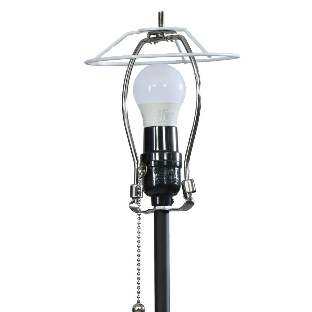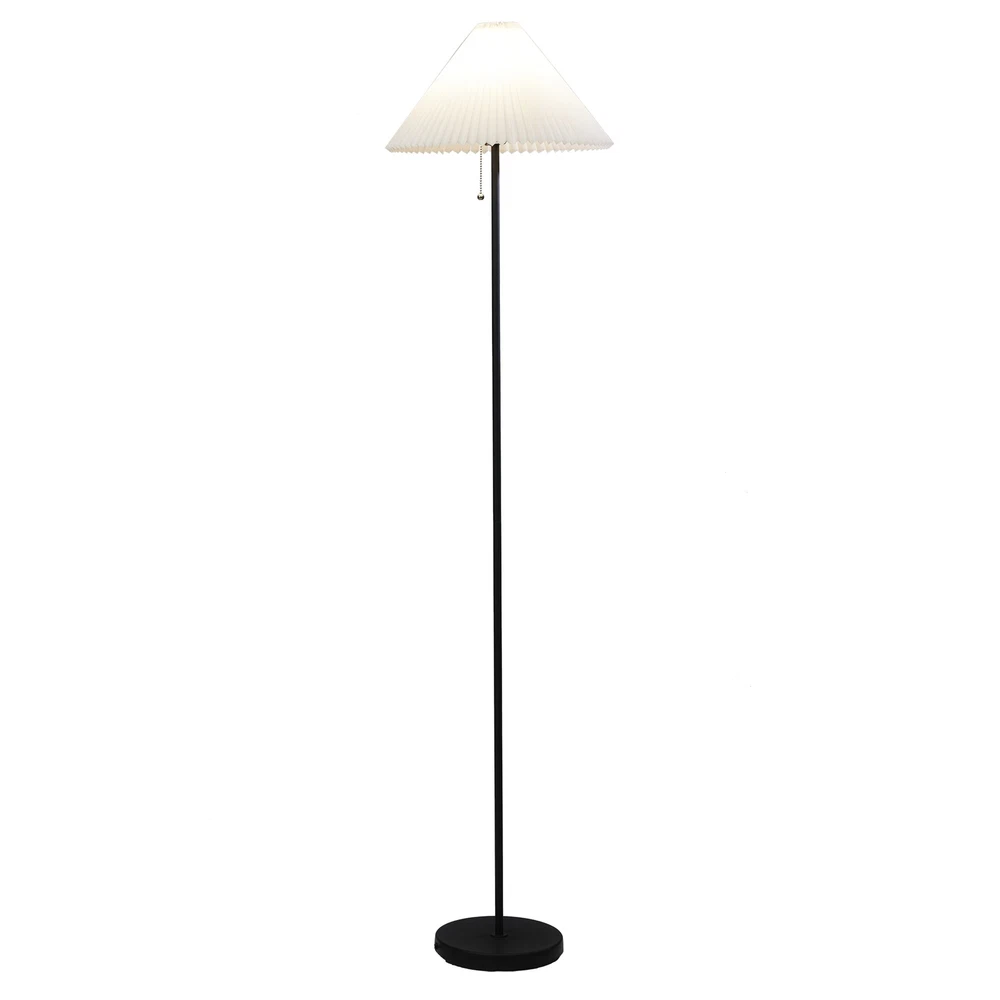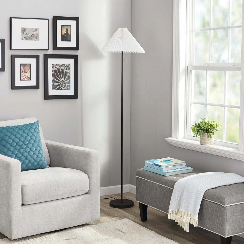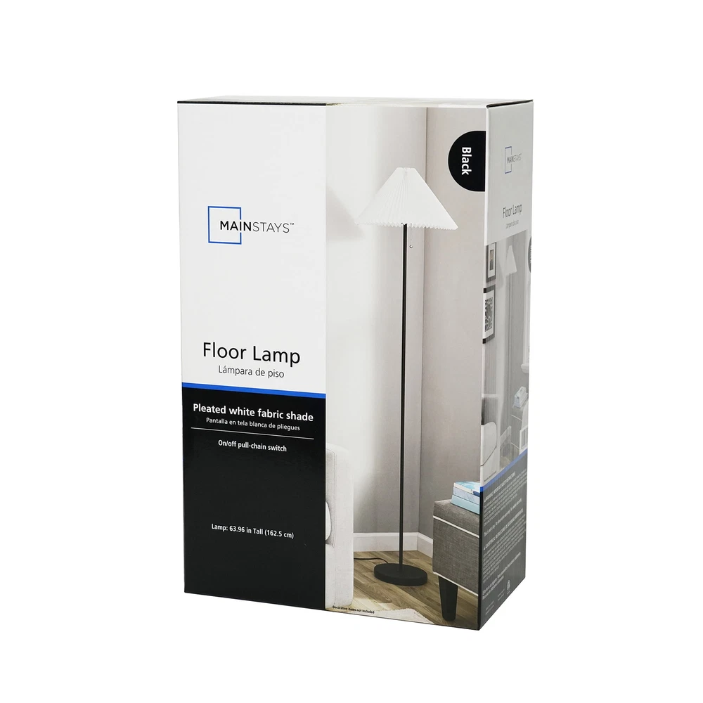 The 64-Inch Matte Black Metal Floor Lamp, with Pleated White Lampshade, is sure to add extra light to any room in your home in a classic way. This matte black floor lamp comes with a white pleated fabric lampshade. This Floor Lamp stands 64 inches tall and has a 5-foot cord to make it easy to place anywhere in the room. The weighted plastic base measures approximately 9 inches in diameter for stability. The white shade measures 16 inches in diameter at the bottom and is 12 inches high. This floor lamp takes a standard E26 lightbulb (not included). The 64-Inch Matte Black Metal Floor Lamp, with Pleated Lampshade, is the perfect floor lamp to upgrade the lighting of any room in your house. 64-inch sleek metal floor lamp Color: Matte Black 60-inch lead wire Weighted plastic base measures approximately 9" Turn lamp on and off with a pull chain White fabric pleated lampshade The pleated lampshade is 16" in diameter and 12 inches tall Classic design of this lamp will provide beautiful light to any room Lamp uses a standard E26 lightbulb (Not Included) Model No.: 62-055