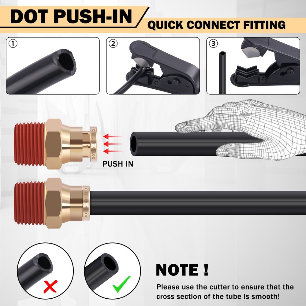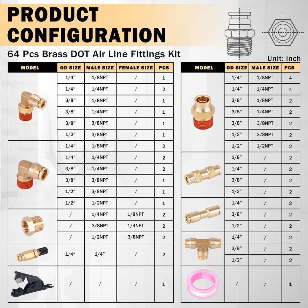 64 Pcs Brass DOT Air Line Fittings Kit Push Lock & Quick Connect Fittings NPT Th 64 PCS PACKAGE: The 64 pcs DOT air line fittings assortment includes: 6 pcs brass tube tee fittings, 14 pcs brass straight union connectors, 18 pcs brass straight push & NPT thread, 9 pcs 90°elbows NPT thread, 7 pcs 360° swivel elbows NPT thread, 6 pcs brass bushings, 2 pcs brass 1/4" inflation Schrader valve, 1 pc tube cutter, 1 pc Teflon tape. Air brake line fittings types: 1/8", 1/4", 3/8", 1/2" PREMIUM DOT FITTINGS: CheeMuii DOT air hose fittings are made of CA360 pure brass, meet D.O.T. FMVSS 571.106 approved, SAE J1131 air brake system requirements, with corrosion resistance, high-temperature ductility, low permeability and long service life AIR SUSPENSION VALVE: CheeMuii 1/4" inflation Schrader valves are made of CA360 pure brass, which is durable and corrosion-resistant. Thread length: 3/4". Provide a manual inflation point to air spring suspension bags. Each expansion valve is equipped with a protective cap to prevent dirt and mud MAX WORKING INTENSITY: The brass fittings can be operated in pressures from vacuum to 800 PSI and in temperatures from -40°F to +248°F (-40°C to +120°C). Note: see the tubing manufacturer's recommendations for pressure and temperature mutations EASY INSTALLATION: The quick connect design and precise NPT threading make installation of air brake accessories easy, just push to connect. And there is pre-applied sealant on NPT male thread for better sealing WIDE APPLICATION: The brass DOT air fittings can be used for air suspension systems, perfect for semi truck/trailer/RV repair air line leak, also ideal for industrial workshops, daily garden or lawn mower repair, towing machine hose connection, etc CheeMuii 64 Pcs Brass DOT Air Line Fittings Kit Push Lock DOT Air Fittings Push to Connect Fittings NPT Thread & Quick Connect Air Hose Fittings for Air Line Air Hose Pneumatic Tubing 【64 PCS PACKAGE】- The 64 pcs DOT air line fittings assortment includes: 6 pcs brass tube tee fittings, 14 pcs brass straight union connectors, 18 pcs brass straight push & NPT thread, 9 pcs 90°elbows NPT thread, 7 pcs 360° swivel elbows NPT thread, 6 pcs brass bushings, 2 pcs brass 1/4" inflation Schrader valve, 1 pc tube cutter, 1 pc Teflon tape. Air brake line fittings types: 1/8", 1/4", 3/8", 1/2" 【PREMIUM DOT FITTINGS】- CheeMuii DOT air hose fittings are made of CA360 pure brass, meet D.O.T. FMVSS 571.106 approved, SAE J1131 air brake system requirements, with corrosion resistance, high-temperature ductility, low permeability and long service life 【MAX WORKING INTENSITY】- The brass fittings can be operated in pressures from vacuum to 800 PSI and in temperatures from -40°F to +248°F (-40°C to +120°C). Note: see the tubing manufacturer's recommendations for pressure and temperature mutations 【WIDE APPLICATION】- The brass DOT air fittings can be used for air suspension systems, perfect for semi truck/trailer/RV repair air line leak, also ideal for industrial workshops, daily garden or lawn mower repair, towing machine hose connection, etc Shipping We offer FREE shipping on all orders! We ship within Three business days of payment, usually sooner. We use a selection of shipping services such as UPS, FedEx, USPS etc. We only ship to the lower 48 states, no APO/FPO addresses or PO Boxes allowed. Local pickups and combined shipping options are not provided at this time. Return You can return a product for up to 30 days from the date you purchased it. Any product you return must be in the same condition you received it and in the original packaging. Please keep the receipt. Payment We accept payment by any of the following methods: PayPal Please pay as soon as possible after winning an auction, as that will allow us to post your item to you sooner! Feedback Customer satisfaction is very important to us. If you have any problem with your order, please contact us and we will do our best to make you satisfied. Contact Us If you have any queries, please contact us via ebay. We usually respond within 24 hours on weekdays. Please visit our eBay store to check out other items for sale! Thank you for shopping at our store.