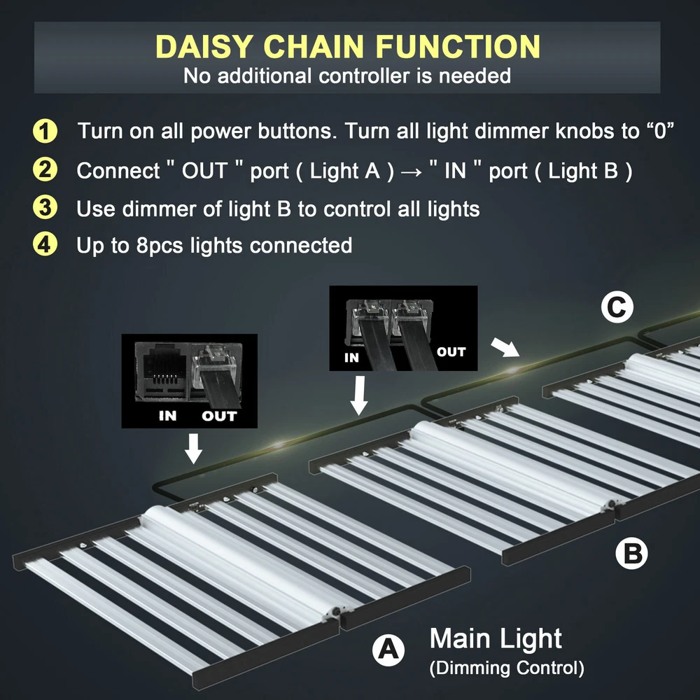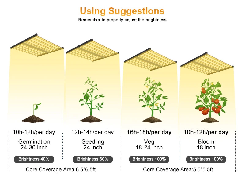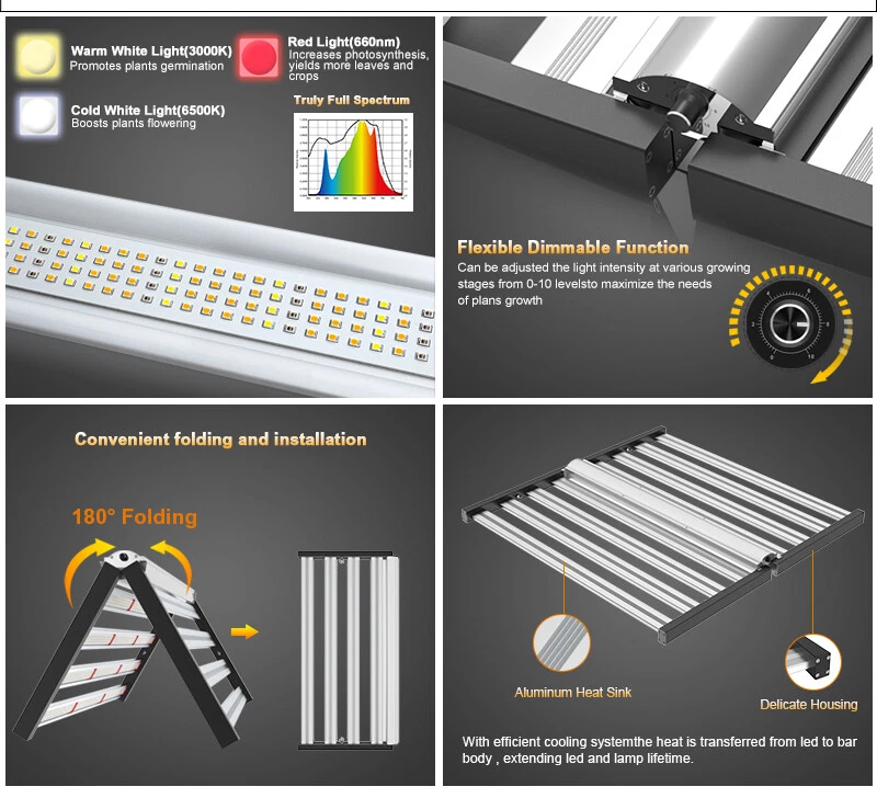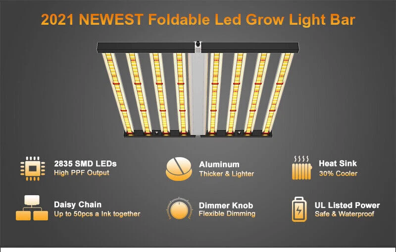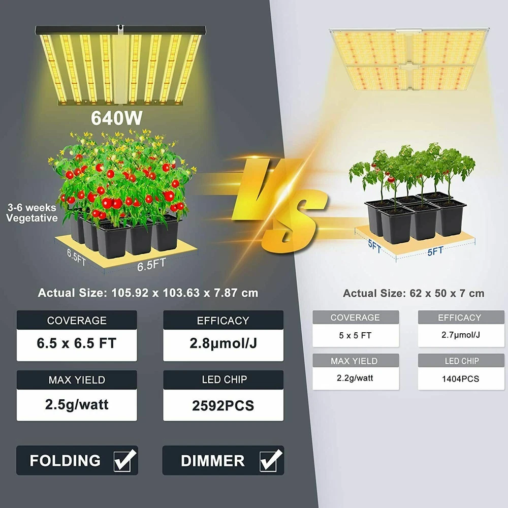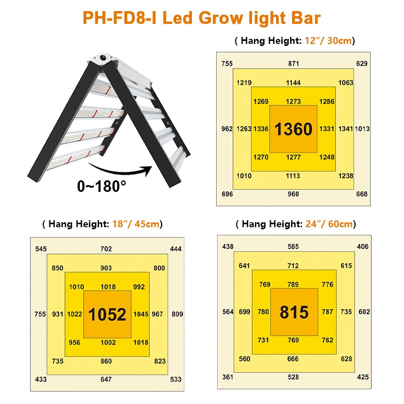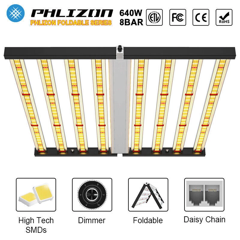 specifications Model: Phlizon FD8-I 640w led grow light hydro Noise Level: 0 DB Number of Leds: 120V-225pcs/240V-240pcs Spectrum: 660nm,3500K,6500K Actual Wattage(+-5%): 640w Amp Draw: 5.82A/110v, 5.33A/120v,3.08/208v,2.91A/220v,2.66A/240v Core Coverage: 6ft x 6ft Max Coverage:6.5ft x 6.5ft at 12INCH PAR Value: 1360 umol/s Replaces HPS/HID/MH: 2000 watt Product Size: 41.7*40.8*3.9inch (1060*1040*1000mm) Product Weight: 20.85kg Input Voltage: 100 ~ 240V AC,120-277V AC, 347-480V AC Frequency Range: 50~60Hz Life Rating: 50000-100000hrs Package includes 1 x LED Grow Light 1 Set x Free Steel Hanging kits (Easy installation) 1 x Free Warranty cards 1 x Free Power cord with Plug(US plug) specifications Model: Phlizon FD8-I 640w led grow light hydro Noise Level: 0 DB Number of Leds: 120V-225pcs/240V-240pcs Spectrum: 660nm,3500K,6500K Actual Wattage(+-5%): 640w Amp Draw: 5.82A/110v, 5.33A/120v,3.08/208v,2.91A/220v,2.66A/240v Core Coverage: 6ft x 6ft Max Coverage:6.5ft x 6.5ft at 12INCH PAR Value: 1360 umol/s Replaces HPS/HID/MH: 2000 watt Product Size: 41.7*40.8*3.9inch (1060*1040*1000mm) Product Weight: 20.85kg Input Voltage: 100 ~ 240V AC,120-277V AC, 347-480V AC Frequency Range: 50~60Hz Life Rating: 50000-100000hrs Package includes 1 x LED Grow Light 1 Set x Free Steel Hanging kits (Easy installation) 1 x Free Warranty cards 1 x Free Power cord with Plug(US plug) 😍 SMD2835 Led+Chips 2021 2835 UPDATED SMD Diodes, Higher light intensity, Less light decay, Better lumens and PAR values output. For maximum uniformity, hang the fixture 24-36 inches from the crop.The 8 passively cooled bars provide full-spectrum, broad-coverage light for full-term growth 😍 Full Spectrum+Dimmable 0-100v Professional proportional spectrum that is more suitable for plant growth (380nm-800nm) Blue, White, Red and IR, providing more effiecient light for indoor plants.It is perfect for all stages of growth of indoor plants, vegetables and flowers, from seeds to harvest. 😍 MORE DEEP RED LIGHT 660nm This is the NO.1 factor that affects your palnts growth. equiped with high-precision 90-degree lens and reliable SMD LED Tech together, which can make sure 98% light souce can apply to your plants completely, make your plants healthier and happier 😍 Large Built-in aluminum alloy With an output of 1200 µmol s-1, this fixture achieves an impressive efficacy upto 2.6 µmol s-1 per watt.Passively cooled LED bars provide intense light coverage with no fans or moving parts—significantly reducing the number of possible fail points compared to other fixtures THE FEATURES 640W LED GROW LIGHT 💯 MAXIMIZE CROP YIELD & ENERGY SAVING Wide 8-bar form design offers even & broad canopy coverage, maximize grow space, ideal for high PPFD cultivation with single or multi-tier racking.Consuming only 640 Watts true output with 2592 pcs LEDs, more scientifically and energy-efficient! Perfect for 6.5' x 6.5' veg stage, 5.5' x 5.5' Flower stage, higher intensity reach 30% than other blue red lights.Newest SMD LED technology provide light output PPFD up to 1360 μmol/㎡s, high energy efficiency at 2.8umol/J.The best solution to get more and better quality fruits. 💯 Sunlike Full Spectrum Grow Light This full spectrum LED Grow Light uses 2592 pcs upgrade SMD lamp beads (3000K, 6500K and 660nm). Adequate and sun-like light can prevent the growth of plants from spindly and moulding. The best lighting solution for indoor hydroponics and soil cultivation, such as potatoes, peppers, tomatoes, etc.suit for all plants whole stages indoor growing, rapid plant response from seed to veg to flower to harvest. 💯 Achieve Enviously Large Harvests High-performance gardens with new LED technology provide highest PAR/LUMEN output(1360μmol/m².s), Max 2.8g yield per wattage (power draw), achieve maximum quality and quantity, much better than traditional 2000W HPS/HID grow light. 💯 High Reflective Heat Sink Led Grow System Quickly heat dispersing material aluminum reducing light lost to aisles and walls, increase the light intensity up to 20%, allowing your plants receive more energy and without burning your plants for maximum headroom. 💯 Noise-free Fanless Led Grow Lamps for Indoor Plants Designed for home growers, fans get noisy when long time use, but this LED light board use aluminum make it cooling down instead use fans, bring you a fanless quiet grow experience. 💯 DIMMABLE & FOLDING Design The light intensity can be changed by dimmer knob according to the different growth stages of plants.Plant led grow light can be folded up 180°, installed and moved easily, keep your house tidy. Structure optimization and material upgrade make it more lightweight and easy to install and use. 💯 Marvelous Customer Service Phlizon provides truly 3-5 years standard warranty ! If there is any question or concerns, please feel free to Email us. We will help you with great pleasure! ABOUT PHLIZON LED GROW LIGHT Phlizon has been developed by growers over many years of careful experimentation and testing. We mainly produce the led grow light and related accessories in Agricultural Greenhouses help indoor and outdoor plants growing. Scientifically engineered to deliver the highest level of PAR output and balanced Coverage in the LED grow market. WHY CHOOSE PHLIZON GROW LIGHT BAR? 💪Fully assembled, industrial grade construction and durability , covering full PAR (380-730nm) promotes photosynthesis for Growth & Bloomming, 💪Optimized spectrum for all phases of plant growth and production 💪High performance aluminum alloy light bar, Fast heat dissipation, Uniform illumination, lifespan up to 50000 hours. 💪Scientifically engineered spectrum to maximize photosynthesis, growth, and yield 💪40% less energy consumed and heat generated to produce an equivalent amount of delivered PAR than 1000W HPS 💪Superior delivered PAR output and PAR photon efficacy than 1000W HPS 💪Passive cooling design eliminates inferior features such as fans, moving parts, 