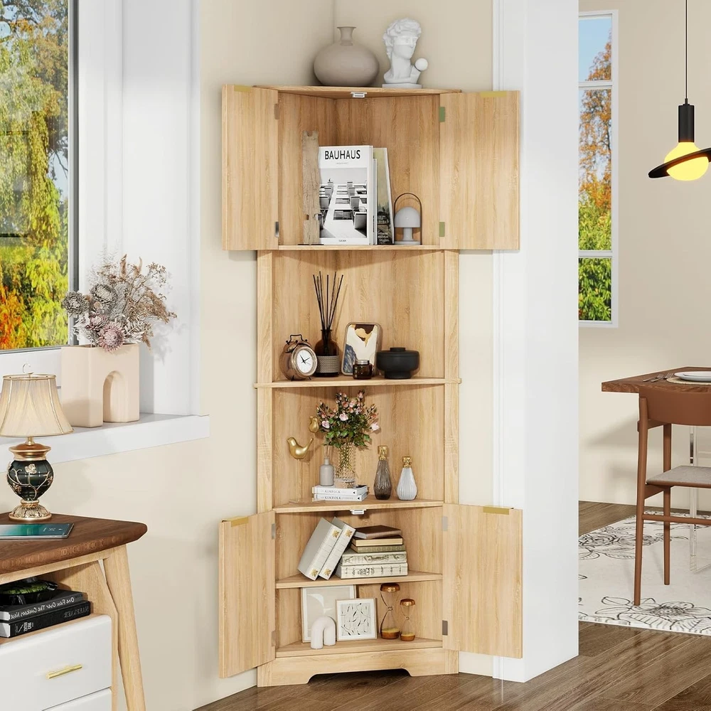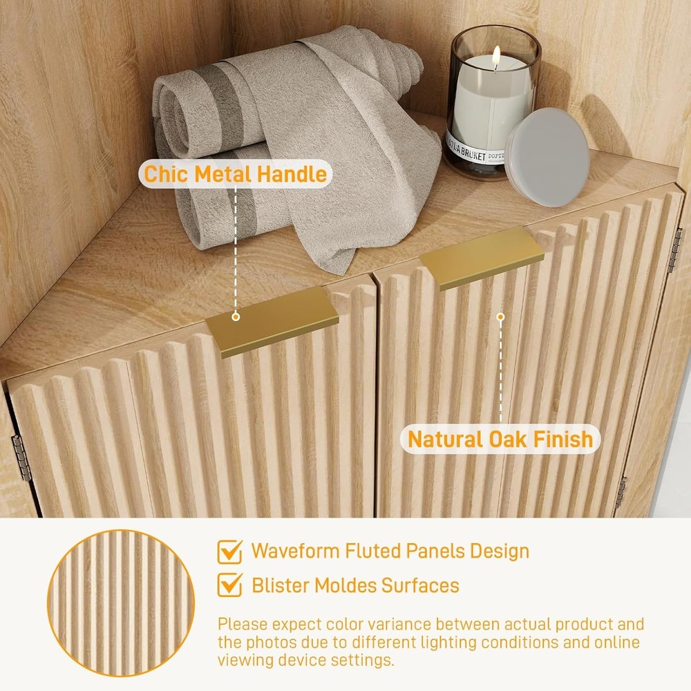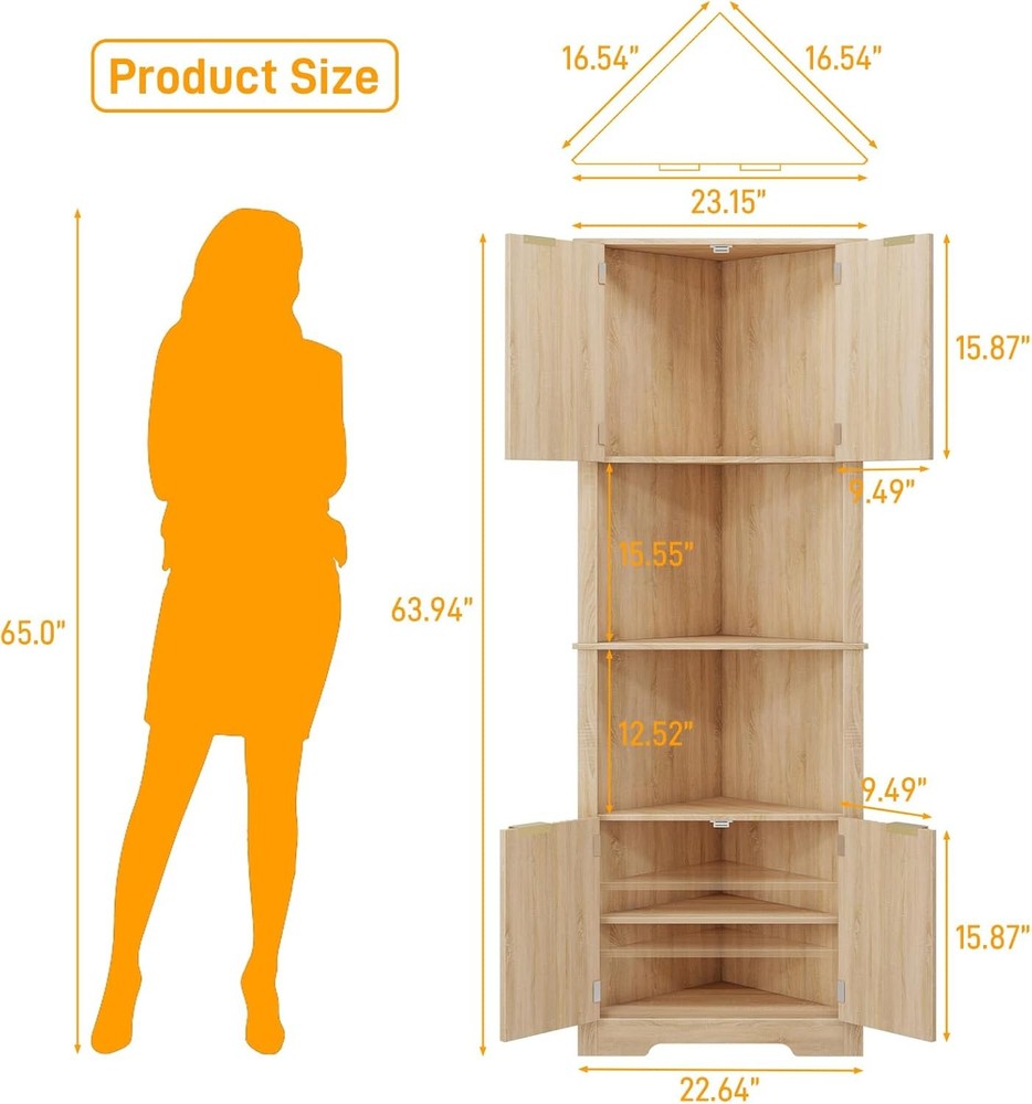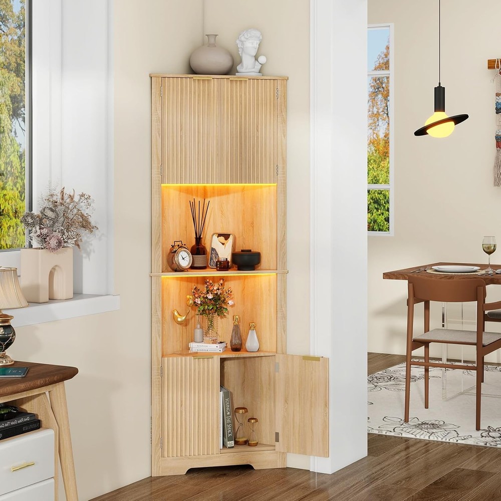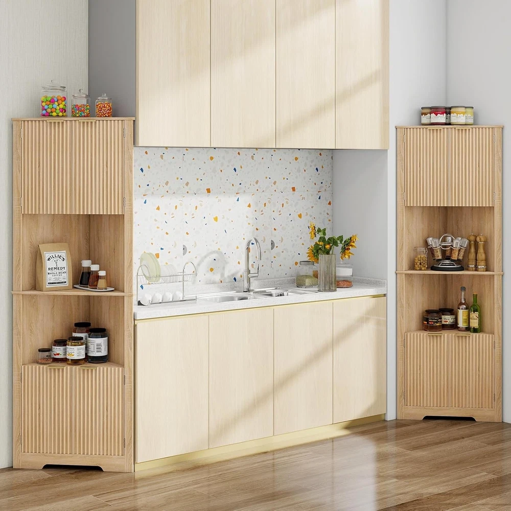 Fluted Corner Cabinet, 64” Tall Corner Organizer Storage Cabinet with Doors for Bathroom Kitchen Floor Cabinets with Adjustable Shelf Home Space Saver for Small Spaces Product Description About this item CORNER BATHROOM CABINET WITH FLUTED DOORS: The unique waveform fluted panel not only enhances texture but also elevates spatial presence, creating an exceptional piece for your space. Adding a timeless elegance meets modern chic to your living room, kitchen and bathroom. This storage cabinet can fit well in any space in your home and match perfectly with different styles of scenes. CORNER STORAGE CABINET WITH 1 ADJUSTABLE SHELF: The 90°right angle corner cabinet with 4 doors could make the most of small spaces underutilized. It includes 2 closed storage spaces. 2 of the spaces have adjustable and detachable shelf that you can adjust height according to different storage needs for more hidden storage space.The upper and lower spaces share an adjustable shelf. MULTI FUNCTIONAL STORAGE CABINET: This storage cabinet can be used in multiple functions and scenarios. As a corner cabinet in the bathroom, it can store toiletries; As a floor standing storage cabinet, it can store books, decorations, etc; As a kitchen cabinet, it can store seasonings, soy sauce, wine, and other items. It is very suitable for bathroom, living room, kitchen, and corner scenes, practical and beautiful at the same time. STABILITY AND SAFETY: Considering the height of the storage cabinet is 64 inches, in order to meet the needs of different people, our storage cabinet is equipped with a sturdy base and anti-tipping device, which is directly fixed to the wall to prevent tipping and maximize safety and stability. Protect your and your family's safety, so even if there are mischievous children and pets at home, you don't have to worry about them falling. SATISFACTORY SERVICE: has an excellent pre-sales and after-sales service team. Please don't hesitate to if you encounter any problems with our products, we will provide you with a satisfactory solution. Hope to bring you the best shopping experience.
