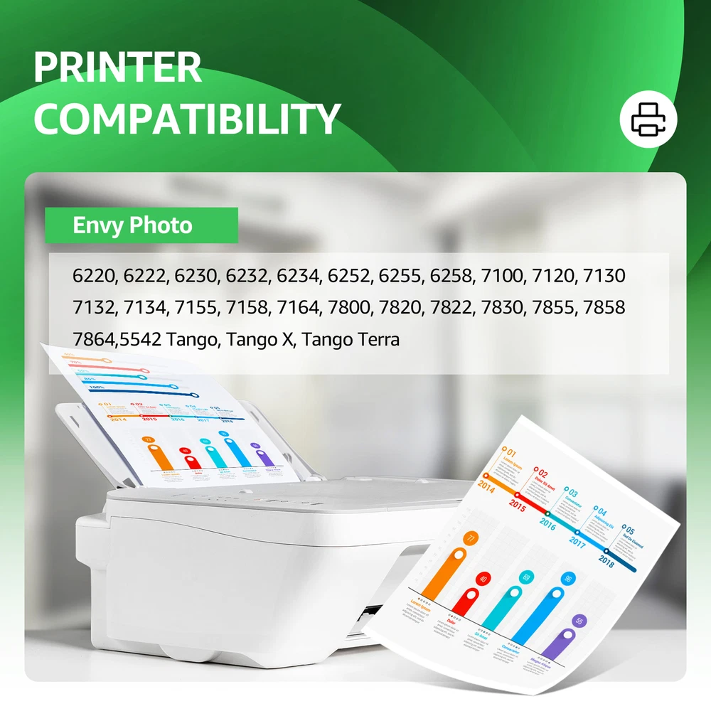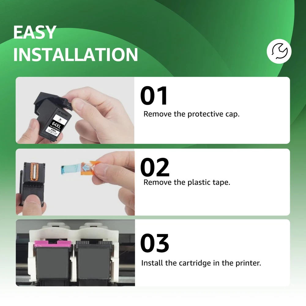 Note: Cartridges are similar to the pictures. Sometimes there are differences due to different suppliers. Product Features Contents: For HP 64XL Black / HP 64XL Tri-Color (Show Accurate Ink Levels) Warranty 100% satisfaction guaranteed. Ink Type: Black - Pigment ; Tri-Color - Dye Cartridge Type: Remanufactured(Not OEM) Package include: Multiple combinations to match, packaged and shipped as you choose. Page Yield: black-750 / tri-color-450 pages per ink cartridge (determined by 5% page coverage) Compatible With: For HP Envy photo 6220 6230 6232 6252 6255 6258 For HP Envy photo 7120 7130 7132 7155 7158 7164 For HP Envy photo 7820 7830 7855 7858 7864 Seller Note If the printer does not work after installing the cartridge, clean the chip contacts of the cartridge with an eraser or cotton swab. Be careful not to touch the ink nozzles at the bottom of the cartridge. Precautions for Ink Cartridge Use 1. When handling new ink cartridge,don’t touch the electrical contacts or print head nozzle on a cartridge. 2.Do not remove the electrical contacts except for the protective tape. Otherwise the machine will not work properly. 3.If the printer prompts "Low Ink" or "Empty" (or similar messages), you can click "OK", "Continue" or "√" to bypass the printer prompts and use the cartridge directly. Payment 1. We accept Paypal, Visa and MasterCard as payment methods. To pay, please use the eBay checkout system. All orders must be paid immediately. 2. Please do not use the PayPal note field to instruct us to ship to another address. The note will not be read. If you wish to change your shipping address, please contact us via eBay message. 3. If you wish to cancel your order, please request a cancellation within 1 hour of payment, otherwise you will need to contact eBay customer service to cancel your order. Shipping 1. We will provide you with free standard shipping on orders within the United States. 2. Free shipping does not include shipments to AK, HI, GU, PR, VI, PO BOX, military addresses/bases APO and FPO. 3.Shipping within just 24 hours after receipt of payment. (If there is a weekend or holiday in between, the term will be extended accordingly.) Returns 1. Full refund (excluding shipping costs) is available within 30 days from the date of purchase. Any defective or damaged item can be returned or exchanged within 60 days from the date of purchase. 2.Any defective/damaged item can be replaced within 180 days from the date of purchase (we define an item as defective only if it does not function as described). 3.Please contact us via eBay message before making a request to have the opportunity to resolve or correct the problem.