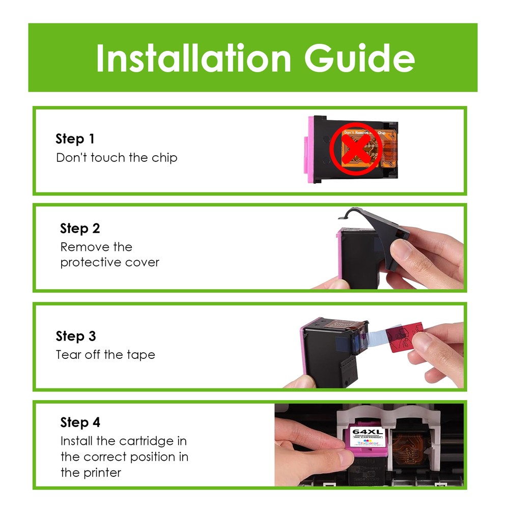Note: Cartridges are similar to the pictures. Sometimes there are differences due to different suppliers. Product Features Contents: For HP 64XL Black / HP 64XL Tri-Color (Show Accurate Ink Levels) Warranty 100% satisfaction guaranteed. Ink Type: Black - Pigment ; Tri-Color - Dye Cartridge Type: Remanufactured(Not OEM) Package include: As you selected Page Yield: black-750 / tri-color-450 pages per ink cartridge (determined by 5% page coverage) Compatible With: For HP Envy photo 6220 6230 6232 6252 6255 6258 For HP Envy photo 7120 7130 7132 7155 7158 7164 For HP Envy photo 7820 7830 7855 7858 7864 Seller Note If the printer does not work after installing the cartridge, clean the chip contacts of the cartridge with an eraser or cotton swab. Be careful not to touch the ink nozzles at the bottom of the cartridge. Precautions for Ink Cartridge Use 1. When handling new ink cartridge,don’t touch the electrical contacts or print head nozzle on a cartridge. 2.Do not remove the electrical contacts except for the protective tape. Otherwise the machine will not work properly. 3.If the printer prompts "Low Ink" or "Empty" (or similar messages), you can click "OK", "Continue" or "√" to bypass the printer prompts and use the cartridge directly. Payment 1. We accept Paypal, Visa and MasterCard as payment methods. To pay, please use the eBay checkout system. All orders must be paid immediately. 2. Please do not use the PayPal note field to instruct us to ship to another address. The note will not be read. If you wish to change your shipping address, please contact us via eBay message. 3. If you wish to cancel your order, please request a cancellation within 1 hour of payment, otherwise you will need to contact eBay customer service to cancel your order. Shipping 1. We will provide you with free standard shipping on orders within the United States. 2. Free shipping does not include shipments to AK, HI, GU, PR, VI, PO BOX, military addresses/bases APO and FPO. 3.Shipping within just 24 hours after receipt of payment. (If there is a weekend or holiday in between, the term will be extended accordingly.) Returns 1. Full refund (excluding shipping costs) is available within 30 days from the date of purchase. Any defective or damaged item can be returned or exchanged within 60 days from the date of purchase. 2.Any defective/damaged item can be replaced within 180 days from the date of purchase (we define an item as defective only if it does not function as described). 3.Please contact us via eBay message before making a request to have the opportunity to resolve or correct the problem.