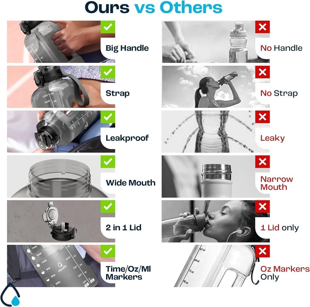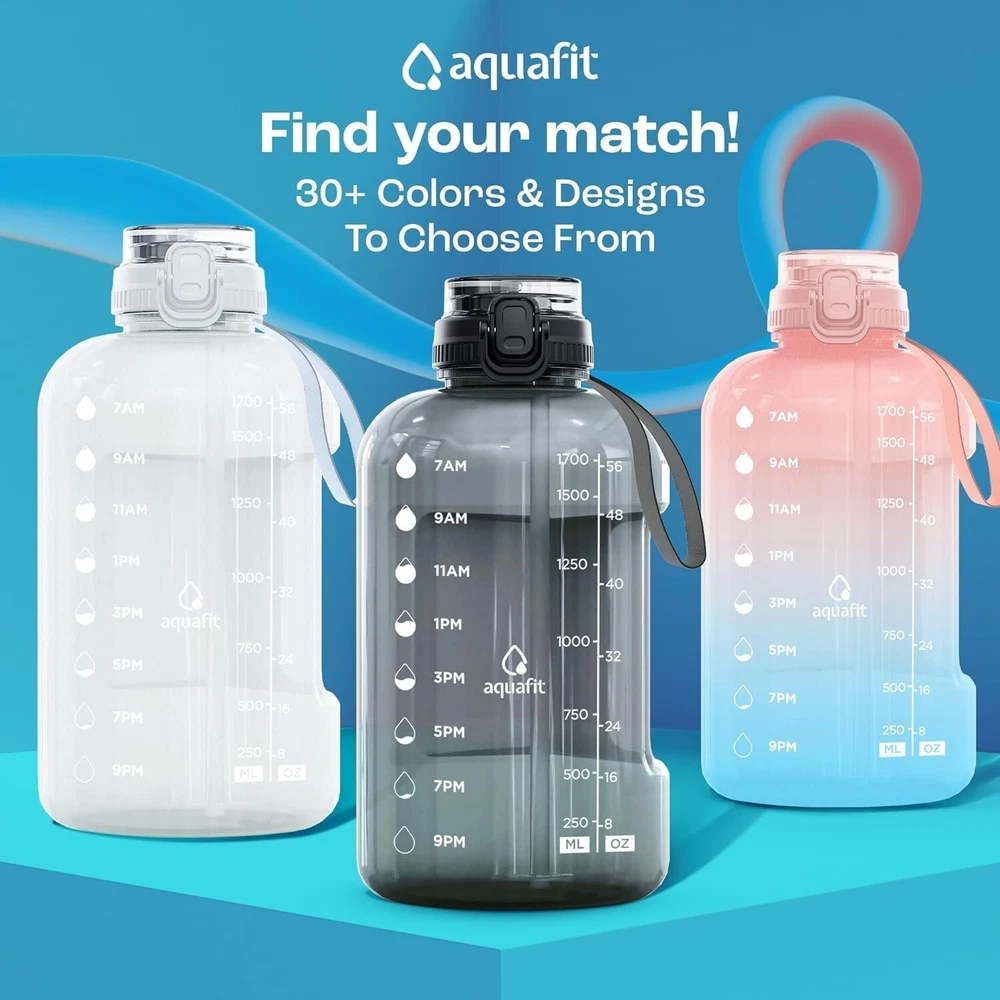 64 oz Water Bottle with Time Marker - Straw & Chug Lid - BPA Free Big Water Bottle with Straw - Gym Water Bottle with Handle - Gallon Water Jug 64 Ounces, Nebula Track How Much You Drink - Our BPA Free half gallon bottles come with time markers on the side so you can see your daily water intake and stay on track meet your health and fitness goals. Large 1/2 Gallon Capacity - Our 64 oz water bottles kids are durable, light and portable. Drink all the water you need and forget about refills: this large water bottle is perfect for an on-the-go lifestyle! 2-in-1 Chug & Straw Lid - Our half gallon water bottle comes with a dual functionality lid that allows you to chug or sip without having to change the lid. The smart, off-centre placement of the lid lets you use both the spouts with ease - sip while you work and chug after a rigorous workout! Bonus Accessories - This water bottle with straw includes a useful handling strap as well as two extra lids. The motivational water jug of your dreams! BPA-Free & User Friendly Design - Our clear water bottles with times to drink comes with a wide mouth, a big handle for easy grabbing, and is made of 100% BPA-free plastic. HALF GALLON 2 IN 1 LID WATER BOTTLE (64OZ) Easy Hydration For a Healthy Life Staying hydrated isn't about quenching your thirst; it's actually one of the keys to keep your metabolism performing at its peak.
