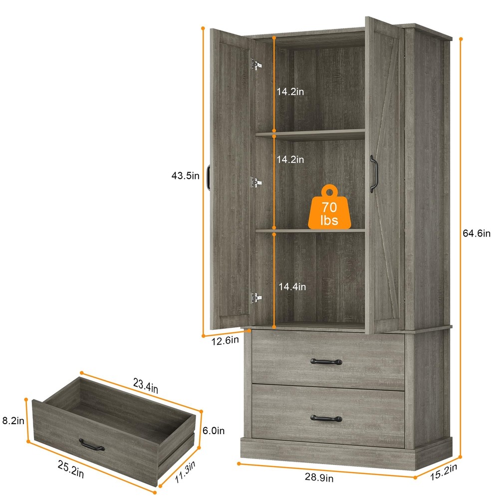 About this item Ample Storage Space: This kitchen pantry cabinet measures 28.9" W x 15.2" D x 64.6" H, with drawers sized 25.2" W x 11.3" D x 9" H. Spacious and versatile storage keeps your home organized and beautifully decorated. The two middle shelves within the cabinet are both adjustable and removable, featuring three height options that cater to your different storage preferences Multi-Purpose: This tall pantry storage cabinet with doors, shelves, and drawers boasts immense storage capacity. A true multi-purpose marvel, it adapts seamlessly to diverse needs. Be it your food kitchen pantry storage for cutlery, plates, and spices, or your bathroom need for towel and toiletry management, even in utility room miscellany – this hutch storage cabinet emerges as the quintessential choice Modern Elegance Design: Our tall kitchen cabinet features a sleek rectangular silhouette with 2 classic barn doors. The rustic wood texture finish, accompanied by the touch of black metal accents, masterfully fuses modern rustic aesthetics with the warmth of vintage farmhouse charm. It effortlessly breathes personality into your kitchen or dining room, seamlessly complementing any furniture and decor style you embrace Stability and Security: Crafted from premium engineered wood and metal, this tall storage cabinet has a robust base and anti-tipper mechanism that secures it firmly to the wall, eliminating any tipping concerns. Protect your and your family's safety. Easy Assembly: Enjoy effortless assembly with clearly labeled parts and simple instructions, enabling you to set up your kitchen storage cabinet quickly. Transform your space and achieve an organized kitchen in no time. Product Description This grey freestanding pantry is an ideal choice for the kitchen, a hutch in the dining room, and a coffee bar in the living room, ample storage space, and a glass display cabinet door meet your all-store needs. 2 Large Drawers The generous Drawer with smooth-gliding track makes it convenient to open and close with minimal effort, perfect for long-term use Adjustable Shelves The 2 middle shelves within the cabinet are both adjustable and removable, featuring 3 height options that cater to your different storage preferences Vintage Barn Doors This kitchen pantry cabinet features 2 classic doors and durable hardware handles, adding some touch of rustic charm Stability & Security This large hutch cabinet is equipped with a robust base and anti-tipper mechanism, eliminating any tipping concerns Payment Delivery details Terms of sales About us Contact us Payment We accept payment either via PayPal or any of the following credit cards; Visa, MasterCard, Discover, and American Express. Delivery details 1. We will delivery out at the handing time when we receive the payment. 2. The delivery time is 3-5 business days to US by usually time.The parcel maybe delay 1-2day of the weekend.Due to the bad weather,Holidays,Hot Season ect.the parcel maybe delay,If you have any problems,mssage us,we will try our best to solve it. 3. We ship to your eBay address. Please make sure your eBay address is correct before you pay. 4. If you want to change the shipping address,message us before our send out. Terms of sales If you are not satisfied with the item for any reason, please do not quick to leave negative/neutral feedback even open request and case without any communication with us. We devote ourselves making EVERY CUSTOMER in 100% Satisfactory and resolve any problem. Thank you for your understanding and recognition,we are always leave positive feedback to all our customers. About Reply: All replies will be sent to your email box, if you do not get response within 24 hours (Sat. & Sun. excluded) please check your eBay My Messages in case that our emails will be filtered automatically by your settings. About us automobilee-01 is a brand new store but we are one of North America’s top online suppliers of specialized, high-quality aftermarket online retailers and suppliers, committed to developing new markets. We primarily offers tool sets, auto parts, home goods, etc..With over 20 years of product selection and manufacturing experience, we delivers unparalleled quality, value, service and satisfaction. Our highly-trained, professional staff offer in-depth knowledge and personalized assistance for customers worldwide. Providing our customers with a simple, hassle-free experience with best-in-class customer service is more than a goal. Contact us Any problem please rest assure to contact us by eBay message first. We will reply you as soon as we can. We will deal with it within 24hs on working days. Brand IDEALHOUSE Item Height 64.6 in Item Length 28.9 in Item Width 15.2 in Type Cupboard Material Engineered Wood Color Gray Number of Shelves 2 Mounting Free Standing Additional Parts Required No Department Adults Assembly Required Yes Model Cupboard Item Weight 94.1 Pounds MPN Does not apply Shape Rectangular Room Living Room Style Modern Features With Doors, With Drawers Number of Doors 2