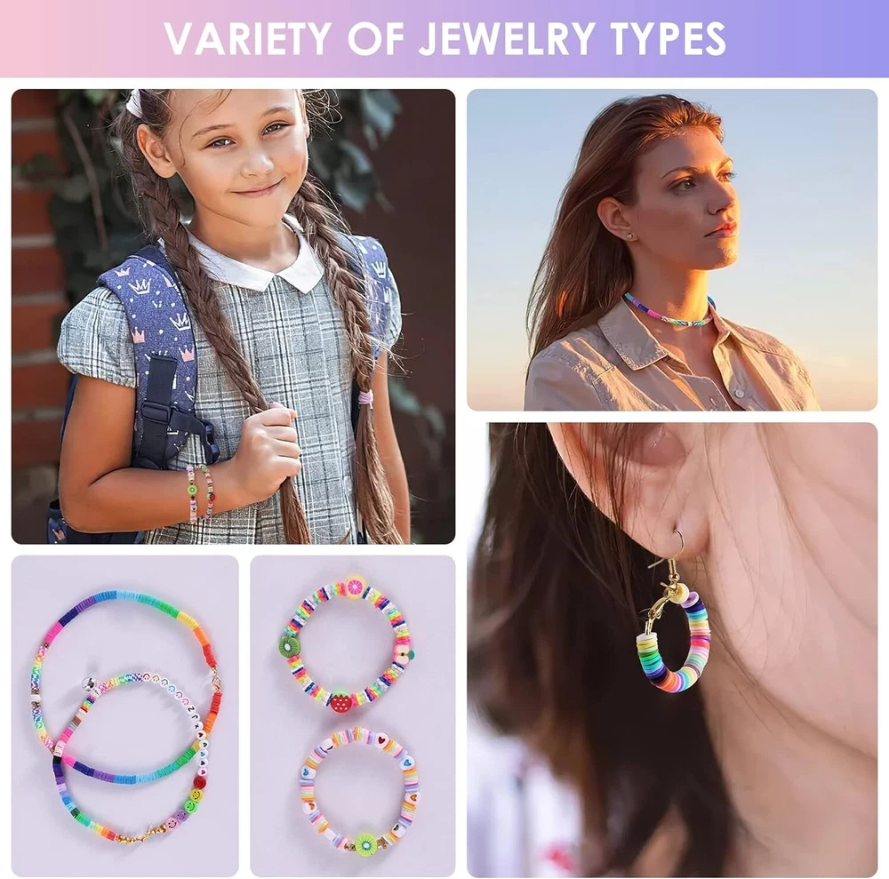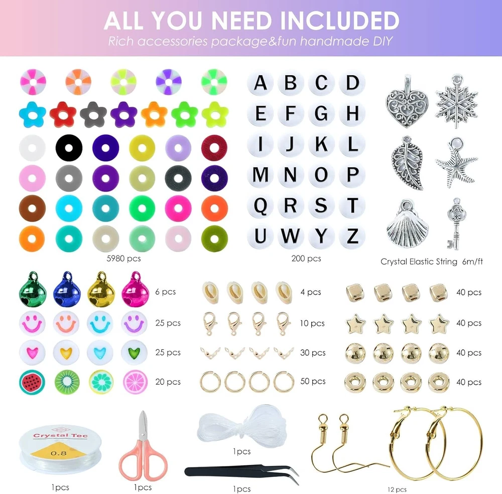 【Premium Clay Beads Kit】The clay beads for bracelet making kit include 6000pcs clay beads and 500pcs charms kit (contains random letter beads, smile beads, colorful heart beads, fruit beads, silver charm pendant, jump rings, lobster clasp, etc.), 1 elastic string cords(0.8mm), scissor, tweezers. Polymer clay beads are lightweight, comfortable to wear. 【Rich Colors】24 bright colors of 6mm polymer clay beads meet your requirements for colorful DIY items. You can create a bracelet using mixed polymer clay blackstone beads and your favorite pendant. 【Safe Material】The clay beads are made of polymer clay. Eco-friendly, non-toxic, comfortable to wear and waterproof. It can be worn every day, not easy to fade. 【Easy to Organize】Our jewelry making kit contains everything you need. All items are neatly placed in the box. There will be no messy desktop after use, convenient for your next use. A simple and fun kit. 【Wide Use】The flat beads for DIY crafts bracelets, such as necklaces, earrings, key pendants, anklets and many decorations. They are a great gift for children, family, friends, and yourself.