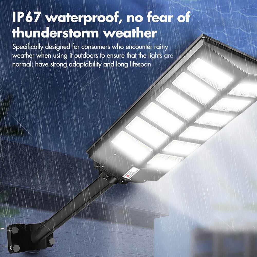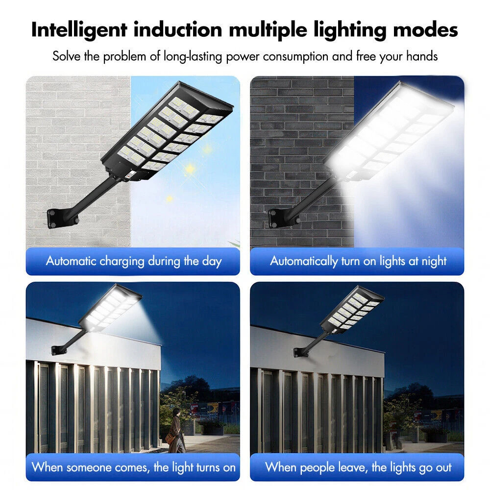 【Super Bright Solar Street Light】2600W solar street light uses high efficiency 960 pcs 5730 high bright long lifespan SMD lamp beads, 300000 Lumens are extremely bright and have low light decay. With a 240 degree wide-angle lighting design, which can provide lighting range up to 3800 square feet and brighter compared with ordinary street lights. 【NO Electricity Bill】This solar parking street light provides 6500K daylight white light and is equipped with 800 PCS super bright LED beads and a 3.2v-48000mAh battery (with a life of up to 50,000 hours). The IP67 waterproof commecial grade makes it work well even in bad weather all year round. It is solar powered street light, produces no electricity bill, automatically turns on at dusk and turns off during the day, and can provide continuous lighting for up to 30 hours (when fully charged). 【3 CONTROL MODES】1. Motion Sensor: keeps 30% power lighting until motion is detected, automatically adjusts to 100% power lighting, and then returns to 30% power brightness after the person leaves for 20 seconds; 2. Timed Lighting: Timed 100% power brightness Lighting for 2/3/5/6/8 hours; 3. Always Lighting: Always 100% power brightness lighting (in this mode, you can adjust the brightness of the street lights to 25%-100% brightness). 【Easy to Install, No Wiring】The package contains 2 kinds of mounting screws and accessories, as well as solar light arm poles. The LED street lights are easy to install, with screw fixing and dependable operation without the need for wiring or trench. You can install solar lights on walls, trees, light poles, etc., wherever you want to install them (support street light post diameter: 1.5 to 4 inches, suggest height 18-25ft). 【Reliable After-Sales Service】offers 24 months of after-sales service, ensuring a good purchasing experience for our customers. If you have any questions regarding our solar street lights outdoor, please don't hesitate to reach out to our customer service team. 200000LM Solar street light, 0 electricity bill, Remote control, Light sensing function, Motion sensor 1. solar street light provides super brighter daylight at full night, no electricity distribution, fast charging, energy saving. 2. IP67 waterproof, Can deal with -5°C-70°C temperature and bad weather in daily life. 3. Easy to installation for wall and lamp post, the package contains 2 kinds of mounting screws and accessories, as well as solar light arm poles, applicable lamp post diameter: 1.5~4 inches. 4. Light control + multi-function remote control, turn off and charging during the day, working lighting from down to dawn. 5. The remote control has a memory function, it can turn on and off light, be timed lighting, and adjust motion sensor mode. 6. Continuous working time: More than 12 hours in constant light mode, 20-24 hours in motion sensor mode. 7. 60000mAH large capacity battery, long battery life, can work continuously for 50000+ hours, more than 5 years. 8. Two ways to turn on the light: Button Control + Remote Control. Solar street lights automatically turn off the lights during the day to charge, and turn on the lights at night for work lighting; IP67 Waterproof, can work in all bad weather IP67 Waterproof, can work in all bad weather Make Sure The Solar Light Has Been Fully Charged and The Remote Control Has Battery Already: 2*AAA (Included) ON: Turn ON the light and Always lighting; OFF: Turn OFF the solar light; 25%-100%:Always Lighting 25%-100% brightness; 2H/3H/5H/6H/8H:Timed Light Up Lighting 2/3/5/6/8 hours; 'Radar': Motion sensor mode (When no one is there, 0% brightness lighting of solar lights; 100% brightness lighting when someone passes by; 30% brightness lighting after people leave for 20 seconds); Note:In Always/Timed Lighting mode, if the light is not adjusted for a long time, the brightness of the light will decrease some brightness every 3 hours in order to prolong the lighting time. Q: Can it work on cloudy days? A: Yes, it can work in all environments, but it needs sunlight when charging, otherwise it cannot be fully charged; Q: Why are the lights turned on at night? A: When the solar panel is in the dark (the solar panel cannot detect the light), at this time the green indicator light will be off, and the light can be turned on by the remote control and the button on the lamp; Q: How long can it work on a full charge? A: Always lighting mode can work for more than 12 hours; Motion sensor mode can work for more than 20 hours;