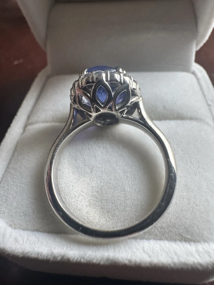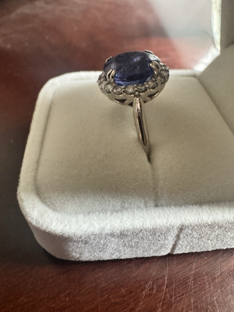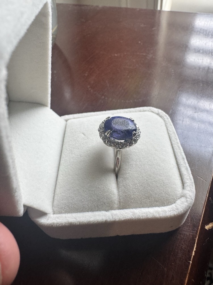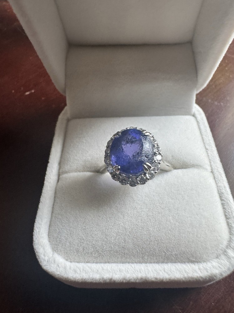 Stunning Custom Tanzanite & Diamond Halo Ring – 14K White Gold Offered for sale is an exceptional oval Tanzanite and diamond halo ring crafted in solid 14K white gold. This elegant statement piece features a vivid bluish-violet Tanzanite surrounded by sparkling natural diamonds in a classic halo setting. ✨ Center Stone: • Natural Tanzanite • Oval Modified Brilliant Cut • Weight: 6.57 carats • Color: Bluish Violet • Tone: Medium Dark • Saturation: Vivid • GIA Type I – Eye Clean • Approx. Measurements: 11.54mm x 10.07mm x 7.56mm ✨ Accent Stones: • 18 Round Brilliant Cut Diamonds • Approx. 0.03ct each • Total Diamond Weight: 0.54ct (estimated) • Color: I–J • Clarity: SI1 ✨ Ring Details: • Metal: Solid 14K White Gold • Total Gem Weight: Approx. 7.11ctw • Combined Gem & Metal Weight: 7.3 grams • Setting: Split 4-prong center with oval diamond halo • Condition: Pre-owned (please see photos for details) This ring carries a previous insurance appraisal value of $10,609 (2021). Please note that insurance appraisals reflect retail replacement value and not resale value. The tanzanite displays rich color with natural inclusions consistent with genuine gemstones. It is an eye-catching piece perfect for a statement ring, cocktail ring, or alternative engagement ring. 📦 Ships securely packaged and insured. 📄 Copy of appraisal available upon request.