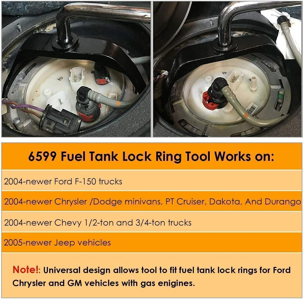 Features: FITMENT VEHICLE: Fit for Dodge Ram 1500 2500 3500 4500; for Dodge Charger Dodge Challenger SXT; for 2007-2012 Hyundai Sante Fe;for Chevy Silverado Malibu Maxx Colorado Avalanche; for SAAB 9-3 03-11; for Saab 9-5 2008; Trailblazer Camaro SS for Hyundai Elantra Tuscan Sonata FOR AUTO MODELS: for 2005 Mercury Montego; for 2005-2006 Pontiac Bonneville & G6; for 2006 chrysler 300c; for 2011 Kia Sorento; for Jeep Wrangler TJ Jeep Compass; for Ford Explorer Ford F150 Ford Ranger; for Mercury Mariner; for Nissan Pathfinder Sentra Frontier A MUST HAVE TOOL: Using a hammer and screwdriver to loosen the locking ring would be history! This tank lock ring tool will help tackle the job of replacing the fuel sender FAST and EFFECTIVE without damaging the rings. EASY TO USE: Used with a 1/2" drive ratchet or breaker bar. Easily removes and installs lock ring on the fuel tank when servicing the fuel pump or fuel sending unit. 100% SATISFACTION GUARANTEE: Superior 42CrMo steel material with black Oxide finish resisting rust and corrosion. If you're not 100% satisfied with our tool, simply return it for a full refund in 30 days. Premium Support & 12 Months Warranty. For Reference: Compatible with Dodge Ram 1500 2500 3500 4500; Compatible with Dodge Charger Dodge Challenger SXT; Compatible with Hyundai Elantra Tuscan Sonata; Compatible with Hyundai Sante Fe 2007-2012; Compatible with SAAB 9-3 03-11; Compatible with Saab 9-5 2008; Compatible with Chevy Silverado Malibu Maxx Colorado Avalanche Trailblazer Camaro SS; Compatible with Mercury Montego 2005; Compatible with Pontiac Bonneville & G6 2005-2006; Compatible with Kia Sorento 2011; Compatible with chrysler 300c 2006; Compatible with Ford Explorer Ford F150 Ford Ranger; Compatible with Mercury Mariner; Compatible with Nissan Pathfinder Sentra Frontier; Compatible with Jeep Wrangler TJ fit for Jeep Compass