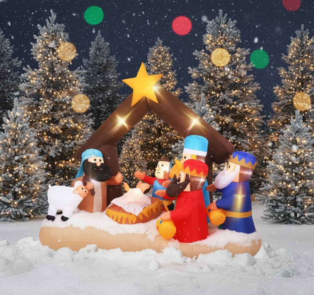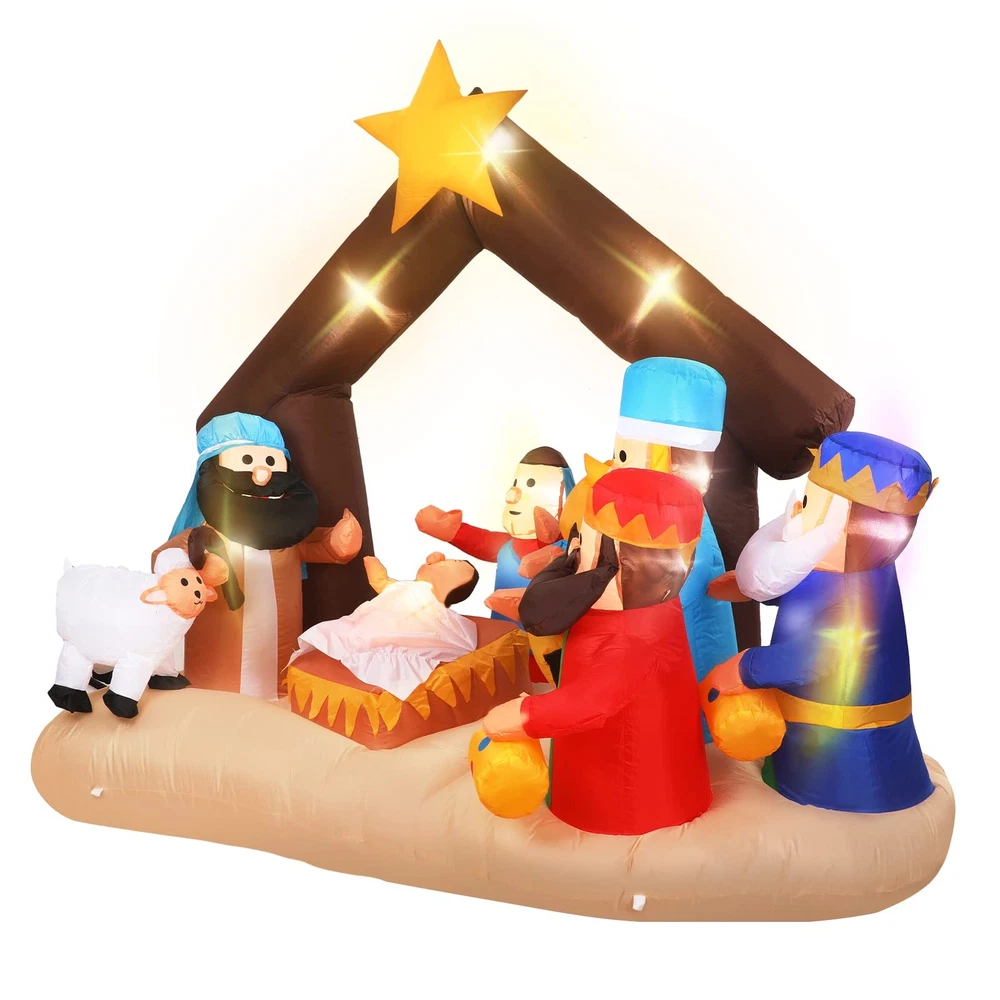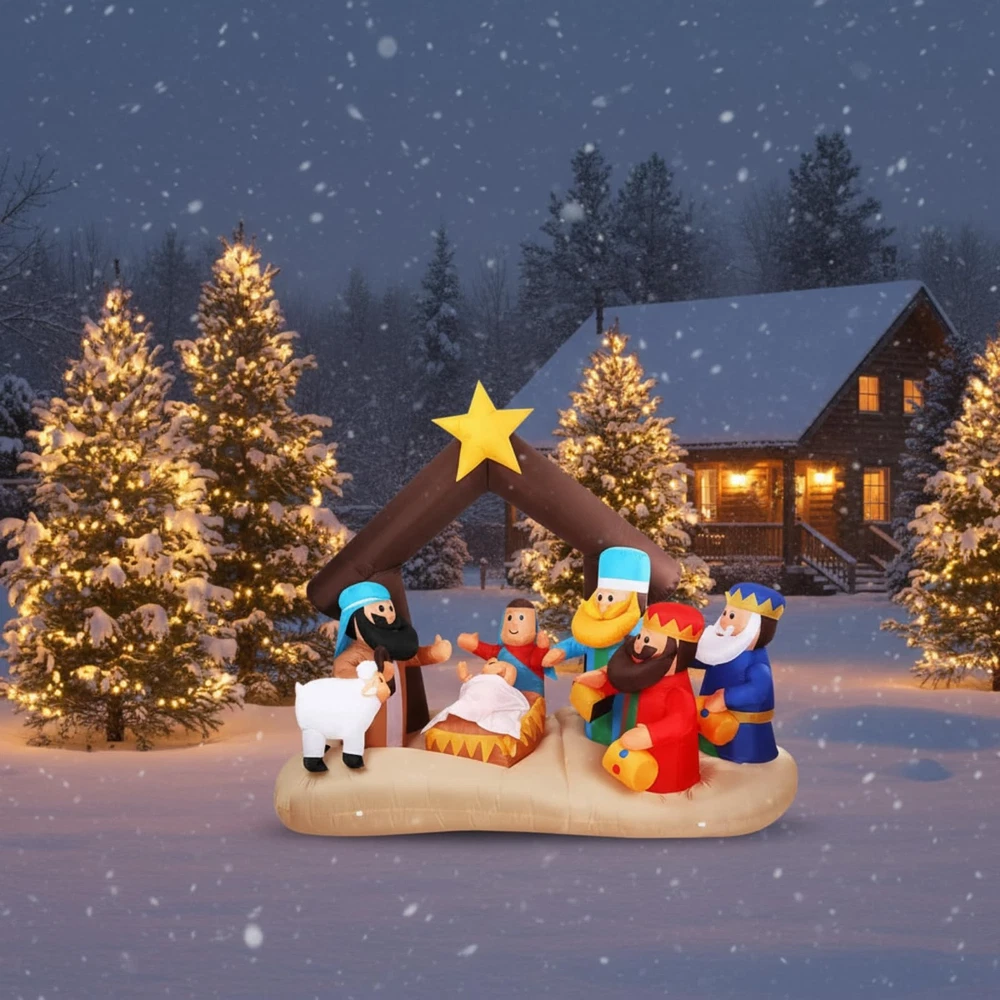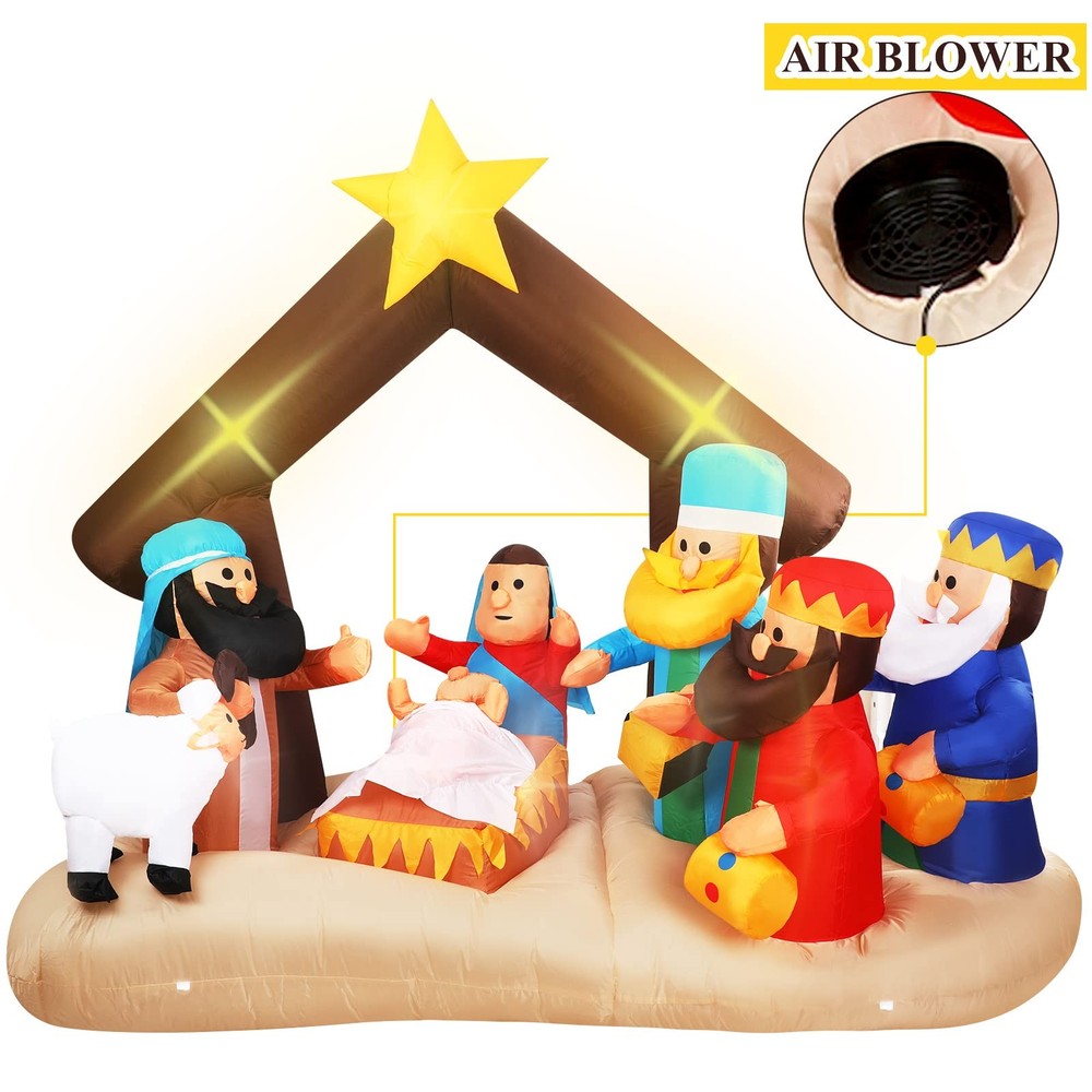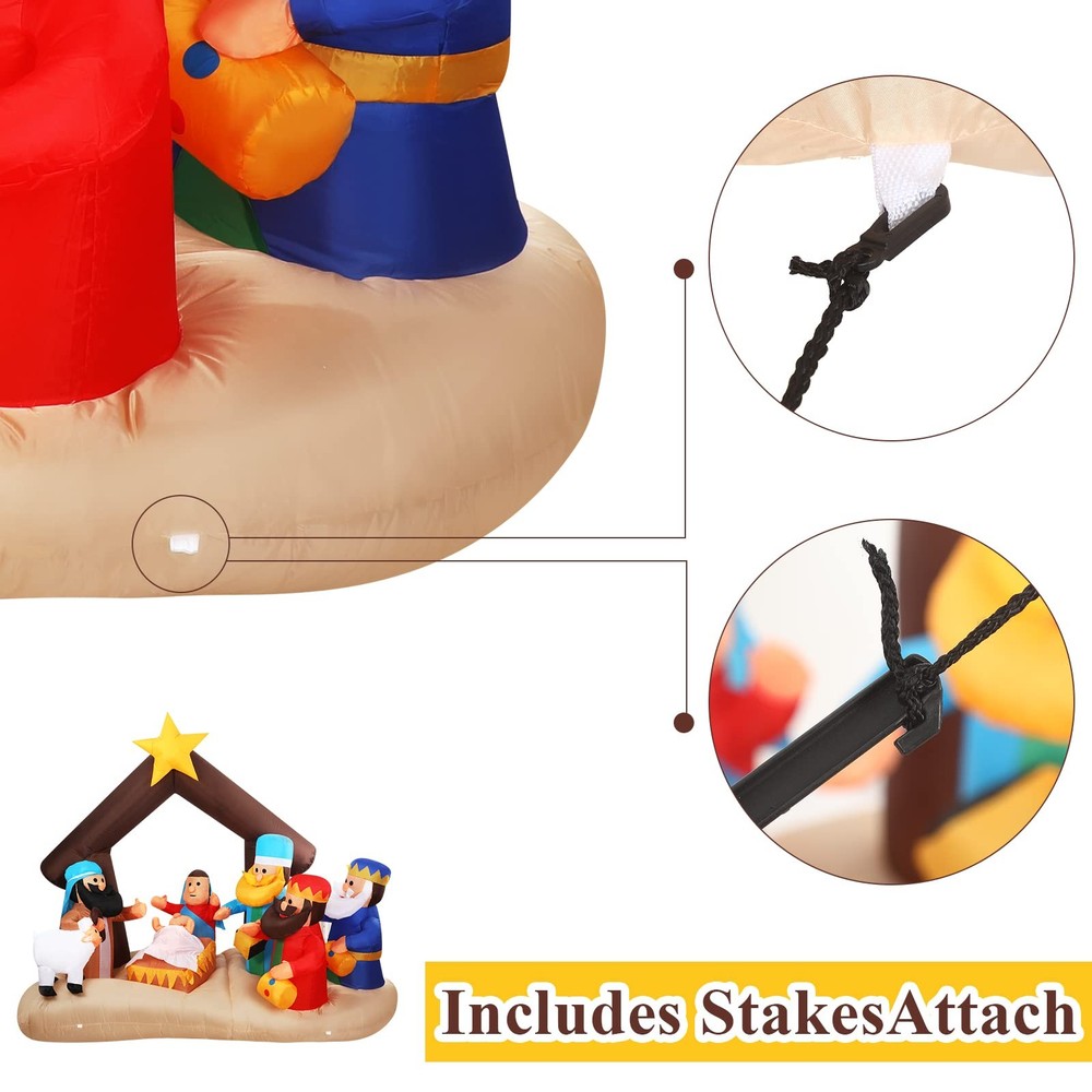 Features: Share with others: You can share lighted outdoor nativity set with your family members, partner and colleagues, they will feel satisfied when they receive this giant decor. Bright garden decor: Large outdoor nativity scene decor is equipped with bright LED lights inside and are lit up at night for a stunning visual experience. Specifications: Material: 190T polyester Color: bright color Size: 6.5 ft in length Package includes: 1 x Christmas inflatable nativity scene decoration Notes: Manual measurement, please allow slight errors on size. The color may exist a slight difference due to different screen displays. The built-in blower is under the product, so please avoid rainwater entering, in rainy days, please take back the product or cover it to avoid damage. What You Will Receive: You will receive 1 piece of Christmas inflatable nativity scene decoration, featuring Baby Jesus, Mary, Joseph, the Three Wise Men, and a sheep under a stable with a glowing star. The set comes equipped with extension and fastening ropes, ground stakes, a built-in sandbag, and a plug with UL certification, ensuring quick setup and secure outdoor or indoor display Perfect Size & Bright Lights: This Christmas inflatable decor measures about 6.5 ft long, large enough to create a stunning focal point in your yard, garden. Built-in bright LED lights make the nativity scene vivid and eye-catching at night, spreading a warm and festive glow throughout your holiday setting Weather Resistant Material: Made of quality 190T polyester fabric, this Christmas inflatable nativity scene is strong, tear-resistant, and waterproof, ensuring it can withstand wind, rain, and snow. Keep the decoration looking bright and inflated throughout the holiday season, perfect for both indoor and outdoor Easy Setup & Stable Design: Inflatable Christmas nativity scene can be quickly inflated within minutes using the built-in blower. Simply plug it in, and it will automatically expand into shape Wide Application: Inflatable Christmas decoration is suitable for many occasions, such as Jesus themed party decorations, Christmas parties, indoor and outdoor party props, nativity patio decorations and so on, adding a strong festive atmosphere to you