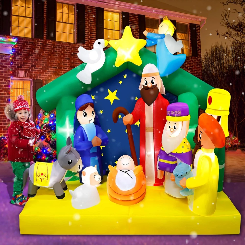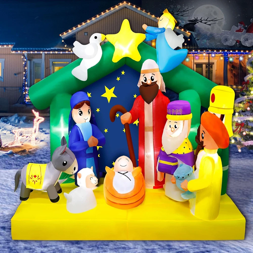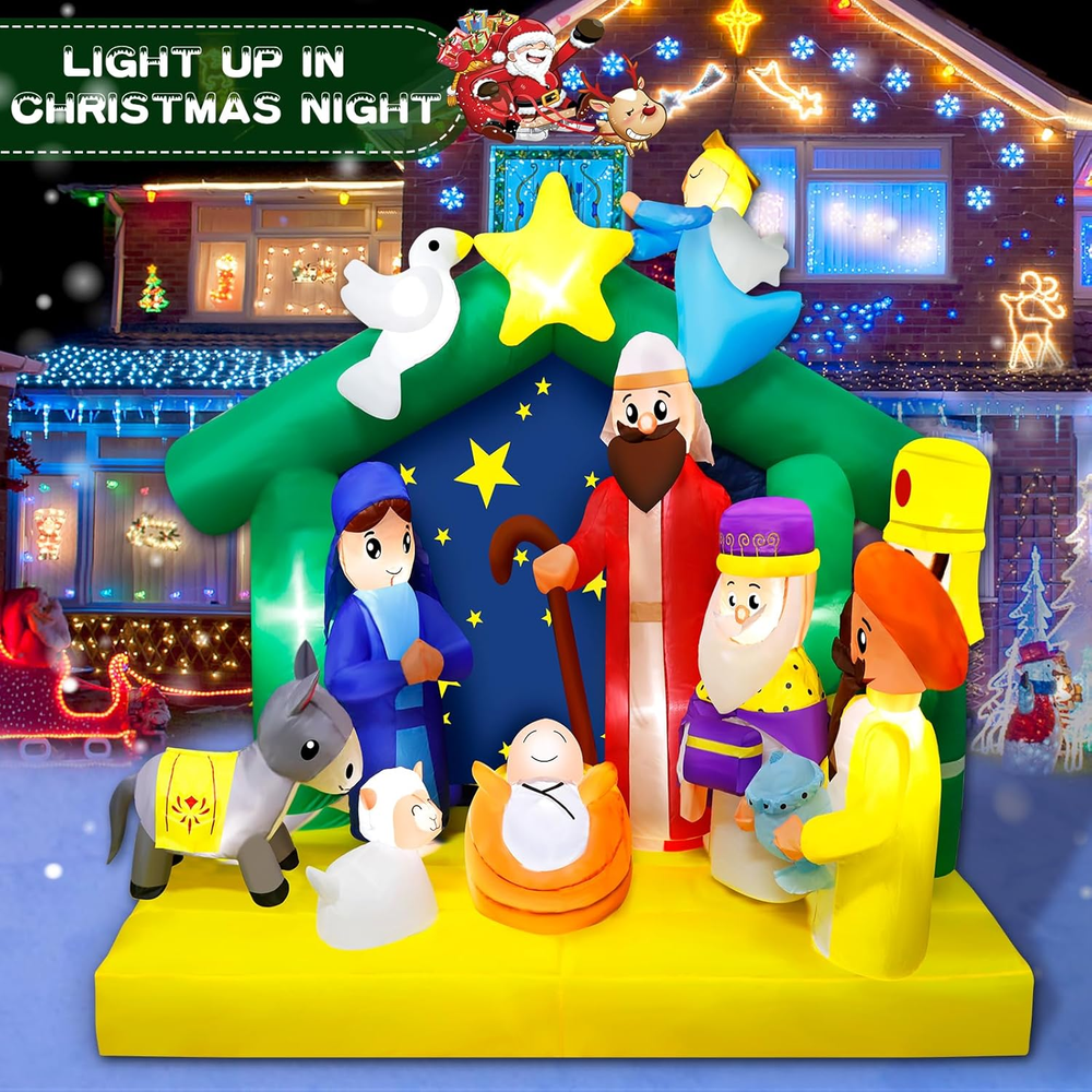 CHRISTMAS NATIVITY SCENE - A 6.5ft Christmas inflatables nativity scene depicts Mary and Joseph welcoming the birth of Jesus, the lovely sheep and donkey surrounding baby Jesus, and three kings send their wishes to little Jesus. Beautiful and warmer nativity scene inflatable Christmas decorations, adding a strong Christmas. BUILT-IN LED LIGHTS - Christmas blow up decorations built in 14 LED lights inside the inflatable outdoor nativity scene, glowing on Christmas night and light up your garden, attracting everyone's attention and soaking in the joyful holiday, making your house a big point in the neighborhood. EASY TO SET UP - Christmas inflatable outdoor decorations size: 6.5ft wide x 5.4ft tall, just zip the zipper and plug in the adapter, powerful blower quickly inflates it in a few minutes. Equipped with 6 ground stakes and 2 ropes. After the holiday, only open the zipper and deflate it, you can easily store blows ups for next year's use. WEATHER RESISTANT - Christmas outdoor inflatables made of polyester, which is thickened and waterproof, weather-resistant, fade-resistant, fixed a sandbag into the inflatable bottom, add weight to prevent it from being blown over, Whether it's rain, snow, or strong winds, you can rest assured. NATIVITY INFLATABLE CHRISTMAS DECORATIONS- Outdoor Christmas nativity sets with 6 pcs ground stakes, 2 ropes(2m), and 2 hooks. Perfect outdoor nativity scenes for garden, lawn, porch, front door and holiday decor, bring a great Christmas holiday experience, blow up nativity scene create a for Christmas Day. Product description
