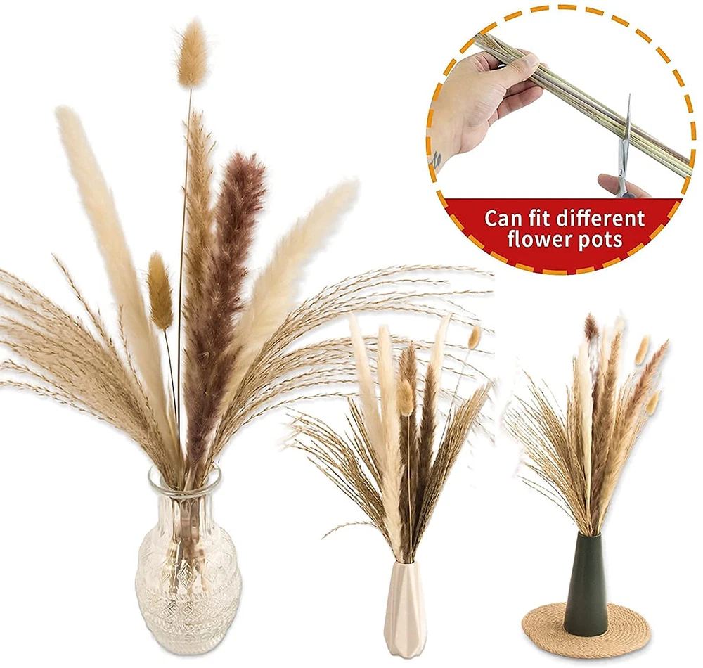 CAREFUL SELECTION: All stems in this pompas grass are natural dried plants and carefully selected by us. special faux pampass grass bundle manufacturing technique ensures superior quality, and dried pompous grass lasts up to three years.(without pampas grass vase) VARIOUS COMBINATIONS: beige pampas grass dried flower bouquet contains 15 white pampas grass, 15 brown pampa grass, 10 dried bunny tails, and 25 reed grass, Approximately 17 inches in height. You can trim the overall, stem length of the pompass grass according to the size of the pot WIDE RANGE OF USES: these short pampas grass small are very suitable for home decor, wedding decoration, dried floral arrangements, boho room decor, bedroom, living room, dining room and boho vases for pampas grass, etc. you can dried pampas grass decor for wedding gifts, Halloween, Thanksgiving, Christmas, etc. WARM TIP: You can fluff the pompass grass branches natural in the sun for a few hours before use. Shedding is normal because this pampus grass is a naturally dry plant. Once placed in a vase and hairspray, the shedding will be minimal. pompas floral may have some odor, please leave pompuss grass loose in a well ventilated area for 1-2 days. Greener than artificial pampas grass SATISFACTION GUARANTEE: Your satisfaction is the only way for us to go further, we attach great importance to our customers' experience and satisfaction in buying natural pampas grass bouquet large, if you are not satisfied with mini pampas grass, please contact us as soon as possible, thank you for your support. We attach great importance to customer satisfaction and buying experience, so we pompas grass dried flowers is carefully selected before shipment and placed neatly in the shipping package to ensure that each bundle is flawless if it appears that you are not satisfied with the pompous grass received, please contact us and we will give you a satisfactory answer. Your satisfaction is the only way for us to go further. Various combinations: made of naturally dried white pompuss grass, brown pampas grass, reed grass, and rabbit tail grass. More environmentally friendly than fake pampas grass tall. Perfect size: artificial pampas bouquet is about 14-17 inches, You can trim the length of the poles to your liking and simply add style to any home, event or retail space. Wide range of uses: small pampas grass decor are perfect for wedding bride decorations, bohemian home decorations, baby bathroom centerpiece, bridal gifts, kitchen tables, dressing rooms, dining rooms, living room tables, offices, farmhouse decorations, party gardens, balconies and more to create a warm and natural atmosphere. Note: Take out the mini cream pampas grass, pompass grass branches may be crushed and not fluffy during the long distance transportation. Leave the pampas grass bulk in the sun for a few hours and dried short pampas grass will regain its fluffy state. Apply hairspray and the shedding will be minimal.