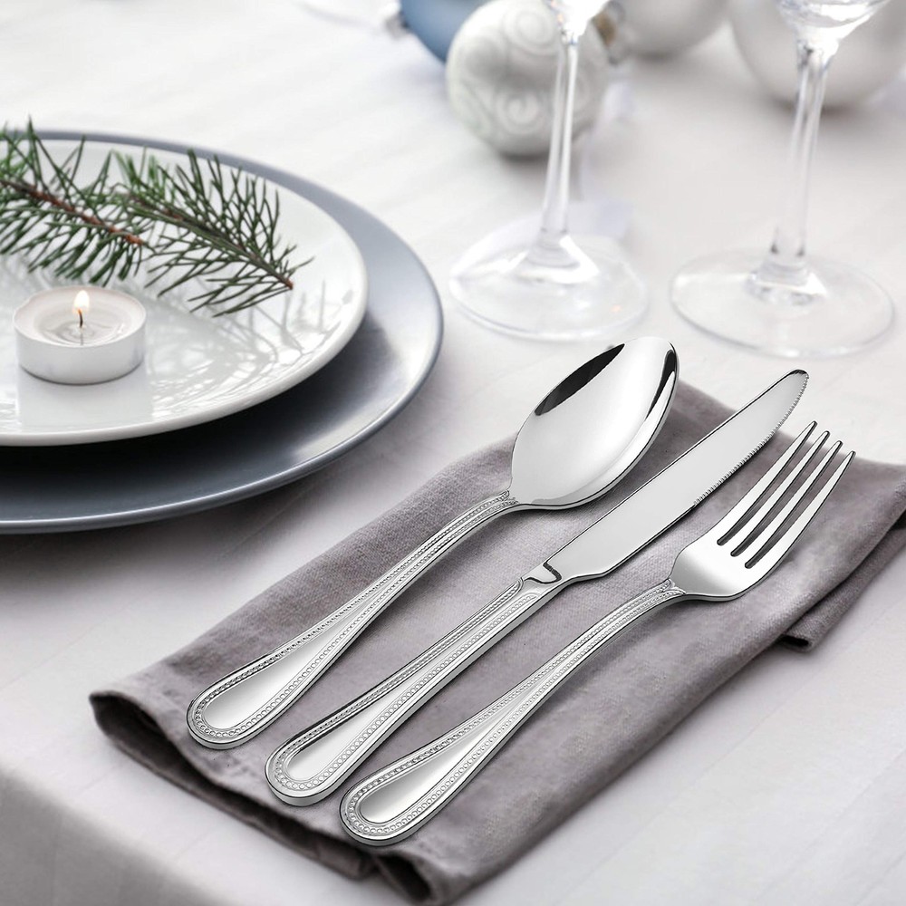 SERVICE FOR 12 - 65pcs stainless steel silverware set comes with 12 Dinner Forks, 12 Dinner Spoons, 12 Dinner Knives, 12 Teaspoons and 12 Salad Forks , Plus 5 Serving Pieces: Serving Spoon, Slotted Serving Spoon, Serving Fork, Pie Server, Butter Spreader, Ideal for everyday use, entertaining, wedding, hotel, restaurant and more, Also as a decent gift HEALTHY MATERIAL - Made of high quality 18/0 stainless steel to ensure rust resistance, Non and nickel free, Healthy and sturdy as everyday use eating utensils, Dishwasher Safe PROPER WEIGHT - Perfectly weighed, They feel luxurious in your hands, Not too heavy nor too light, Good balance and control when using, Surface of the tableware is carefully mirror polished without burrs FASHIONABLE APPEARANCE - Elegant style with beautiful pearled-edge handle shape is easy to attract eyeballs, Making every meal like a high-end banquet and bring a pleasant dining atmosphere, Matching different tablecloths, The design of the handle can highlight more styles EXCELLENT SERVICE - We have a very efficient after-sales service team, If you have any questions about our products, Please feel free to us, We will try our best to give you a satisfactory answer