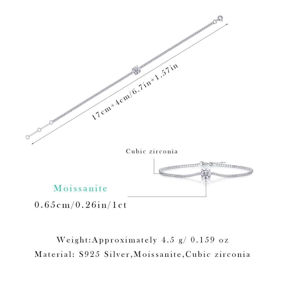 This bracelet is absolutely stunning! The moissanite stones sparkle brilliantly, and the solid sterling silver feels durable yet elegant. Perfect for both special occasions and everyday wear—it adds a touch of luxury to any outfit. The craftsmanship is impressive, and it arrived quickly, securely packaged. Highly recommend for anyone looking for a high-quality, affordable alternative to diamonds!