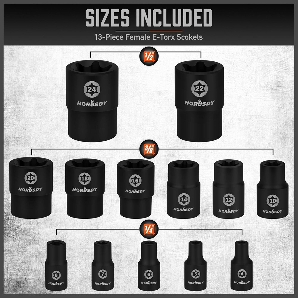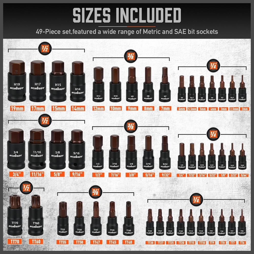 HORDSY 66-Piece Allen & Torx Bit Socket Set - S2 Steel SAE/MM, Star & Female E-Torx Sockets, 4 Impact Socket Adapter About this item PREMIUM QUALITY - Crafted from heat-treated CR-V and S2 alloy steel, our 66-piece Torx bit socket set ensures durability and corrosion resistance, ideal for any automotive mechanic or DIY enthusiast. COMPLETE KIT - This comprehensive set includes T6-T70 star bits, E4-E24 E-Torx, and both metric and SAE hex socket bits, providing the perfect tools for any task, whether using a driver, wrench, or ratchet. ORGANIZED STORAGE - The compact and sturdy case keeps all 66 pieces well-organized and easy to carry, ensuring that your tools are readily accessible wherever you need them. VERSATILE COMPATIBILITY - Perfect for use with manual torque tools, our Torx/Star bit set includes all necessary sizes for bicycles, cars, appliances, lawn equipment, machinery, and any other tasks. EASY IDENTIFICATION - High-contrast laser markings on each socket make size identification quick and accurate, streamlining your workflow and eliminating guesswork in finding the right tool.
