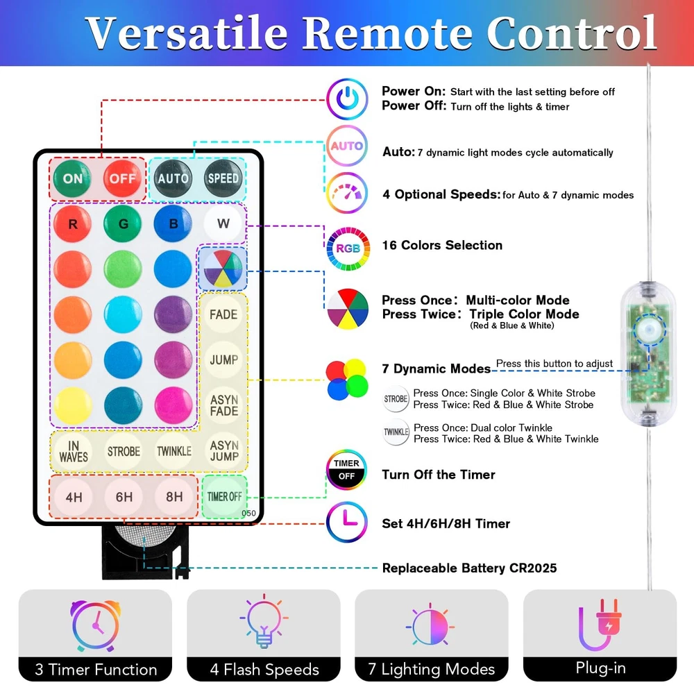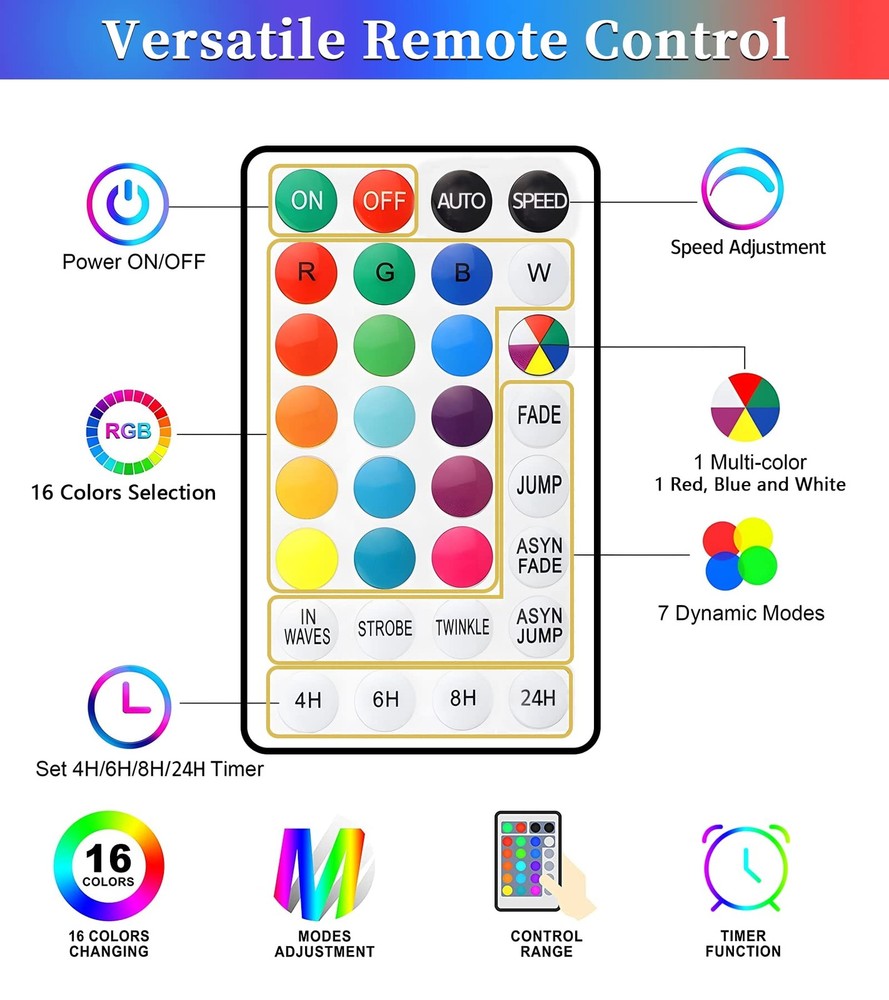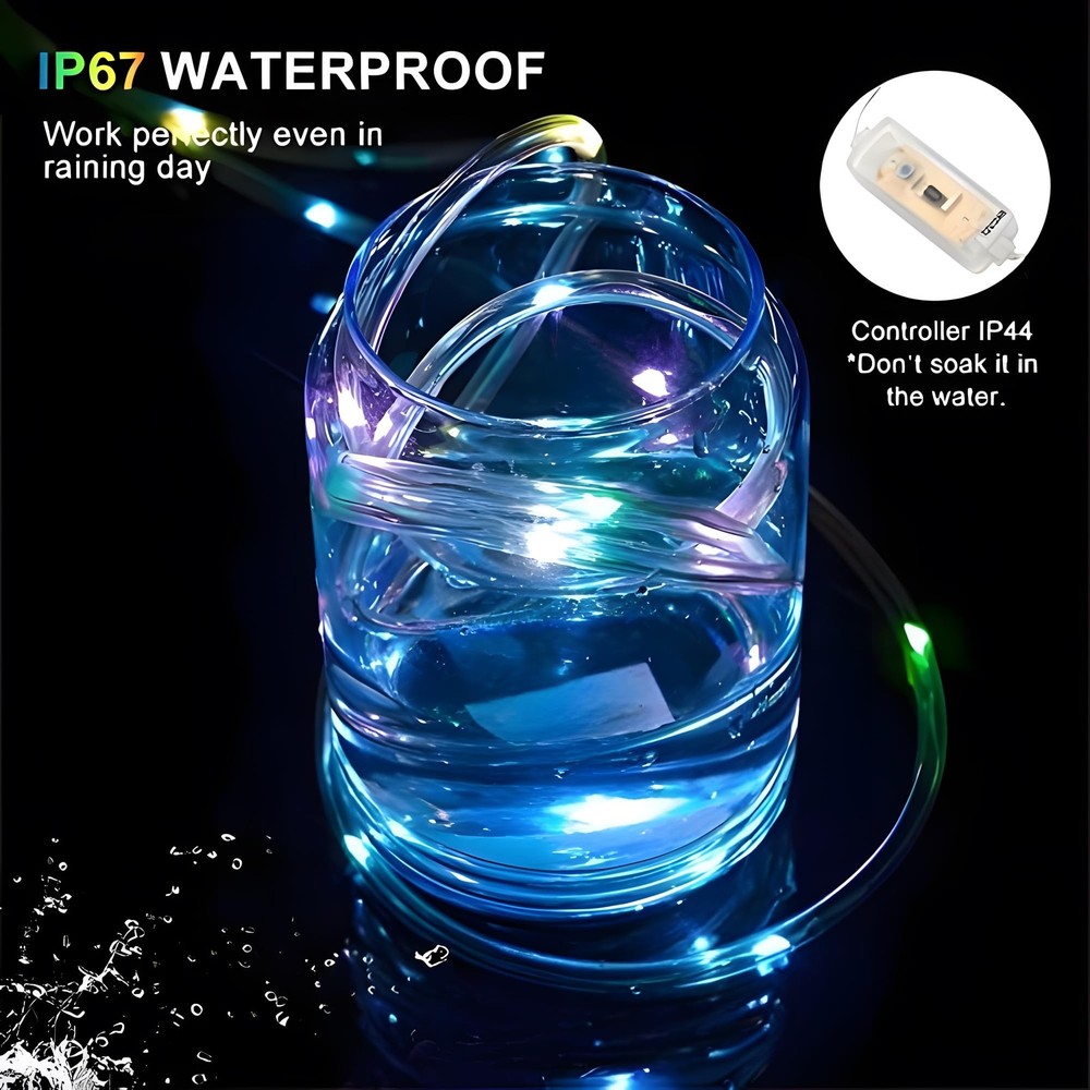 LED Rope Lights 66ft 200 Leds Outdoor String Lights Specifications: Length of String lights: 66ft Number of LEDs: 200 pcs Lamp spacing: 3.9'' Light Color: RGB (16 colors and multi-color) Waterproof: IP65 (The power adapter has no waterproof function, so please keep the adapter away from water.) Material: Plastic, PVC, and Copper Lighting mode: Fade/ Jump/ ASYN Fade/ ASYN Jump Package Include: 1 x 200 leds tube 1 x Lead wire with controller box 1 x Power Adapter 1 x User manual 1 x Remote controller 16 COLORS CHANGING STRING LIGHTS: With 16 vibrant colors to choose from, our outdoor led lights are perfect for adding a touch of color and creativity to any occasion. Whether you want to set a romantic mood with soft pinks and reds on Valentine's Day, celebrate St. Patrick's Day with festive green, or create a fantastical ambiance with orange and purple for Halloween, these lights meet your requirements. MEMORY & TIMER FUNCTIONS: Our rope lights are equipped with a multifunctional remote that allows for your customization. With the timer function, you can set the lights to automatically turn off after 4, 6, 8, or 24 hours. The remote also allows you to adjust the speed of the 7 lighting modes with the “speed” button. Additionally, the memory function ensures that the lights will remember your last setting even after being turned off by the remote, eliminating the need to reset them every time. VERSATILE LIGHTING MODES:With 7 lighting modes to choose from, you can easily set the perfect ambiance for any occasion. The available modes include Fade, Jump, ASYN Fade, ASYN Jump, In Waves, Strobe, and Twinkle. With upgraded color options available, you can brighten up your Christmas decorations with multicolored modes. If you're decorating for July 4th, simply press the multicolor button twice to switch to the red, white, and blue lighting modes. IP67 WATERPROOF: Our led rope lights are designed to withstand various weather conditions, including rain, wind, snow, and fog, making them an ideal choice for outdoor & indoor decorations. Whether you're hosting a party, celebrating Christmas, Halloween, Thanksgiving, or any other special occasion, our rope lights are a perfect addition to your decor. WIDELY INDOOR & OUTDOOR USED: The IP65 waterproof rating of these led rope lights outdoor waterproof makes them suitable for a wide range of indoor and outdoor uses. You can wrap them around a tree, backyard fence, or porch for a festive touch, or use them to decorate your living room or bedroom. They're also great for outlining your deck, window, door, pathway, or walkway. EASY TO INSTALL: The sturdy yet thin covering makes it easy to wrap the lights around any surface or object. Additionally, our colored rope lights are lightweight, making them easy to maneuver and install. The lightweight design allows for simple installation using either clear packing tape or clips.