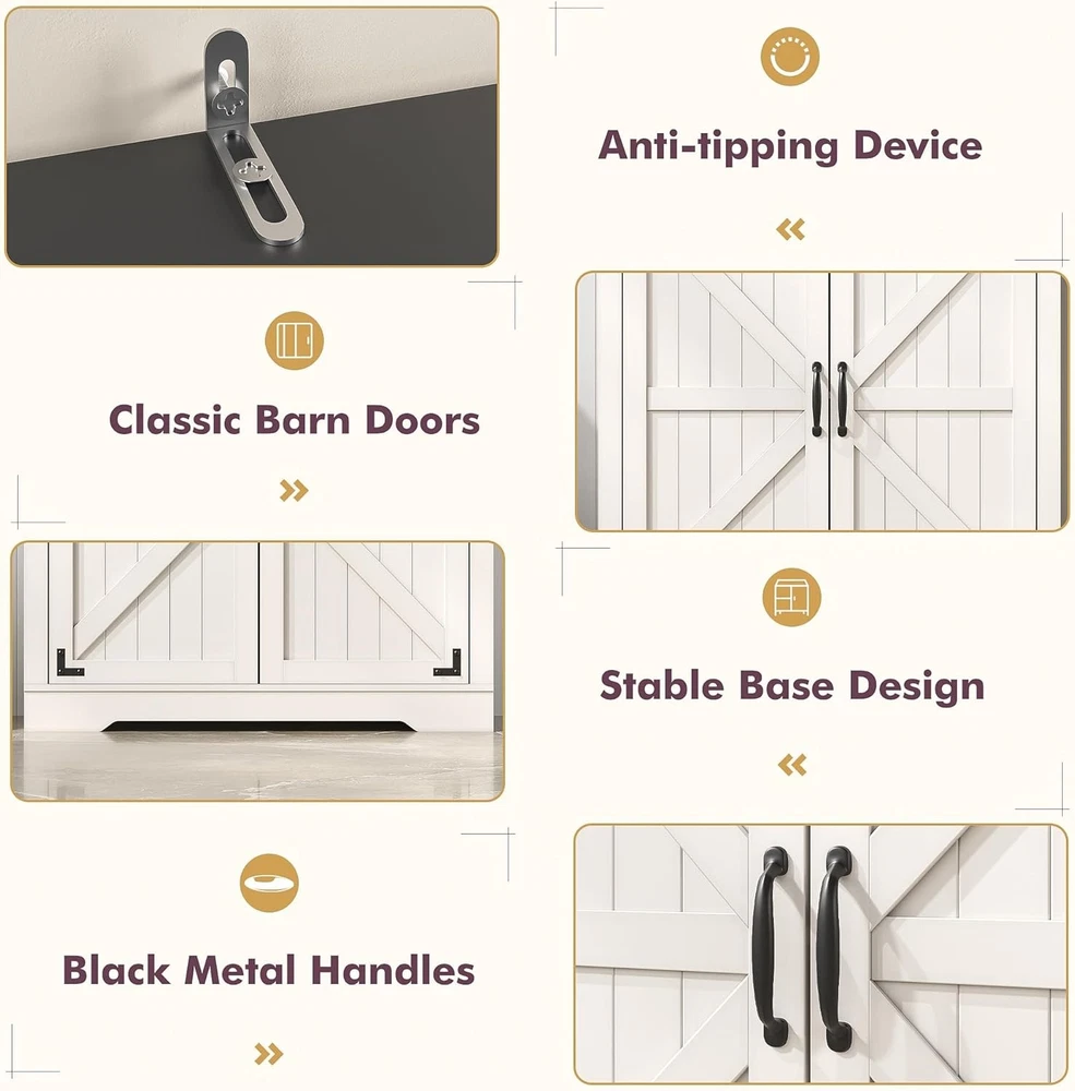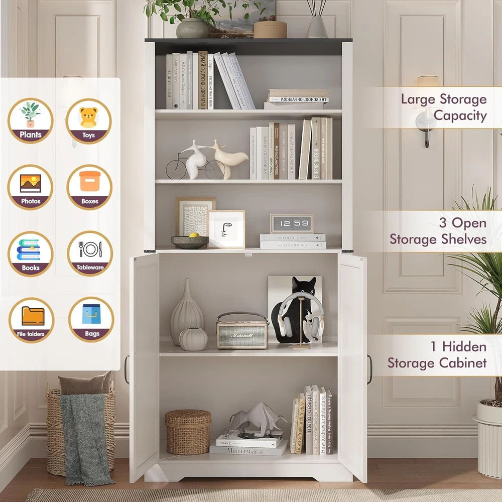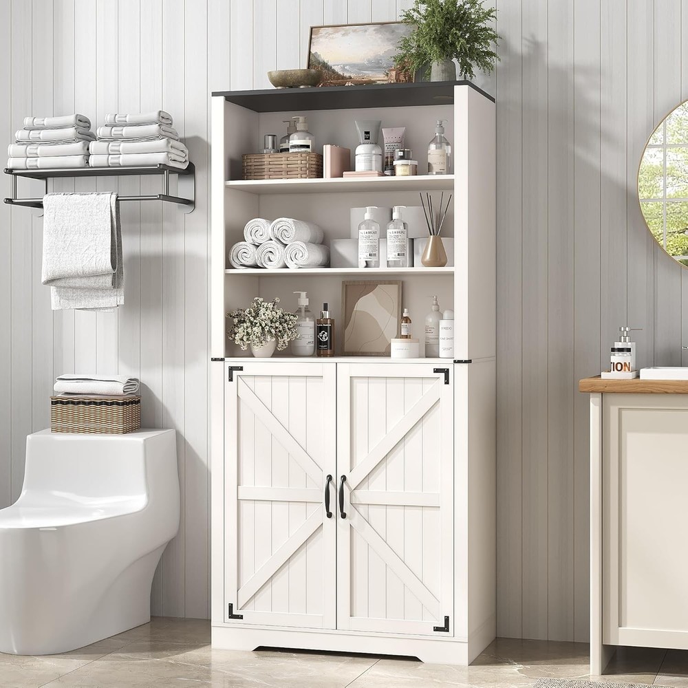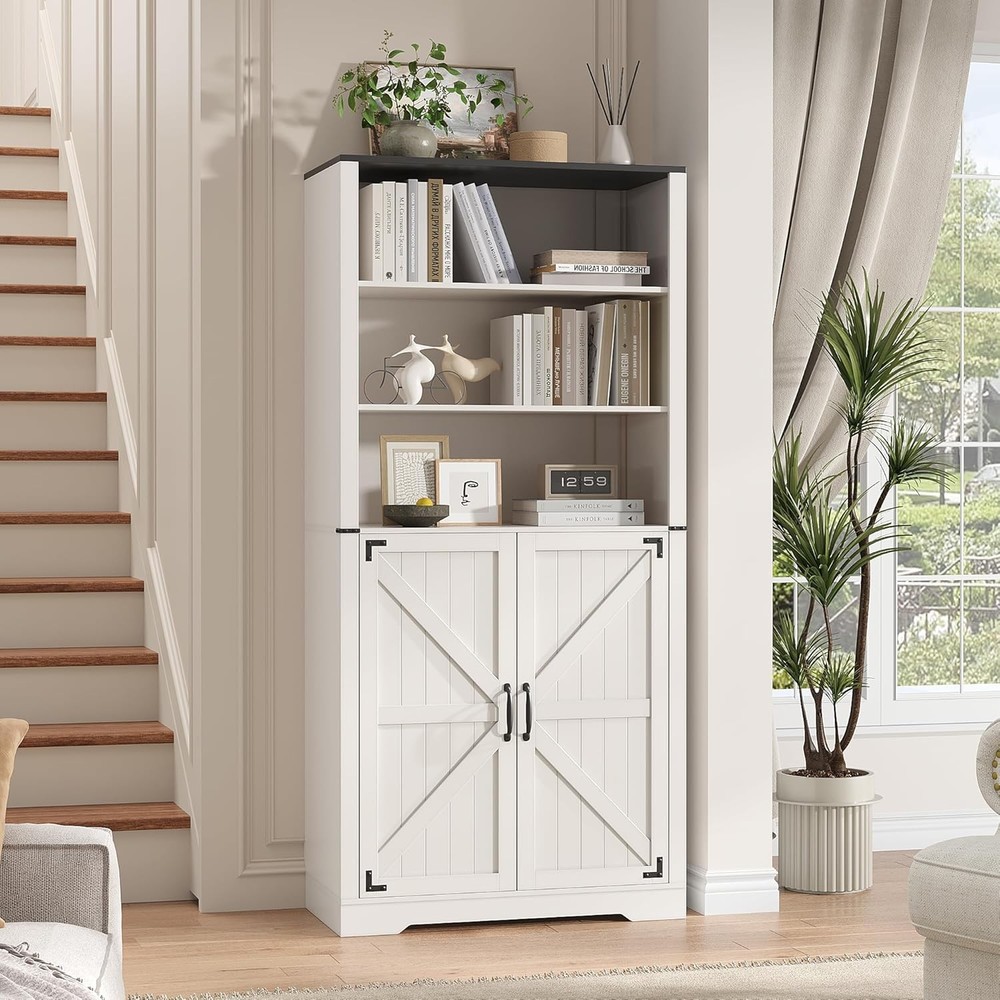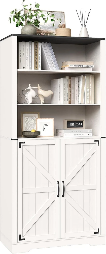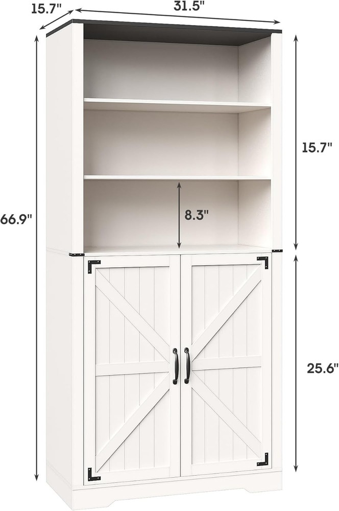67" Tall Kitchen Pantry Cabinet, Farmhouse Storage Cabinet with 2 Barn Doors & Open Display Shelves, Bathroom Storage Cabinet, Versatile Large Wood Cupboard Hutch for Dining Room, Living Room Product Description About this item Ample Storage Space & Adjustable Shelf: Size: 15.7D×31.5W×67H. This 5 tier kitchen pantry cabinet consists of 3 open display shelves and 1 storage cabinet, providing ample storage space. The shelves inside the cabinet are adjustable, allowing you to customize the space according to your needs Farmhouse Storage Cabinet: Our barn door storage cabinet features a classic white finish, black top, simple lines, and elegant door handle design. Perfectly integrating modern aesthetics with rural elements, it can easily blend with most decorative styles and is the perfect choice for kitchens, dining room, living room, bathrooms, or study rooms Durable & Stable Construction: This tall storage cabinet is made of high quality wood and hardware for a sturdy and durable construction. Each shelf can hold up to 25/35 pounds. The stable base and anti-tipping design enhance the overall stability and load-bearing capacity. You don't have to worry about the quality at all, this tall cabinet is your best choice Multi-functional Use Scenarios: Engineered for versatile spaces! Perfect as a kitchen storage cabinet, pantry cabinet, bathroom storage cabinet, bookshelf, or entryway organizer, combining farmhouse aesthetics with modern functions to create a comfortable living space Easy to Assemble: All parts and accessories of the storage cabinet are labeled. The instructions are easy to understand, so there will be no jamming during assembly. If you have any questions, please feel free to contact us and we will reply within 24 hours Tall Storage Cabinet with 2 Barn Doors and Open Shelves Different areas are reasonably divided to meet diversified storage and display needs, easy to create a neat and beautiful home space! Previous page Kitchen Pantry Cabinet Whether it's creating a neat and organized cooking environment or showing off your living style, it's easy to do, adding practicality and beauty to your kitchen. Bathroom Storage Cabinet Let the bathroom to say goodbye to clutter, all kinds of items placed in an orderly manner, every time you use a happy mood, easy to create a neat and cozy bathroom space. Farmhouse Bookshelf It can be used to place books and favorite decorations, with a properly planned layout, you can say goodbye to clutter and create a quiet, cozy and stylish atmosphere for reading and working. Next page Farmhouse Style Cabinets are Both Stylish and Functional SPECIFICATION Material: Engineered Wood Color: White Product Dimension: 15.7"D x 31.5"W x 66.9"H Weight: 78.3lbs Max.Load: Each Shelf 25/35LBS Unique Design: 2 barn doors, 3 open display shelves, adjustable shelf Number of Doors: 2 Number of Shelves: 3 Style: Farmhouse, Rustic Applicable Scene: Tall Storage Cabinet for Kitchen, Dining Room, Bathroom, Living Room, Study Room... Hidden storage cabinet can effectively prevent dust and protect private items; 3 open display shelves are convenient for displaying favorite items and adding a touch of lifestyle.