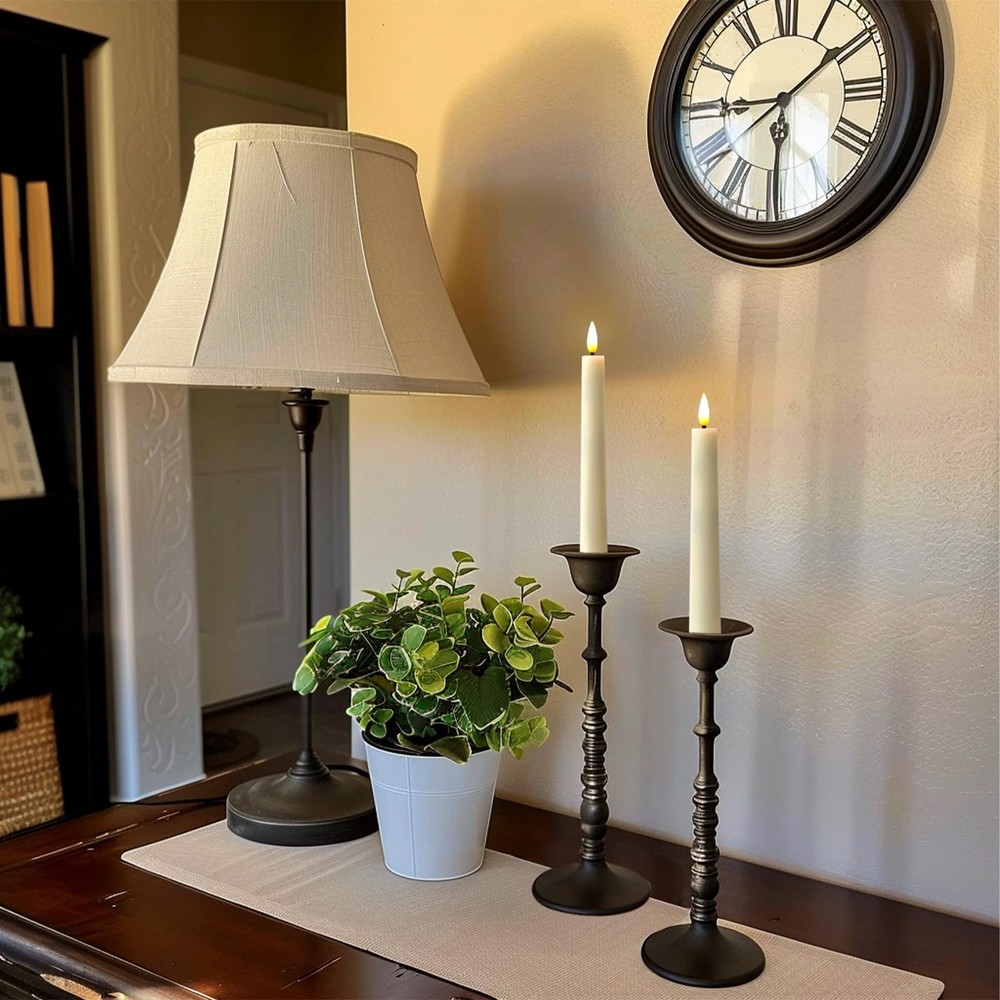 LED flameless taper candles battery operated with automatic timer remote Realistic flame and Appearance:These realistic LED taper candles are made of plastic that is unmelted and won't crack or deteriorate over time, the underside of the flame is adorned with melted and dripping wax, the 3D flame design with flickering warm yellow light makes the candle even more lifelike and perfectly mimics a real burning taper candle. Remote Timer Dimmer: has customized all the functions you need. (1). 2 light modes, simulate flickering flame light or steady light. (2). The 2-4-6-8 hours timer function saves your time to turn these flameless candlesticks on and off at the same time every day. (3) Create the warmest lighting effect through the dimmer to make it brighter or softer depending on the mood you looking for. Safety LED Battery Powered: Powered by 2 AAA batteries (Not Included), these flameless candles taper are fireless, dripless, and smokeless, never worry about your kids or pets getting hurt when using these led taper candles, LED candlesticks provide a safe alternative to traditional taper candles. Height 6.7”* Diameter 0.78”: The 6.7-inch window candle height is perfect for windowsills, fireplaces, and dining tables. Creating a romantic or warm atmosphere can become the best adornment. It will be perfect decorations for weddings, christmas or thanksgiving. Package and Service: Each package contains 6 pcs led taper candles, 2 pcs 10-key remote. Each battery powered taper candle is thoroughly and rigorously tested before sale, Avoid using them in high-temperature or high humidity environments. If any problems show up, please our Customer Support Team, we will always be at your service.