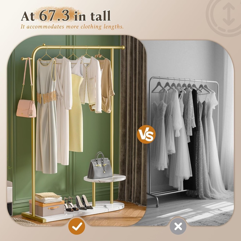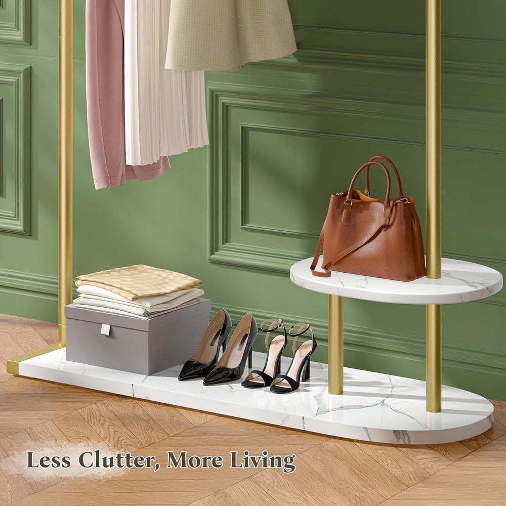Product Description Modern Gold Clothing Rack with Two-tier Storage Less Clutter, More Living 3-in-1 Storage Solution Can it hold heavy winter coats? Yes, the gold coat rack can hold heavy winter coats, as it has a load capacity of 242 pounds. What is the height of this coat rack? This golden clothing rack stands at 67.3 inches tall, making it suitable for garments of all lengths — even long dresses fit with ease. Is the base made of marble? Not quite — it’s made from 2.5cm-thick PB board, which is not only lightweight and durable but also scratch-resistant and ideal for everyday use. Where can this gold clothing rack be used? Whether in your home or a boutique, this rack’s sleek and modern design blends effortlessly with any décor — adding a stylish and luxurious touch wherever it goes. On Aug 6, 2025 at 21:08:13 PDT, seller added the following information: