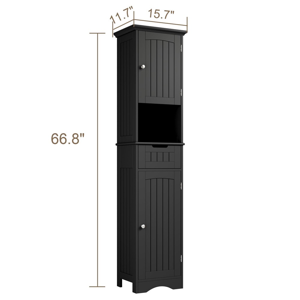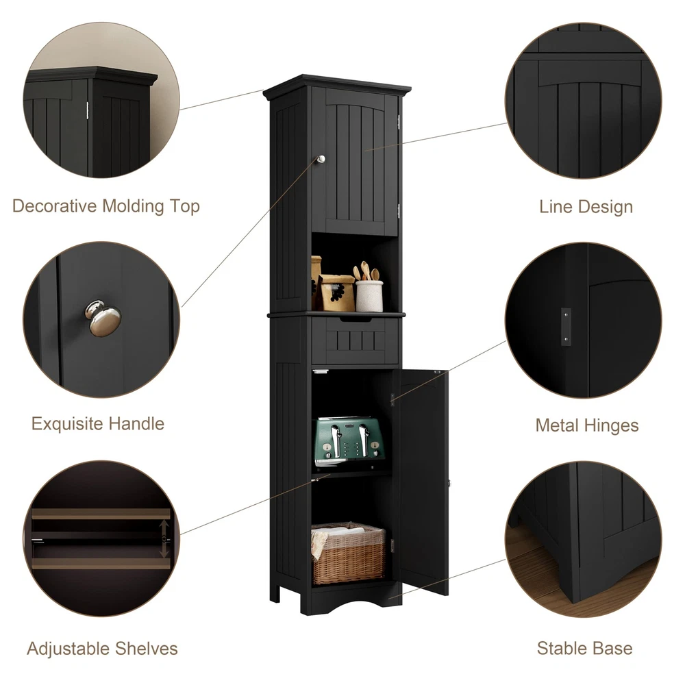 Tall Bathroom Storage Cabinet Freestanding adopting a high and low partition design, organize your personal belongings in an orderly manner. The adjustable shelves will easily adapts to the height of the items, and the fresh design will become a decoration for the room 【Use Every Inch For Storage】:Tall bathroom cabinets freestanding design 2 doors with adjustable shelves, which simultaneously meet the storage needs and sizes of items in the high and low areas. The slim bathroom storage cabinet has an accessible open storage space and small drawers with grooves can help store miscellaneous items, without the need to bend down, allowing the countertop to bid farewell to dirt and clutter. A reasonable and orderly storage design will maximize your vertical storage area 【Freestanding Multifunctional Cabinet】: Bathroom linen cabinet size is:15.7W*11.8D*67H, compared to the bulky size of a spacious cabinet, choosing a tall and thin cabinet can make your room appear larger, flexible, and convenient, making it more roles in the family. A narrow storage cabinet could as a living room cabinet for personalized customized space, a kitchen cabinet storage place for dishes and seasoning, and small spaces can also bring happiness 【Minimalist Bathroom Design】: Classic minimalism, the bathroom floor cabinet has top curved carving, a door panel like a small door paired with round silver handles, warm and elegant, unified pull wire design around the cabinet to showcase details, not too prominent in the room, allowing more light to pass through the surroundings, making it the best choice for bright bathrooms 【Comfortable and Safe】: Narrow tall bathroom cabinets are made of high-quality MDF board, coated with waterproof coating on the surface, durable construction measures long lasting performance. 360-degree opening and closing angle cabinet door, unrestricted access, bottom hollowed-out design away from damp ground, equipped with an anti-tipping device to protect your and your family's safety 【Easy to assemble】: Due to its simple design, labeled accessories, and detailed instructions, you can get a practical freestanding storage cabinet tall narrow cabinet easily and quickly