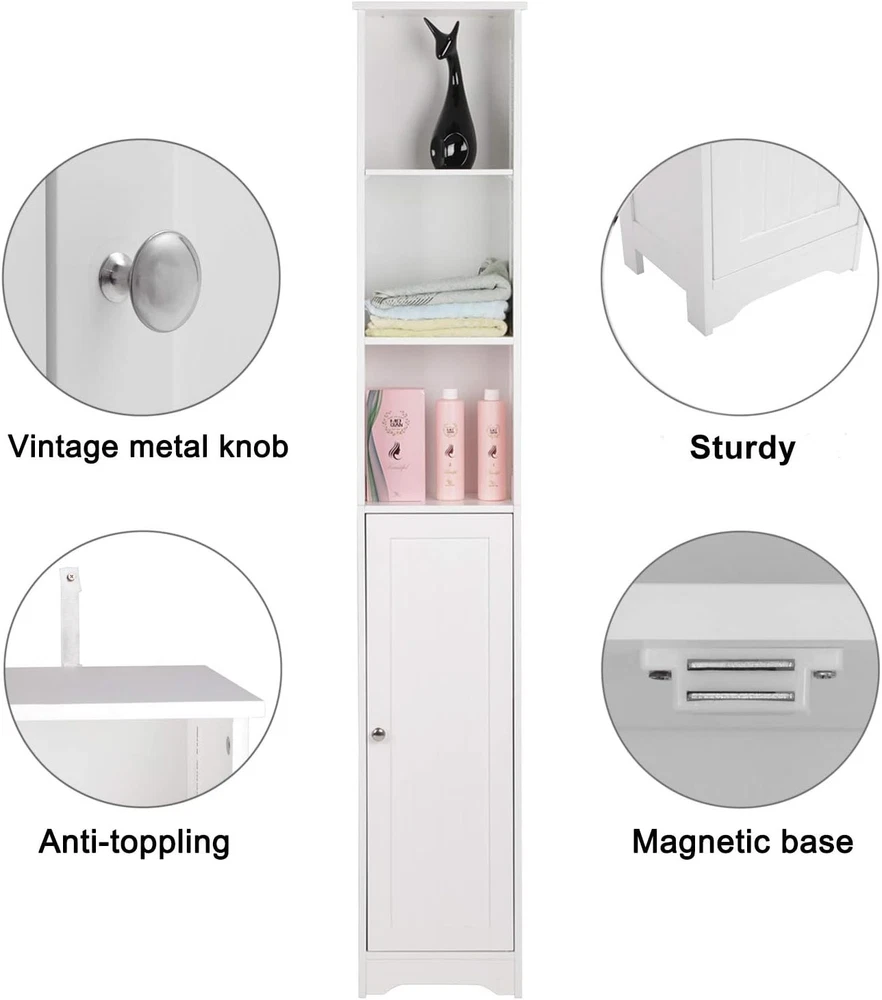 Narrow Cabinet, 67" Tall Slim Bathroom Storage Cabinet 12" Wide White Skinny Linen Cabinet with 3 Open Shelves Single Door Adjustable Shelf Space Saving Corner Pantry Product Description About this item Tall Narrow Cabinet-- This vertical pantry cabinet is not limited to the bathroom. It can be used in various rooms, such as the bedroom for skincare products and cosmetics, the living room for craft supplies, the kitchen for kitchen supplies, and the office for file organization. Skinny Cabinets for Tight Spaces-- This narrow storage cabinet is perfect for small spaces, as it can be assembled in a corner without taking up much floor space. Keep your belongings organized behind the door and on the 3 open shelves. Ample Storage Space-- With enclosed Adjustable Shelves and 3 open shelves, this tower cabinet provides plenty of space to store towels, soap, tissues, and other decorative items. Keep your bathroom supplies neatly organized. Adjustable Shelf Height-- The Storage Cabinet features an adjustable shelf with 3 different heights, allowing you to customize the storage space according to the size of your items. Meet your different storage needs effortlessly. Easy Assembly and Reliable Customer Service--This slim cabinet unit is easy to assemble with included instructions and mounting hardware. If you have any questions or need assistance, our 24-hour customer service and 12-month warranty are here to help. Slim Line Storage Cabinet - Perfect for Maximizing Your Space! Are you looking for a stylish and space-saving storage solution? Look no further! Our 11.81" x 9.45" x 67" narrow cabinet is designed to optimize your living space while adding a touch of sophistication to your home. Crafted from high-quality P2 MDF material, this cabinet is both durable and eco-friendly. Specification Dimensions: (11.81 x 9.45 x 66.93)" / (30 x 24 x 170)cm (L x W x H) Storage Room Dimensions: The First/The Second Layer: (10.12 x 9.45 x 9.25-14.57)" / (25.7 x 24 x 23.5-37)cm (L x W x H) The Second Layer: (10.12 x 9.45 x 10.43)" / (25.7 x 24 x 26.5)cm (L x W x H) Door Dimensions: (10.12 x 29.33)" / (25.7 x 74.5)cm (L x W) Weight: 21.16 lbs / 9.6kg Space-Saving Design: With its slim profile, this cabinet easily fits into tight spaces, making it ideal for small apartments, bathrooms, or anywhere you need extra storage without sacrificing room aesthetics. Space-Saving Design: Three Open Shelves: The three open shelves provide ample room for displaying your favorite decor, books, or essentials. Keep your items organized and within easy reach. Space-Saving Design: Adjustable Shelf: The cabinet features a versatile interior with an adjustable shelf behind the stylish door. It offers three different height options, making it adaptable to your changing storage needs. Whether you want a tall, medium, or short cabinet, it's a breeze to adjust. Elegant Door: The cabinet door adds a touch of elegance to your space, concealing items you prefer to keep hidden. The door is designed for smooth and quiet operation. Upgrade your home organization with our Slimline Storage Cabinet today. Its sleek design, durable construction, and flexible storage options make it a must-have for any modern home. Maximize your space while enhancing your decor!