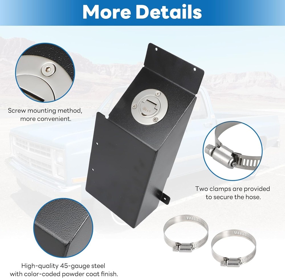 67-87 For Chevy GMC C10 K10 Truck In bed Fuel Filler Gas Door Cap Relocation Kit Welcome!!! We do our best to provide you the most suitable and Affordable products. If you have any problem, please contact us first, we will try our best responding you as soon as possible! Fitment For Chevy GMC trucks (C10 and K10 models) 1967-1987 For 2nd Gen Chevy trucks 1967-1972 For 3rd Gen Chevy trucks (square body) 1972-1987 Features This listing is for Chevy GMC truck In bed Fuel Filler C10 K10 1967-1987 Gas Door Cap Relocation kit. The kit includes a 1.5-inch hose barb fitting for connecting the fuel line. (Not include vapor return hose) Also includes 45° neck fuel filling hardware for hose mounting and 2pc 304 stainless steel 40MM-60MM clamps. Installation with pop rivets. Reposition the fuel filler under the truck bed for increased aesthetics, safety and utility. Aesthetics: Hiding the fuel filling port under the truck bed can improve the appearance of the vehicle's cleanliness and aesthetics. Security: Hiding fuel filling ports reduces the risk of fuel theft. Utility: For vehicles with fuel system modifications, this kit can help reposition the fuel filling port to make it easier to refuel. Specification Condition: Brand New & Premium Quality Type: Fuel Filler Relocation Kit Color: Black Body Material: 18-gauge Steel with a black powder-coated finish Fuel Filler Door Material: 316 Stainless Steel Resists rust and corrosion Package Included 1 Set of Fuel Filler Relocation Kit == We can accept PayPal / Discover Card / Visa / Master Card and so on == 1.Shipping from the US Warehouse by USPS or UPS . Within 1 business days after payment cleared. 2.Delivery time depends on destination,usually arrive 1-5 days after delivery. 3.We have Two US warehouses, the addresses of the warehouses are in Hebron Kentucky and Walnut California. The actual delivery warehouse will based on our inventory and the distance to you. 4.Please offer us your telephone number or your order will be delayed since the courier will need it for the delivery. If you have problems with the following issue please Contact us immediately. 1.You do not satisfaction the item quality. 2.Item do not fit your motorcycle perfect. 3.Item can not reach your expectation. 4.The item arriver be broken. 5.You do not receive the item. 6.Parcel Lost. 7.Receive the wrong item. Please do not worry !!! We are honest ebay dealers ,we will endeavour to resolve all of your problems until you are satisfied. We have poweful partner factory to sure our price can be the best !!Service to every rider over the World is our target !!!! We have professional team to care about every piece of fairing sale from us. Best sevice is the key to make we stand out. Fitment For Chevy GMC trucks (C10 and K10 models) 1967-1987 For 2nd Gen Chevy trucks 1967-1972 For 3rd Gen Chevy trucks (square body) 1972-1987 Features This listing is for Chevy GMC truck In bed Fuel Filler C10 K10 1967-1987 Gas Door Cap Relocation kit. The kit includes a 1.5-inch hose barb fitting for connecting the fuel line. (Not include vapor return hose) Also includes 45° neck fuel filling hardware for hose mounting and 2pc 304 stainless steel 40MM-60MM clamps. Installation with pop rivets. Reposition the fuel filler under the truck bed for increased aesthetics, safety and utility. Aesthetics: Hiding the fuel filling port under the truck bed can improve the appearance of the vehicle's cleanliness and aesthetics. Security: Hiding fuel filling ports reduces the risk of fuel theft. Utility: For vehicles with fuel system modifications, this kit can help reposition the fuel filling port to make it easier to refuel. Specification Condition: Brand New & Premium Quality Type: Fuel Filler Relocation Kit Color: Black Body Material: 18-gauge Steel with a black powder-coated finish Fuel Filler Door Material: 316 Stainless Steel Resists rust and corrosion Package Included 1 Set of Fuel Filler Relocation Kit PAYMENT == We can accept PayPal / Discover Card / Visa / Master Card and so on == SHIPPING 1.Shipping from the US Warehouse by USPS or UPS . Within 1 business days after payment cleared. 2.Delivery time depends on destination,usually arrive 1-5 days after delivery. 3.We have Two US warehouses, the addresses of the warehouses are in Hebron Kentucky and Walnut California. The actual delivery warehouse will based on our inventory and the distance to you. 4.Please offer us your telephone number or your order will be delayed since the courier will need it for the delivery. Terms of Sale If you have problems with the following issue please Contact us immediately. 1.You do not satisfaction the item quality. 2.Item do not fit your motorcycle perfect. 3.Item can not reach your expectation. 4.The item arriver be broken. 5.You do not receive the item. 6.Parcel Lost. 7.Receive the wrong item. Please do not worry !!! We are honest ebay dealers ,we will endeavour to resolve all of your problems until you are satisfied. ABOUT US We have poweful partner factory to sure our price can be the best !!Service to every rider over the World is our target !!!! We have professional team to care about every piece of fairing sale from us. Best sevice is the key to make we stand out.