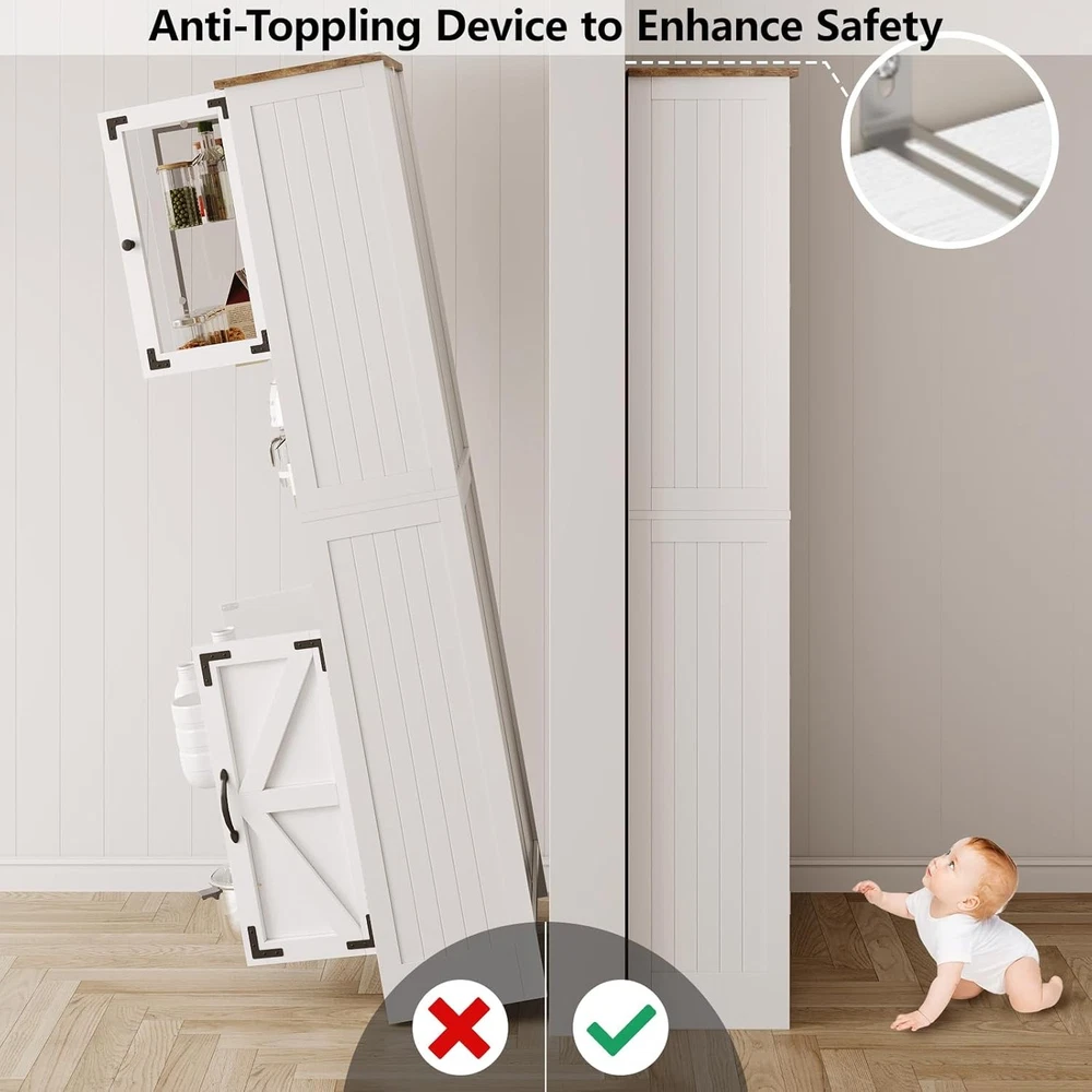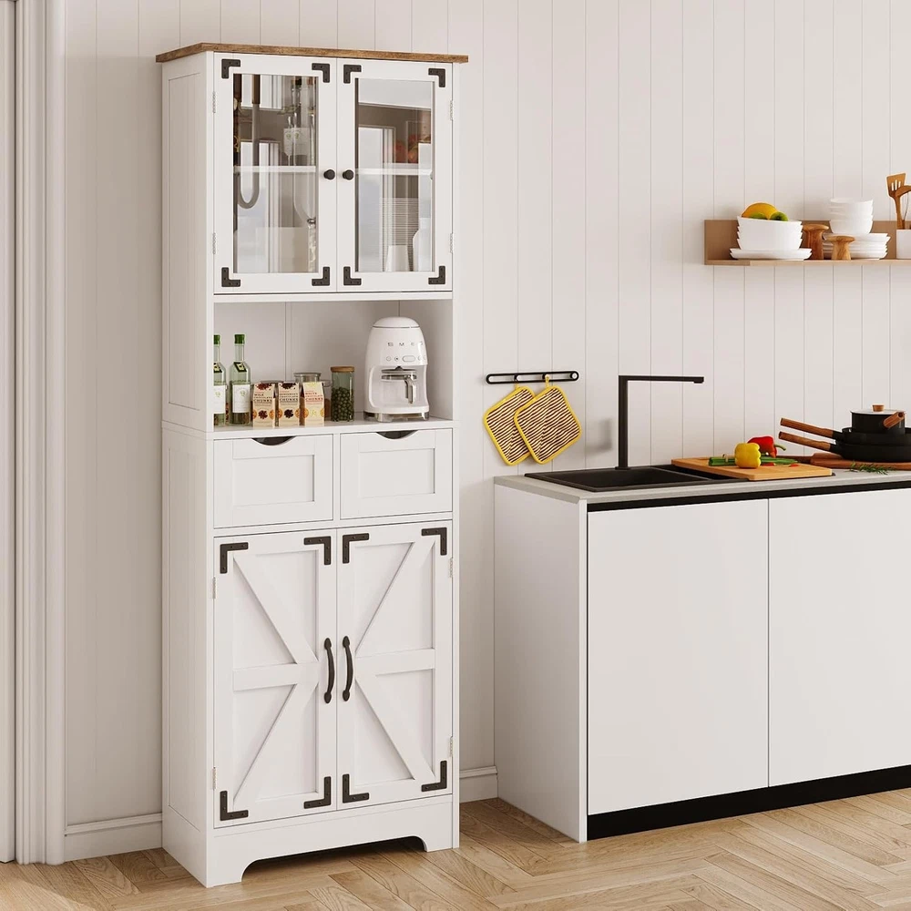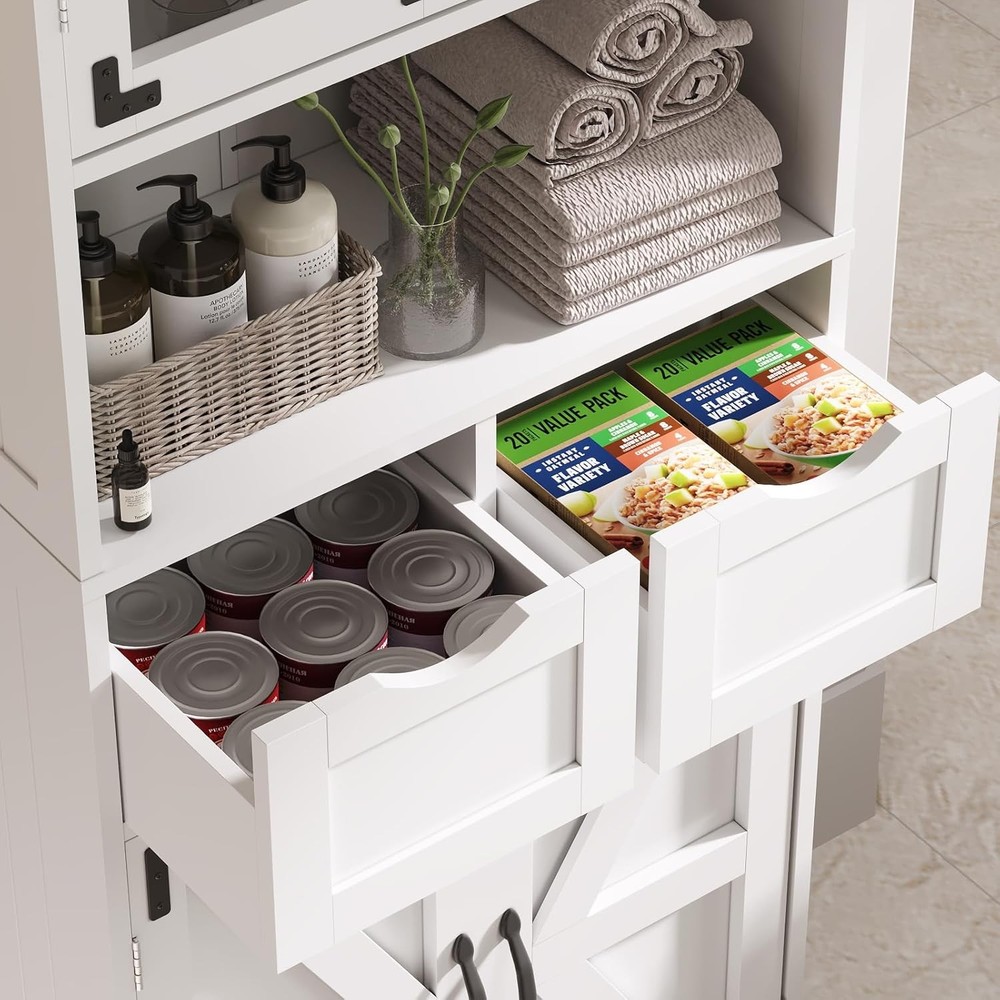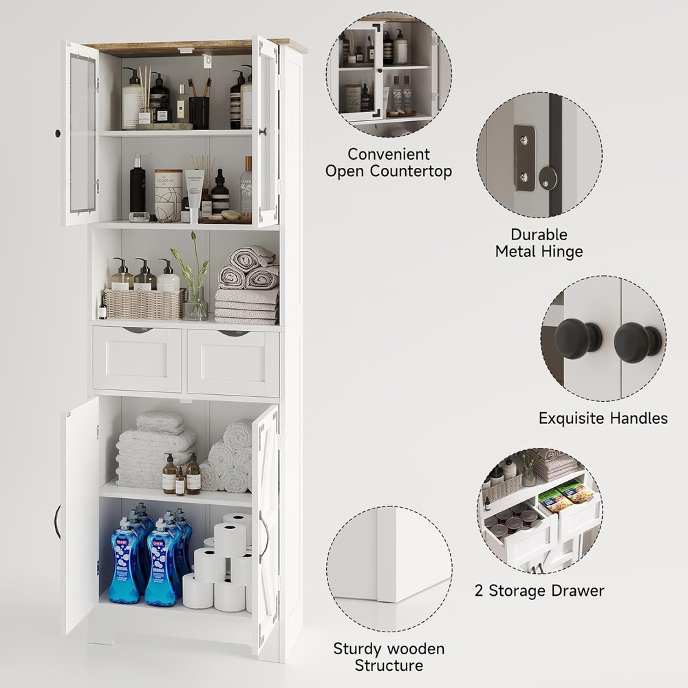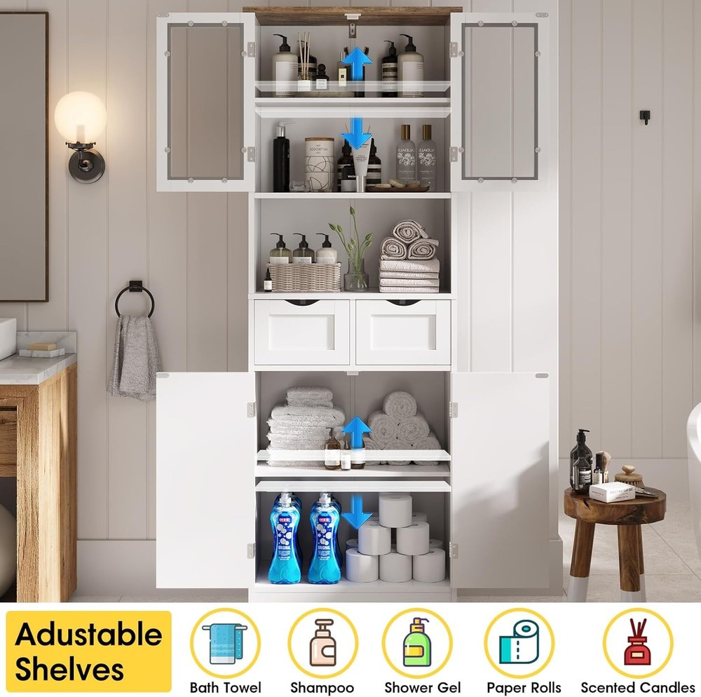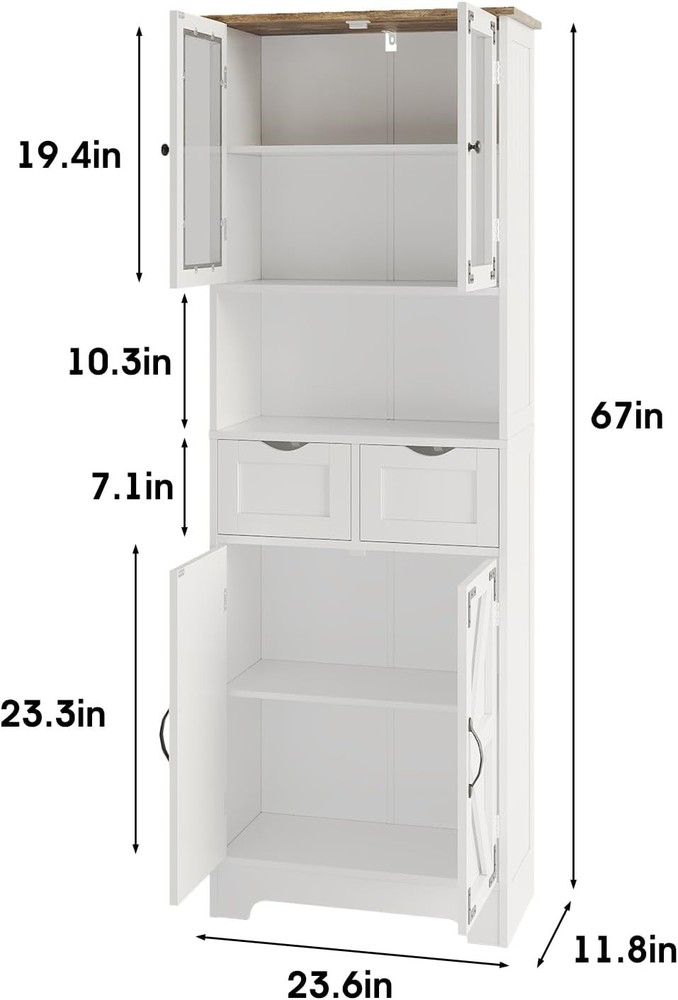 67" Tall Bathroom Storage Cabinet, Freestanding Linen Bathroom Cabinet with Glass Doors, 2 Drawer & Adjustable Shelves for Living Room, Kitchen, Dining Room, White Product Description About this item Quality Material: This linen storage cabinet is crafted from durable, recyclable P2 MDF that offers robustness and longevity. With its lightweight structure, the freestanding cabinet can easily be relocated according to your changing needs and preferences.The solid foundation is extremely stable and capable of supporting heavy loads. Please remember to install the anti-tilting tool on the wall for better stability and less unexpected injuries. Multi-Purpose Storage Cabinet: This versatile storage cabinet has a wide range of usage scenarios. It can be used to store surplus cans and food in the kitchen, with the drawer being perfect for small items such as spices. In the bathroom, it can be used to store shower gel, soap, and toilet paper. In the living room, it can be used to store CDs, books, and ornaments. With safety-tested mounting hardware and base board ensuring structural integrity, this tall pantry holds up to 330 lbs. Large Storage Space: This tall bathroom storage cabinet offers fourcabinets with doors, two drawers, and a convenient open countertop to accommodate a variety of living needs. The two enclosed storage cabinets with adjustable interior shelves provide ample space for towels and bathing essentials. The two drawers are perfect for storing toothpaste and other personal items. Moreover, the smartly designed middle open countertop ensures convenience, keeping all your items neatly organized. Farmhouse Style: With an elegantly sleek white finish design accented by black metal hardware, our tall pantry cabinet seamlessly combines modern rustic style with vintage farmhouse charm. Whether your home is contemporary or Farmhouse -inspired, this kitchen pantry storage cabinet will complement your aesthetic preferences and highlight your impeccable taste. Storage Cabinet Overall size: 11.8"D x 23.6"W x 66.9"H. Easy Assembly: The bathroom cabinets freestanding comes in a box containing all the parts, clear instructions, and necessary tools. All accessories are clearly marked with labels, you can easily set up this white standing cupboard step-by-step with the illustrated instructions. If you have any questions, please don't hesitate to contact us, we always reply within 24 hours. Tall Bathroom Storage Cabinet This beautifully crafted bathroom cabinet, finished in clean, classic white, effortlessly complements any decor.Perfect for updating your bathroom, laundry room, living room, or office, this sleek storage cabinet adds a touch of elegance and style to your home. Bathroom Cabinet You can use it to store toiletries, towels, bath towels, toothbrushes, cosmetics, etc. Multi-Functional Storage Cabinet Featuring multiple shelves and a sleek, compact design, this storage cabinet is perfect for organizing toiletries, towels, and bathroom essentials. Keep your space clutter-free and add a touch of elegance with this must-have storage solution. Storage Cabinet with Doors and Shelves for Modern & Farmhouse Style 67" Tall Kitchen Pantry, An attractive addition to your kitchen! Product Details 2 Deep Drawer This 2 drawer is a great storage space for bathroom supplies such as toothbrushes, shampoo,aromatherapy and towels. Adjustable Shelf This shelf can be adjusted up. lt's convenient and flexible to use. Ample Storage Shelves Bathroom cabinets provide ample storage space to keep your bathroom organized. Glass Door Glass doors enrich the elegant look andaccents to complement any decor. Anti-Toppling Device The package includes an anti-tipping device thatcan fix the cabinet on the wall to avoid hiddendangers. Easy to Clean The smooth surface of the bathroom cabinet iseasy to wipe clean with a damp cloth.