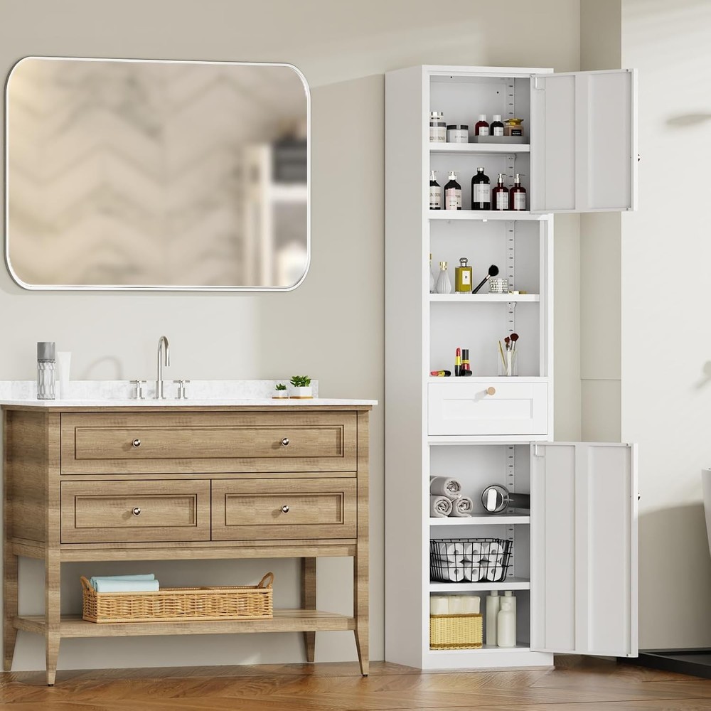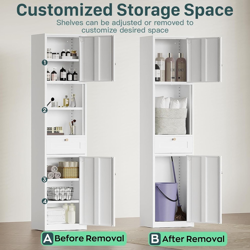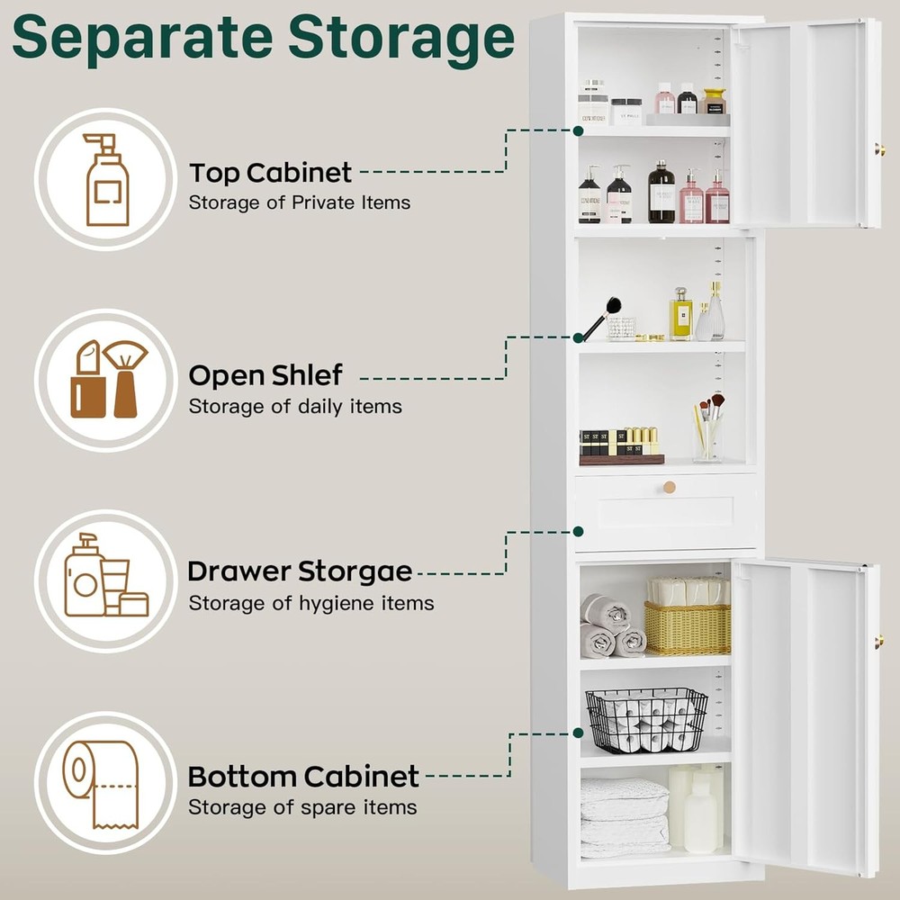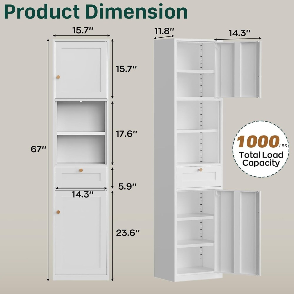 Product Description About this item Space Saving:Narrow bathroom storage cabinet Dimensions: 67"H x 15.7"W x 11.8"D. The vertically slim 15.7"W mordern storage cabinet is perfect for placement at the sink or toilet. 67"height provides plenty of vertical storage space, which not only utilizes upper space wisely but also takes up very little space, making it ideal for small areas in the bathroom or any other tight corners of the home. Multi-functional Storage:White tall bathroom cabinet has 2 closed storage cabinets and 2 open storage space and a drawer for a total of 7 tiers of storage, total weight capacity 1000 lbs.Optimal compartmentalization of cosmetics, cleaning supplies or kitchen pantry items. The pantry cabinet's 4 adjustable shelves allow you to customize the storage space to fit your storage needs, storing everything from tall bottles to towels. Separate closed drawer store toothbrushes and other cleaning items to keep it clean and sanitary. Unique Magnetic Door Design:With gold handles bathroom organizers and storage cabinet with built-in magnetic design of the door, not only can keep the item of the cabinet hygienic and neat, to isolate the air pollution; but also can keep the door closed at all times to protect privacy. The bathroom storage unit is ideal for shared bathrooms or homes with children/pets. Sturdy Material:Narrow storage bathroom cabinet are made of sturdy cold rolled steel construction with reinforced steel frames that not only securely hold heavy items, but also provide great stability and safety during use. Kitchen cabinet powder coated exterior is very easy to clean. Without smell metal storage cabinet is suitable for most homes to use with confidence. Easy Assembly & Customer Service:The narrow free standing storage cabinets is very easy to assemble, with all the parts in the package clearly numbered, easy to follow instructions, and an assembly video. Once assembled, you can easily organize everything in the space for a seamless transition from the bathroom to the kitchen, laundry room or entryway.We offer friendly customer service, if you have any questions, we will give you a satisfactory answer within 24 hours. Maximize your bathroom, kitchen, or laundry room with slim white metal cabinet.Features 4 adjustable shelves & drawer for customizable organization.Magnetic door secures items discreetly,while gold handles add elegance.Space-saving narrow design holds essentials vertically,perfect for tight corners. Bathroom narrow cabinet organization for every need.Top Cabinet: Secure private items out of sight.Open Shelf: Quick access to daily essentials like towels.Drawer Storage: Hide hygiene products neatly.Bottom Cabinet: Store spare supplies effortlessly. Tidy Hidden Storage : Narrow storage cabinet deep drawer keeps small items. No more cluttered counters. Flexible Space, Your Way : Adjust shelves to fit shampoo bottles or cleaning sprays. Custom layouts adapt as your needs change! Anti-Tipping Kit : Secure to walls on tall bathroom units. Strong Magnetic Door : Closes softly yet firmly. Premium Metal Handles : Gold finish adds refined style. Bathroom Storage Cabinet – Designed for Convenience