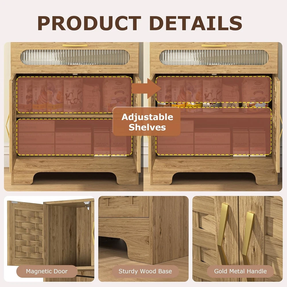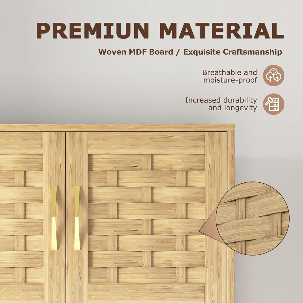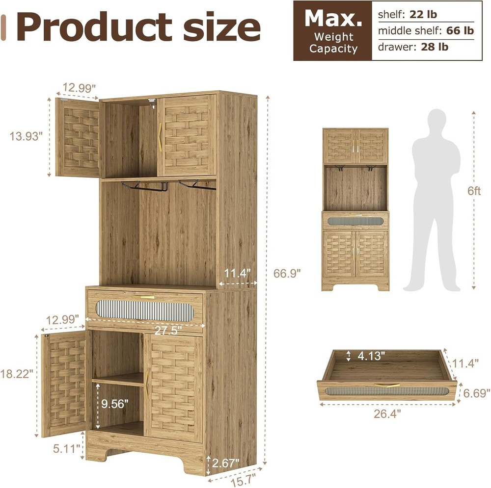 Product Description About this item 【Farmhouse Woven MDF Storage Cabinet】 Our storage cabinet comes with a farmhouse design, and it will easily fit in your kitchen or living room. The unique Woven MDF Door design with exquisite craftsmanship make this cabinet a perfect match for your house decoration. The woven MDF door and metal handles bring modern and classic for your living space and better integrate into the whole environment, which also makes it easy to assemble. 【Spacious Tall Kitchen Pantry Cabinet】 Our woven MDF kitchen storage cabinet with 4 Door Cabinet with interior adjustable height shelf,which can easily meet your different storage needs and also offers great convenience for you to store all kinds of daily necessities. 【Perfectly Size & Multipurpose Use】The accent cabinet with doors measure 15.7"D x 27.5"W x 66.9"H. Weight: 80 lbs. 2 tiers zoned storage and a spacious tabletop provide ample storage space, ideal as kitchen cabinets, entryway storage cabinets, office storage cabinets, sideboards, small buffet cabinet, floor cabinet 【Sturdy & Stable】: Made of premium MDF and solid wood leg base for sturdiness and stability, the floor cabinet is study and stable which can hold lots of items and last for a long time, equipped with anti-toppling fitting to protect the safety of you and your family 【Easy Assembly】Comes with all necessary hardwares and an detailed instruction manual to help quick and effortless setup. If you have any issues, please let us know, we will give solution within 24 hours. On Aug 14, 2025 at 22:39:27 PDT, seller added the following information: