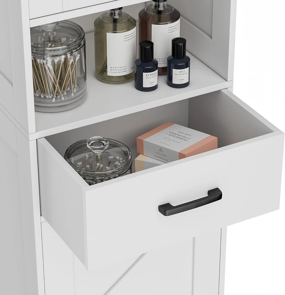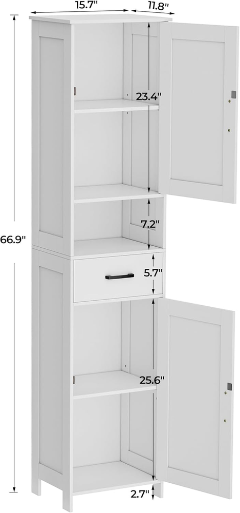 67" H Tall Bathroom Storage Cabinet with 2 Barn Doors and 1 Drawer, Narrow Storage Unit, Adjustable Shelves, Floor Cabinet for Bathroom, Living Room, Entryway, Kitchen, White, (15.7" W) Multi-functional Storage: The bathroom tall cabinet features two doors and one Drawer , offering versatile storage options. You can organize and store towels, toiletries, kitchen utensils, and more, keeping your living space tidy and organized Reversible Door Opening: The cabinet's doors can be easily reversed to open from the left or right, allowing you to choose the door opening direction based on your specific layout and space requirements, catering to different usage needs. Adjustable Shelves: The cabinet's interior shelves are adjustable to accommodate items of different heights and sizes. Whether you have tall items or various-sized items, you can easily arrange them in the tall cabinet to meet your personalized storage needs. Multi-purpose: This cabinet is designed to be slim and vertical, occupying minimal space. Measuring just 11.8"D x 15.7"W x 66.9"H, it is suitable for placement in small spaces such as bathrooms,kitchens,study providing additional storage space and enhancing the cleanliness and orderliness of your living space, maximizing space utilization. Sturdy and Safe: Thanks to quality particleboard and the waterproof feet, this bathroom storage cabinet promises a long service life; the included anti-tip kit enhances its stability and gives you a safer living space. Product Description Color White Material MDF (Medium Density Fiberboard) Product Size 11.8”D x 15.7”W x 66.9"H (30 x 40 x 170 cm) Product Weight 37.4 lb (17 kg) Max Load Capacity of Shelf 44 lb (20 kg) More Choices Add to Cart Add to Cart Add to Cart Customer Reviews 4.4 out of 5 stars 366 4.1 out of 5 stars 224 4.6 out of 5 stars 6 4.1 out of 5 stars 224 3.8 out of 5 stars 11 4.5 out of 5 stars 91 Price $97.99 $ 97 . 99 $35.99 $ 35 . 99 — — $49.99 $ 49 . 99 $105.99 $ 105 . 99 Size 11.8"D x 15.7"W x 66.9"H 7.9"D x 7.1"W x 31"H 11.8"D x 15.7"W x 35.4"H 15.7"D x 7.9"W x 31"H 7.9"D x 14.6"W x 31"H 7.8"D x 30.7"W x 65.4"H Style Farmhouse Modern Farmhouse Modern Modern Farmhouse With Drawers ✔ ✘ ✔ ✘ ✘ ✘ Adjustable Shelf ✔ ✘ ✔ ✘ ✘ ✘ Assembly Required ✔ ✔ ✔ ✔ ✔ ✔ Item model number SC17W Top Material Type Engineered Wood Number of Pieces 1 Room Type Entryway, Kitchen, Bathroom, Living Room Is Customizable No Assembly Required Yes Number of Doors 2 Number of Drawers 1 Material Engineered Wood Style Modern Handle Material Metal Installation Type Freestanding Frame Material Engineered Wood Finish Type Painted Included Components Accessory Kit Door Style Slab Item Weight 37.4 pounds Number of Shelves 2 Special Feature Adjustable Shelf Number of Levels 2 Mounting Type Floor Mount Color White Shape Rectangular Base Type Legs Back Material Type Engineered Wood Recommended Uses For Product Bathroom, Living Room, Entryway, Kitchen Product Dimensions 11.8"D x 15.7"W x 66.9"H Size 11.8"D x 15.7"W x 66.9"H Shipping Fast shipping is very important for us. Our standard US shipping service is FREE. Your order will be shipped within 2-3 business days upon full payment received. Your order will be delivered within 2-3 business days after the handling time. We only ship to the confirmed PayPal address. We reserve the right to cancel any order for any reason at any time. We are not responsible for undeliverable addresses. Returns and payment We offer a 30 days return policy from checkout winning date. We allow only PayPal as payment method FeedBack Your feedback very important to us, after you get your package and you are satisfied with our service please leave us positive feedback If you have any problem with your order / any questions please before leave any type of feedback For any questions, using eBay contact system Please visit our eBay store to check out other items for sale! Thank you for shopping at our store.