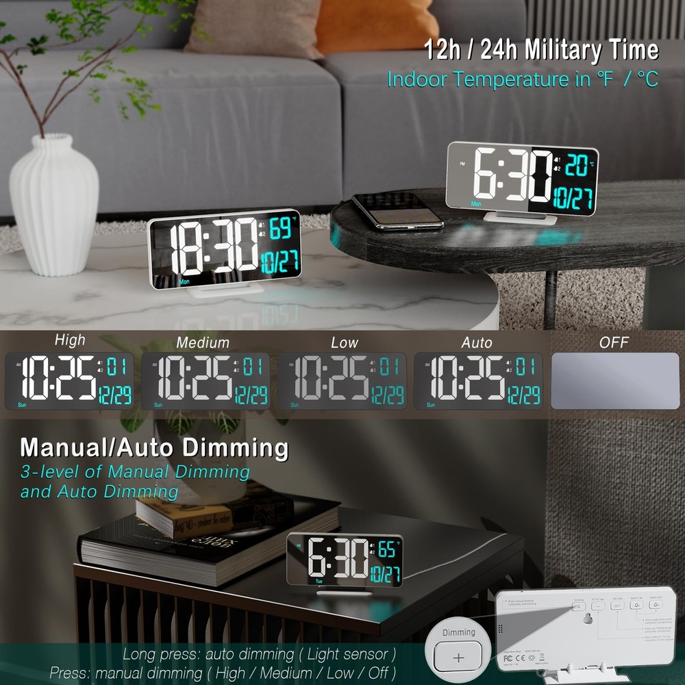 Digital LED Clocks for Bedrooms 6.7in White Alarm Clock, Dimming, 12/24h, Date, Day of Week, Temp, White Desk Clock, LED Clock for Bedside, Digital Calendar Clocks for Living Room Essentials [6.7in White Alarm Clock] This stylish LED desk clock features 6.7-inch display of mirror clock style, dual alarms, 12/24-hour format, date, day of week, seconds, temperature (℉ / ℃), and auto/manual dimming, it is also a aesthetic digital calendar and cute alarm clock for bedroom with white and sky blue numbers. Additionally, the bright white and sky blue digits make the desk clock cool and easy-to-read. [Auto/Manual Dimming] The white digital clock features auto dimming (via light sensor) and manual dimming (low, medium, high, or LED display off), which adds a convenient and customizable element to the LED clock. [Dual Alarm Clock with Snooze] You can set two alarm times for the small alarm clock, each with 3 different alarm cycles, for workdays, weekends and every day as options. This desk clock also includes snooze function(with 5 mins alarm duration and 5 mins snooze time). [Clocks with Time/Seconds/Date/Week/Temp] This modern bedside clock features multi-functional display that includes the time, seconds, date, day of week and indoor temperature. This alarm clock not only serves as a table decor LED clock but also as a cool digital calendar. Additionally, you can set separate alarms for your workdays, weekends, and every day. [Plug-in USB-A Power Supply] This alarm clock requires a 5V/1A AC adapter (not included) to operate. It comes with a button battery, which is only used to preserve the time during power outages and is not meant to be used as a continuous power supply. [Customer Services] We offer a 2 years warranty on our product. If you encounter any quality or usage-related problems, please don’t hesitate to contact us via email. We will promptly assist you in solving the issue.