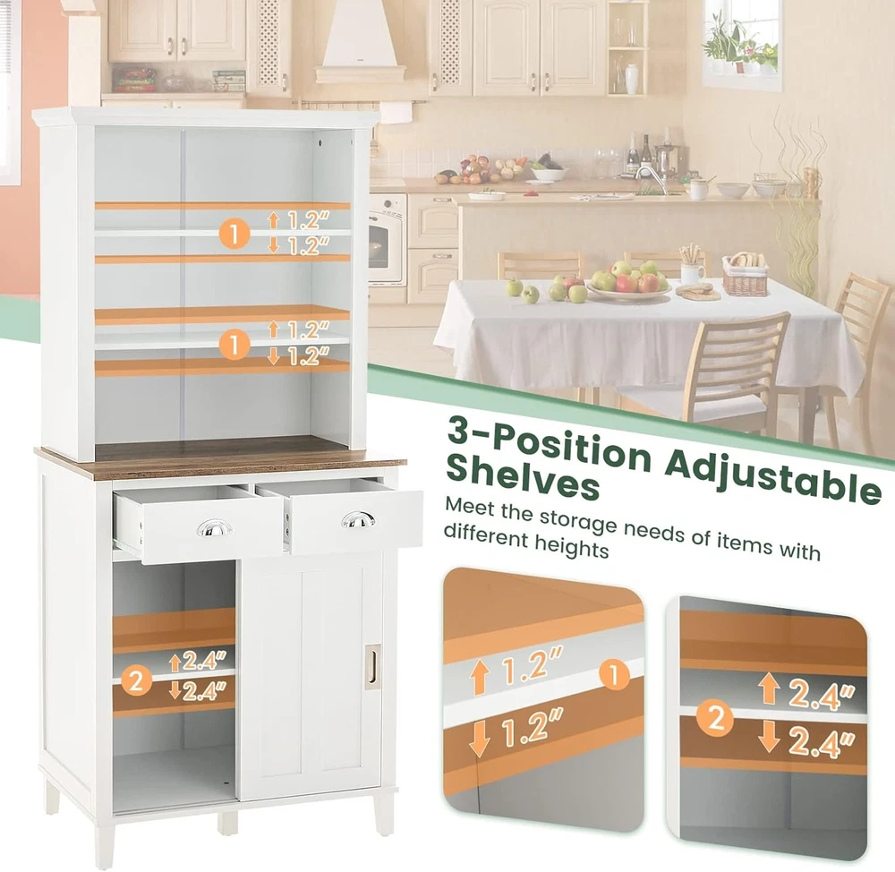 Product Description About this item [A Mixed Wonder]: This kitchen hutch is chiefly constructed of three kinds of materials, which are P2 MDF, particle board and pine wood. Attempting to make good use of the characteristics of different boards, we’ve combined them in single furniture that is the protagonist we are talking about. With the support of the five pine wood legs that equipped with anti-skid foot pads, the kitchen storage cabinet would stand firmly in some corner of your room while bringing extra storage to you. [Alterable Yet Sufficient Storage Space]: One major factor that will be taken into consideration is about if we will obtain enough storage space for better storing the kitchen or dining stuffs in an orderly way. You could just feel relieved that our hutch cabinet would offer you with flexible storage space since all the shelves could be adjusted for items that varied in sizes. Furthermore, you could freely store items whether on the flat open shelves, on the spacious countertop, in the two large drawers or in the cabinet with sliding doors. [Grow Only in Height]: As compact as you’ve imagined that measured 67 inches in height, this dining room hutch would stand obediently in a limited corner with the help of anti-toppling device on the back while vertically making full use of the space to sort miscellaneous kitchen or dining stuffs well. If you happen to get limited space in the kitchen or dining room, this buffet with hutch that measured 30 inches in length and 19 inches in depth would just fit perfectly. [A Caring Assembly Reminder]: We have to admit that the assembly of this huge friend is not something easy since you will get two packages shipped to you, and please make sure that all parts are there before you start to assemble this kitchen hutch storage cabinet. But you don’t need to be overly worried that all the parts are numbered clearly. And with an easy-to-read illustrated instruction, the assembly won’t be invincible since you got us standing behind you. [What You Will Get]: What you will get is not only a kitchen hutch cabinet, but also premium customer service from US. For one thing, we focus on bringing practical yet economical storage solutions to every home in the sole aim to get rid of clutters in order to make you live cozily, for another, we value your attitudes towards our products and customer service that we will work extremely hard to make you satisfied with branded product. Actions speak louder than words!