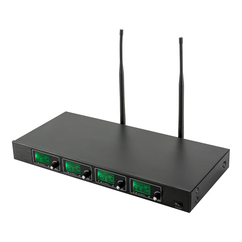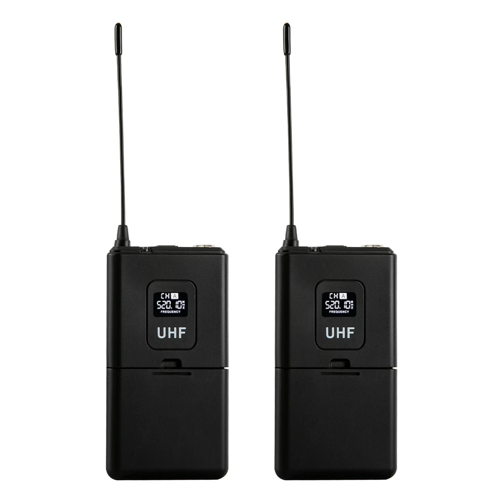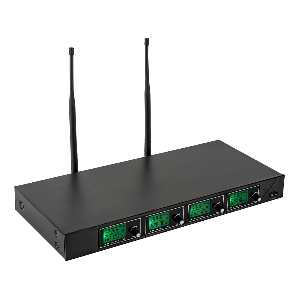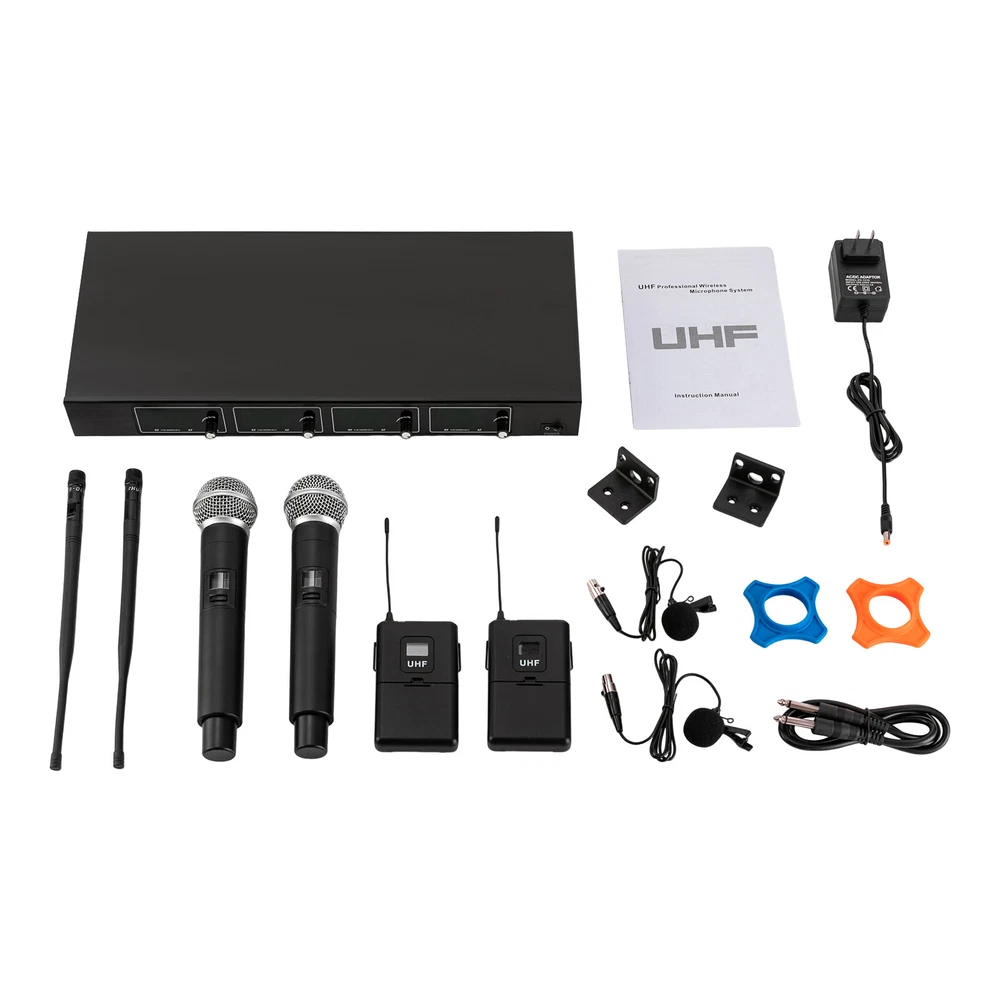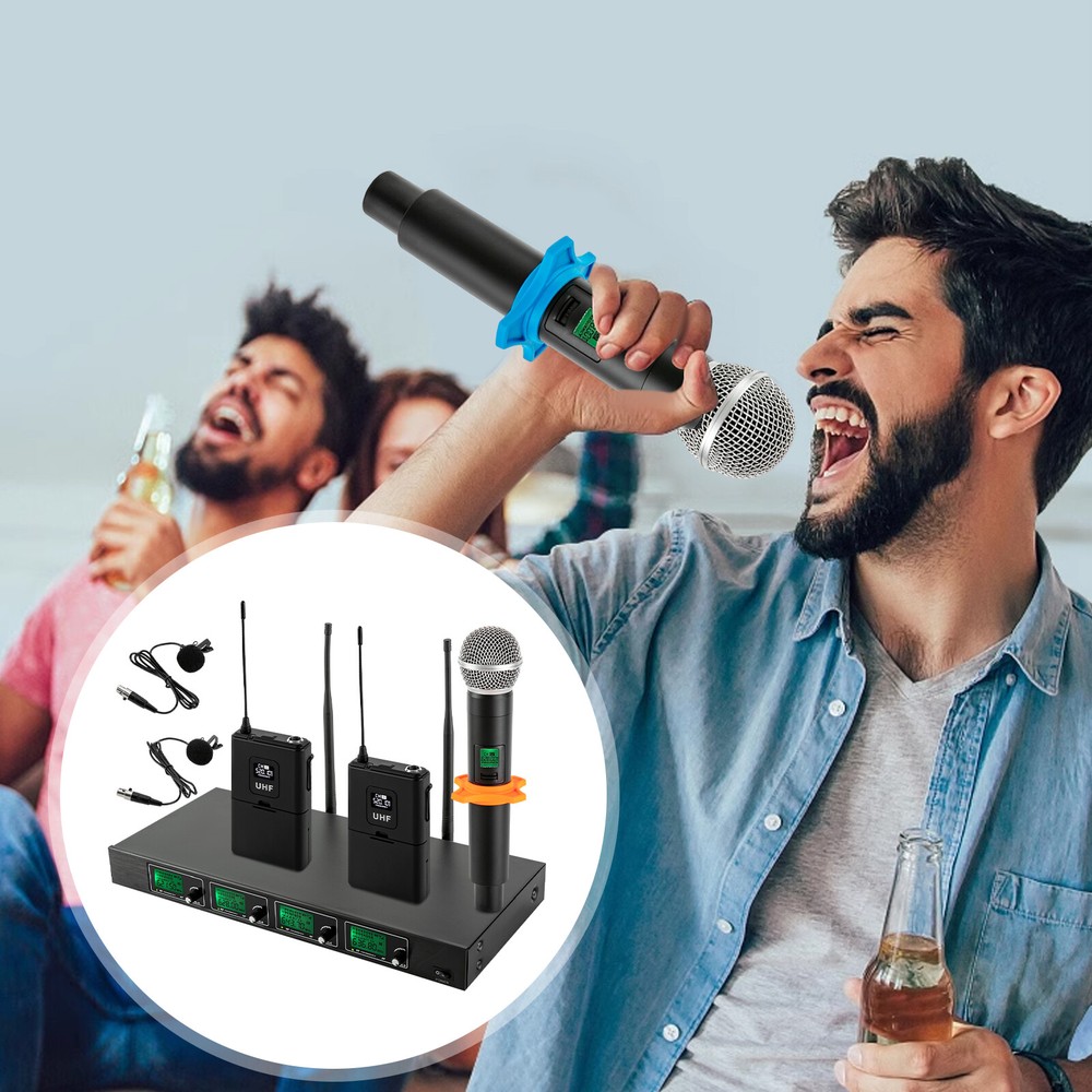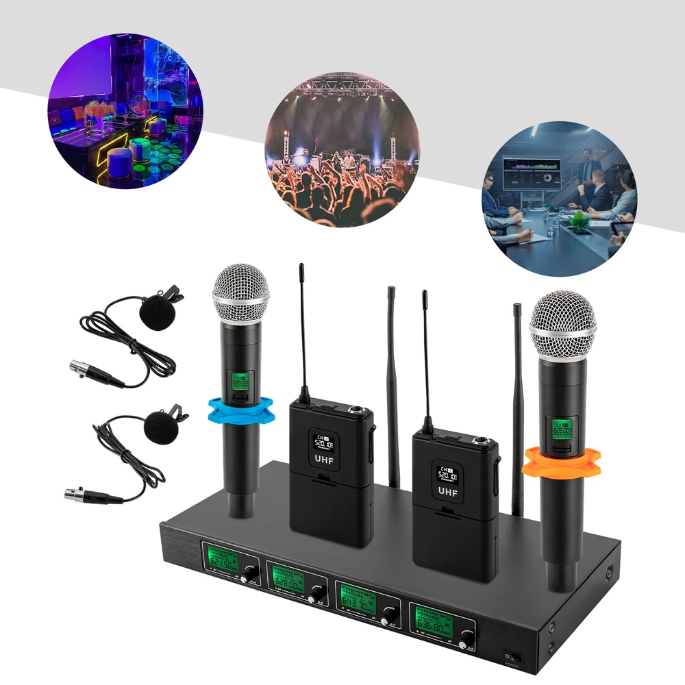 Specifications Style: Modern Receiver Shape: Rectangular Color: Black Material: Semi-metal Surface Treatment: Spray Painting Voltage: 12V Power: 10W Frequency: 610-670mHz Plug Standard: US Standard Power Source: Corded/Battery Powered Battery Duration: 6-8 H Control Type: Manual Assembly Required: Yes Number of Microphones: 4 (Two Handheld Mics and Two Lapel Mics) Number of Channels: 4 Receive Distance: 50m/164.04ft Wireless Pattern: 1/4 Wavelength Whip Antenna (Bodypack), Helical Antenna (Handheld Mic) Audio Output: Real Balanced RF Output: 12dB Output Power: 30mW(High Power), 3mW(Low Power) Max Output Level: +10dBV Stray Rejection: >75dB Sensitivity Range: 12-32dBμV Sensitivity: 12dBμV(80DbS/N) Gross Weight: 4kg/8.81 lbs Net Weight: 3kg/6.61 lbs ✨✨✨ Welcome to my store! Have a nice day~ ✨✨✨ Description This wireless microphone system is ideal for achieving the ideal sound for you. Its lightweight design and wireless connectivity make it practical for a variety of events and occasions. Using advanced wireless technology, the wireless microphone provides stable sound transmission and high-quality sound to ensure that performances such as speeches, hosting, recording, and singing are optimized. If you are looking for a high-quality wireless microphone, we are your ideal choice. Key Features Sturdy and Durable: The product is made of high-quality semi-metal material, using spray painting technology, with high strength, wear resistance , and long service life. Excellent Performance: UHF wireless signal audio transmission delivers outstanding performance with a working distance of up to 164.04ft, conveying clear, noise-free, distortion-free sound. Stable Signals: Fixed-frequency reception design can effectively avoid frequency breaks and crosstalk, while dual-antenna reception can transmit signals more accurately and stably, avoiding sound interruptions and channel blocking problems. The 4 channels can control the volume individually and work simultaneously without interference. Easy to Use: Complete accessories, clear and intuitive LED displays, volume control knobs, a fixed frequency, and a detailed English manual make it easy to use this product after switching on the machine. Wide Applicability: The receiver has four XLR outputs and a 1/4-inch audio out jack that can be connected to an amplifier, mixer, stereo, or other PA system that automatically pairs with the transmitter. Easy to Clean: The smooth surface and simple structure allow you to easily remove dust from the surface with a towel. Nice Gift: This practical and high-quality product is a great gift for friends and family or for those who love to sing. Protective Packaging: The sponge provides comprehensive protection for products to ensure that it is fully delivered to you to the greatest extent possible. Customer Service: We aim to provide high-quality products and services. If you have any questions, please feel free to contact us. We will reply as soon as possible and solve the problem for you. Details Ergonomic Grip : The microphone grip fits well into the curve of your hand and can keep you comfortable after long hours of use. Anti-slip Ring : It allows you to avoid worrying about accidentally dropping off the microphone during use, providing you with a better experience. Application This product is suitable for a variety of commercial and entertainment occasions, including conferences, broadcasts, live broadcasts, home entertainment, KTV, hotels, large parties, DJs, weddings, churches, stages, speeches, company annual meetings, and classes. Specifications Style: Modern Receiver Shape: Rectangular Color: Black Material: S emi-metal Surface Treatment: Spray Painting Voltage: 12V Power: 10W Frequency: 610-670mHz Plug Standard: US Standard Power Source: Corded/Battery Powered Battery Duration: 6-8 H Control Type: Manual Assembly Required: Yes Number of Microphones : 4 (Two Handheld Mics and Two Lapel Mics) Number of Channels: 4 Receive Distance: 50m/164.04 ft Wireless Pattern: 1/4 Wavelength Whip Antenna ( Bodypack ), Helical Antenna (Handheld Mic) Audio Output: Real Balanced RF Output: 12dB Output Power: 30mW(High Power), 3mW(Low Power) Max Output Level: +10dBV Stray Rejection: >75dB S ensitivity Range: 12-32dBμV Sensitivity: 12dBμV(80DbS/N) Gross Weight: 4kg/8.81 lbs Net Weight: 3kg/6.61 lbs Package Size: 50*27*13cm/19.68*10.63*5.12in Receiver Size: 42*7.5*4.5cm/16.53*2.95*1.77 in Package Included 2* Handheld Mics 2* Lapel Mics 2* Bodypacks 1* Receiver 1* Power Charger 1* Connecting Cable 2* Brackets 2* Anti-slip Rings 1* English Manual Notes Please read the manual completely before installation and use, and pay particular attention to the safety instructions included. If there is no sound from the microphone, you need to reconnect it. Please avoid putting the main machine at a blind angle when it is used. This is for keeping signal receiving in good condition. It is noted that the overall sound effect depends on the stereo equipment. The better the equipment, the better the microphone. Please allow the slight color difference caused by the shooting light and 1-3cm error due to manual measurement, and make sure you do not mind before you order. Payment Delivery details Terms of sales About us Contact us Payment We accept ebay payment 。 Fees such as import duties, taxes are not included in the item price or shipping costs. These charges are the buyer's responsibility. Delivery details Shipping: 2-9 working days to: USA Terms of sales We maintain high standards of excellence and strive for hundred percent customer satisfaction. Feedback is very important to us. We hope that you contact us immediately before you give neutral or negative feedback, so that we can address your concerns. It is impossible to address issues if we do not know about them! About us Your satis faction is our ultimate goal. We work hard to earn your trust and future business. Our certified technicians have tested each item before shippin
