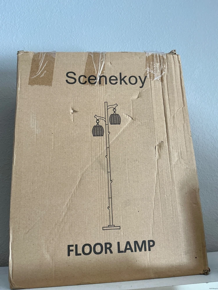 68'' ht Standing Floor Lamp, Tree Trunk Wood Finish Column, 6"x 6" Wicker Drum shade. Retail Packaging distressed. Item is new.Free shipping applies within the United States only. Orders to Alaska, Hawaii, Puerto Rico, Guam, Virgin Islands, and PO/FPO/APO boxes may require an additional fee. Listing and template services provided by inkFrog