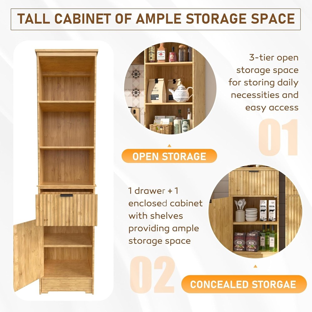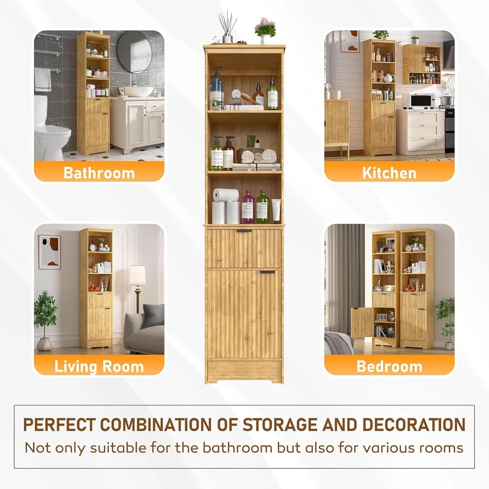Product Description About this item • Spacious Multi-Surface Storage: Store towels, toilet paper, and essentials effortlessly with three open shelves, one large drawer and one enclosed cabinet. The floor space of 15.74"W x 12"D maximizes space in bathrooms or kitchens while keeping items organized • Premium Bamboo Durability: Made from preminum bamboo, harder than wood, 30% lighter weight. This cabinet is not only durable but also eco-friendly. Its natural material is resistant to moisture, suitable for long-term use in the bathroom environment • Safety First Design: Wall-mounted anti-toppling system included (hardware pre-drilled) and rounded edges prevent injuries. This feature is especially crucial in homes with children or pets, offering peace of mind by preventing accidental toppling and enhancing overall safety • Versatile Use: This Bamboo Freestanding Storage Cabinet is a perfect choice for small place, providing extra storage. This Storage cabinet can also be used in the living room, kitchen, laundry room, dining room to help you organize personal belongings • Space Optimized Dimensions: Overall size: 15.74" W x 12" D x 68" H; Overall open shelves size: 14.4" W x 11.5" D x 35.4" H; Cabinet interior size:14.2" W x 11.4" D x18" H; Each shelfs load capacity: 44lbs