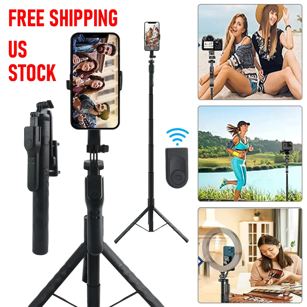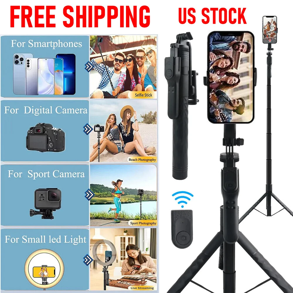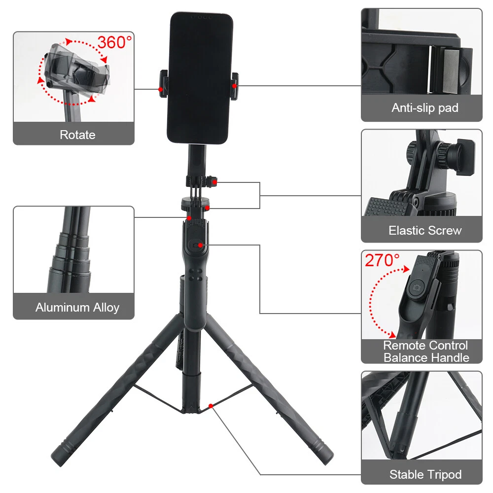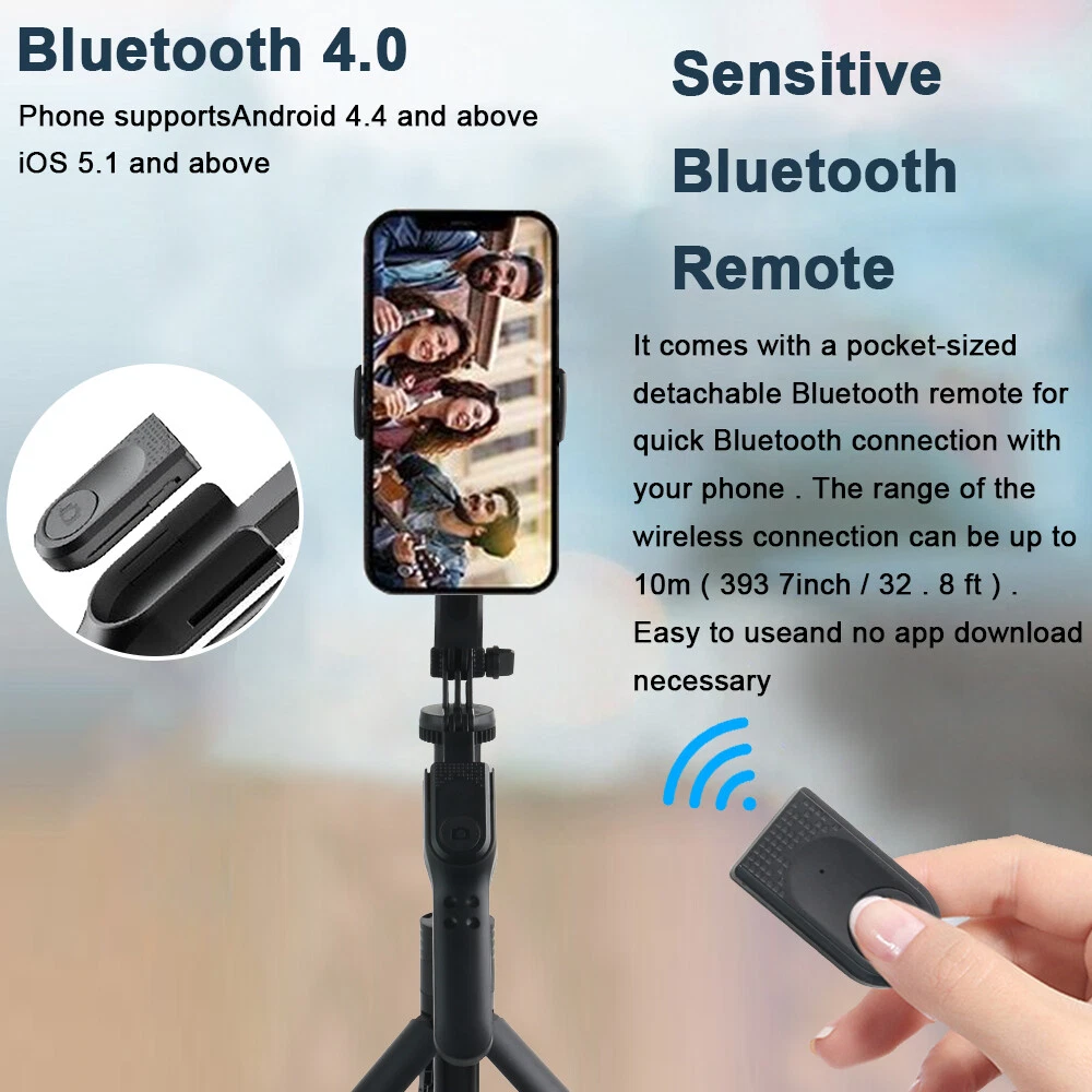 About this item 【With Phone Holder】The phone holder of the tripod can be rotated freely 360°, you can quickly rotate horizontally or vertically to shoot without taking off your phone. The size of the phone holder can be adjusted to a range of 2.56''~3.94''(6.5-10cm), suitable for 4-7 inch iOS&Android phones. Compatible with iPhone 14 Pro max/ iPhone 14 Pro/ iPhone 14/iPhone 13/13 Pro Max, iPhone 12/12 Pro/12 Pro Max, Samsung Galaxy S10/S9/S8, Huawei P40/P30/Mate 40/Mate 30, and more. 【with 1/4 screw】It is suitable for Optical Camera, digital camera, ring light, fill light, Small Photography Lights, zoom lights, phone, camera, webcam, Use with video lighting and photography accessories or as a webcam tripod for video conferencing, also works great as a tripod for light for YouTube or TikTok videos. 【Super Safe】Height Adjustable Extended from 32.5cm/12.8 inches to 175cm/ 68.9 inches, the height can be flexibly adjusted to fully meet the needs of various shooting heights. The tripod base is designed with an umbrella-shaped skeleton structure, which strengthens the load-bearing capacity and anti-slip ability. which the non-slip rubber feet can provide a firm grip and strong friction to make the tripod more stable, anti-twist and anti-shake. 【Durable & Portable】The tripod is made of aluminum alloy and ABS plastic, high quality and durable, sturdy and anti-corrosion. The minimum length of the tripod is only 32.5cm/12.8 inches, which you can easily fit it in a chest bag or handbag. This phone tripod with remote only weighs 0.66 lbs, this portable tripod is the perfect choice for outdooactivities such as traveling, hiking or camping. 【10M Wireless Remote】 Liberate your hands and enjoy taking pictures remotely with our selfie stick tripod with remote. It will keep stable up to 33ft/10m and is compatible with most smartphones such as Android and iPhone. SPECIFICATION: Material: Aluminum Alloy Battery Type: 110mAh CR1632 Stretchable Length: 175cm/ 68.9 inches, Fold Length: 32.5cm/12.8 inches Bluetooth Compatibility: iOS 5.1, Android 5.0 and above Work Mode: Phone Tripod Stand & Selfie Stick Maximum Load: 1KG Remote Control: 33ft Item Weight : 380g Package : 1 x Selfie Stick with Phone Holder 1 x Remote 1 x User Manual